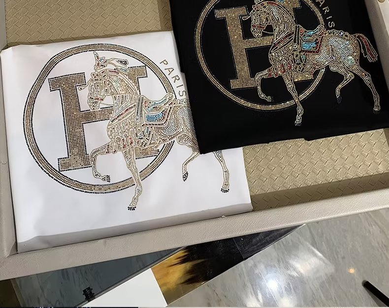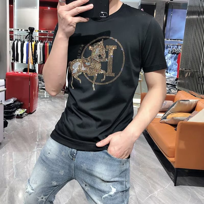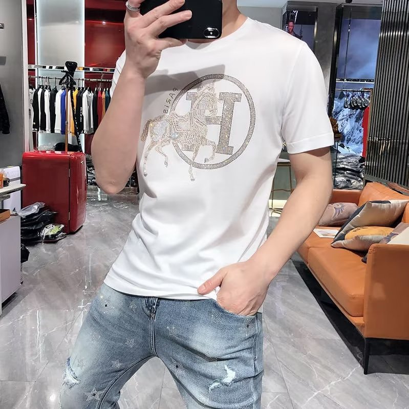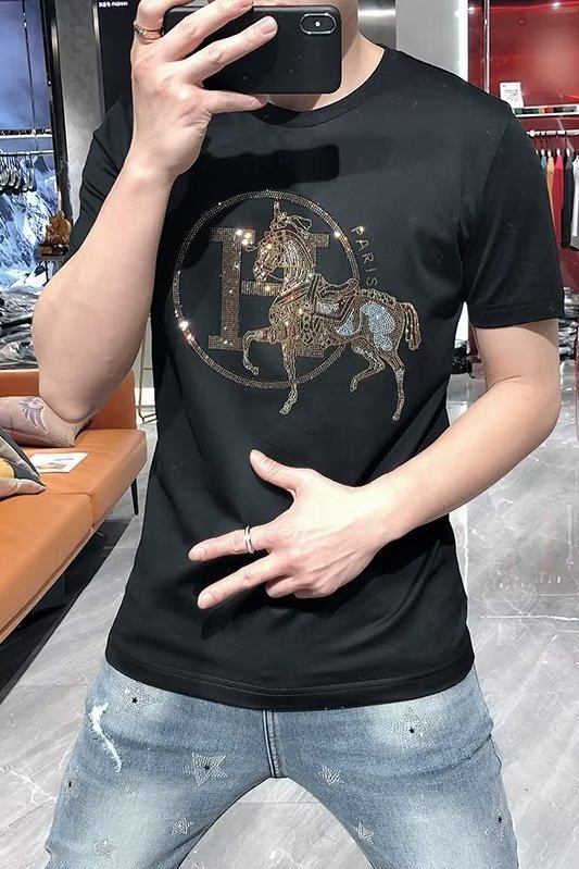 2024 여름 새로운 유럽 역 반팔 남성 티셔츠 핫 드릴링 골드 H 말 얇은 쿨 핫 드릴링 코튼 로우 키 럭셔리스토어 가기
