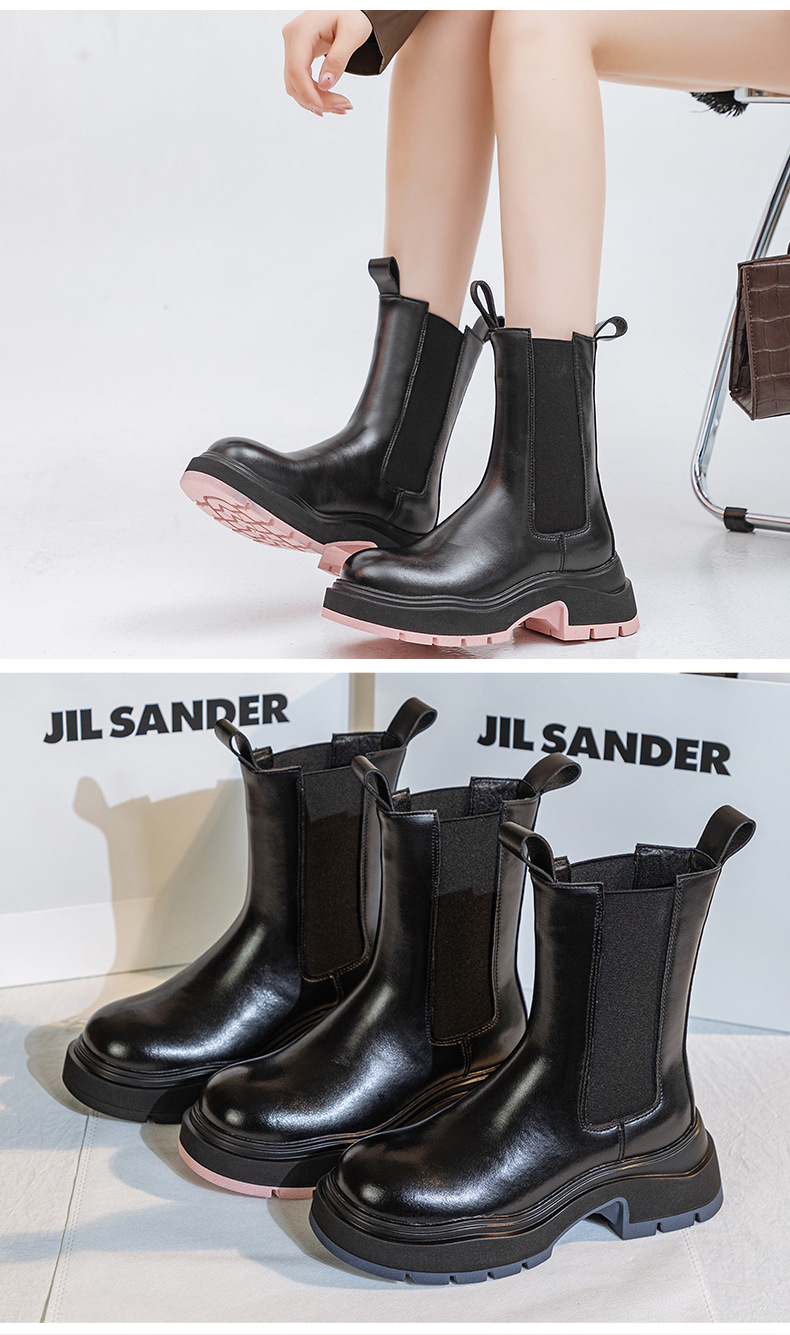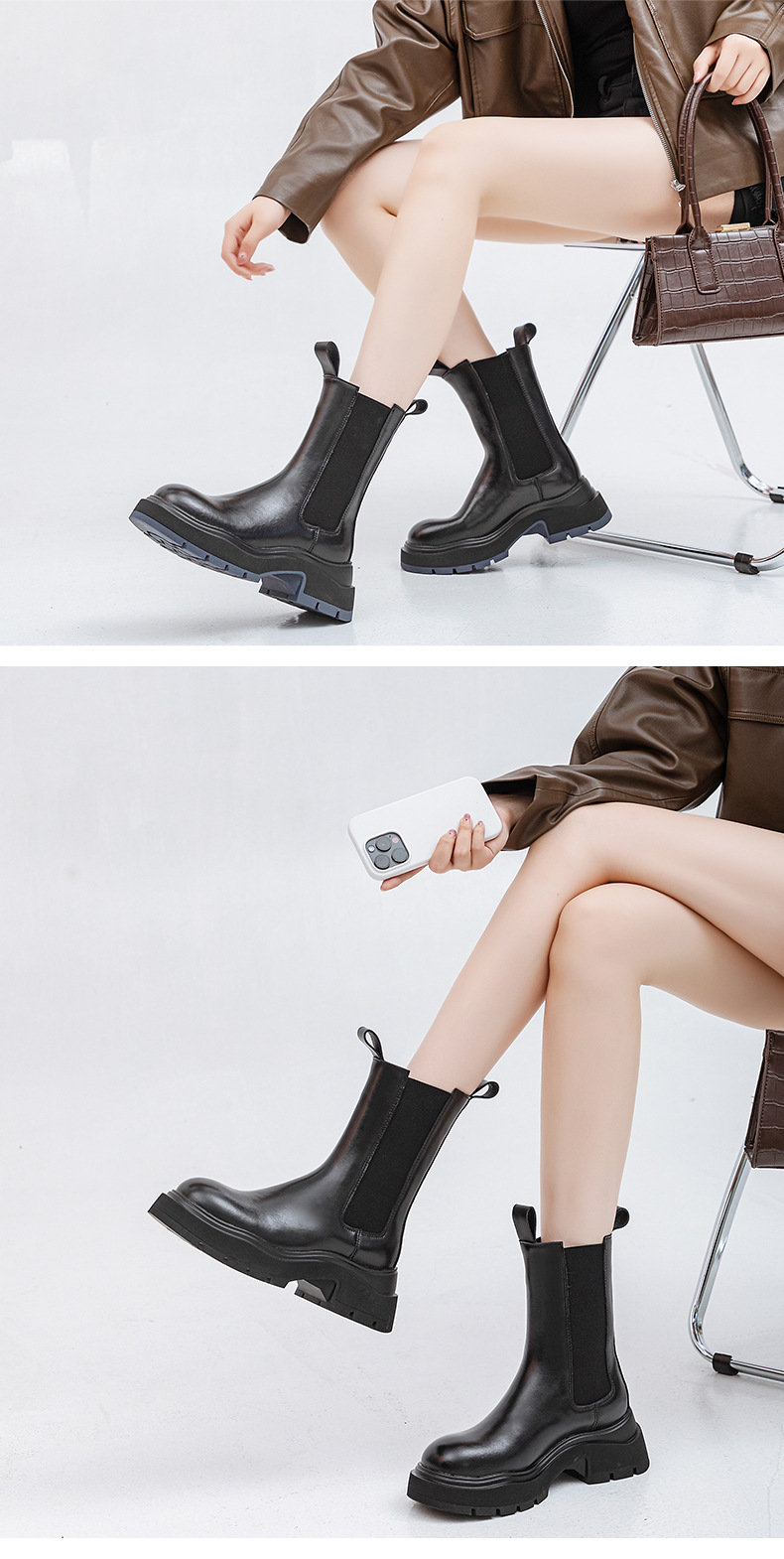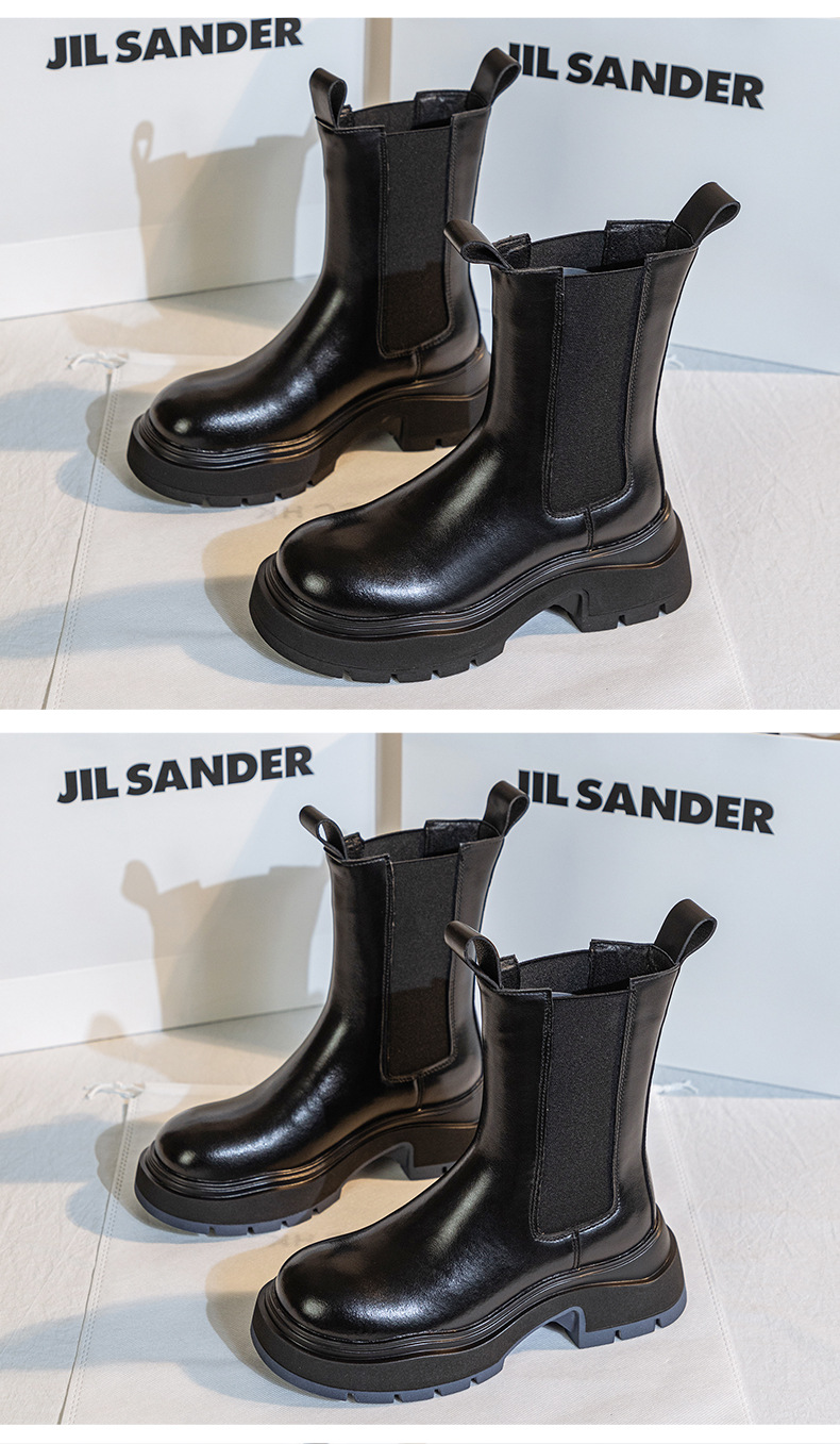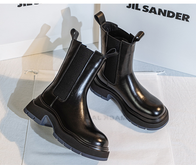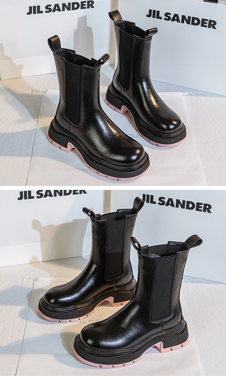 정품 가죽 두꺼운 밑창 증가 BV 마틴 부츠 가을, 겨울 새로운 라운드 발가락 블랙 부츠 여성을위한 유행과 편안한 굴뚝 부츠
