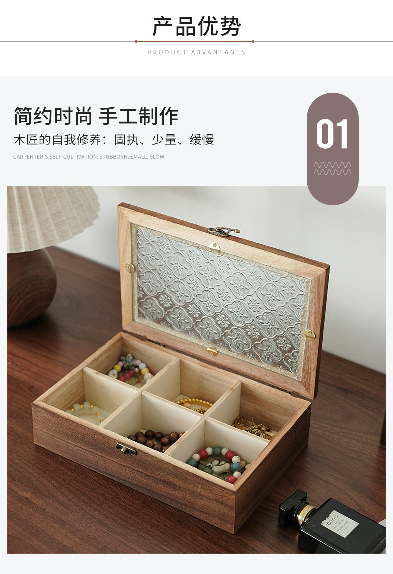 해바라기꽃 유리 보석함, 원목 보석함, 뚜껑형 칸막이 나무 상자, 레트로 데스크탑용 방진 보관함