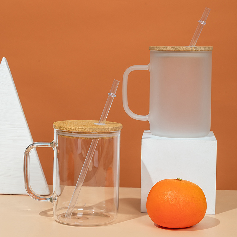 아마존 투명 머그잔 대나무 뚜껑 밀짚 손잡이 유리 컵 사무실 마시는 컵 500ml 프로스트 컵스토어 가기