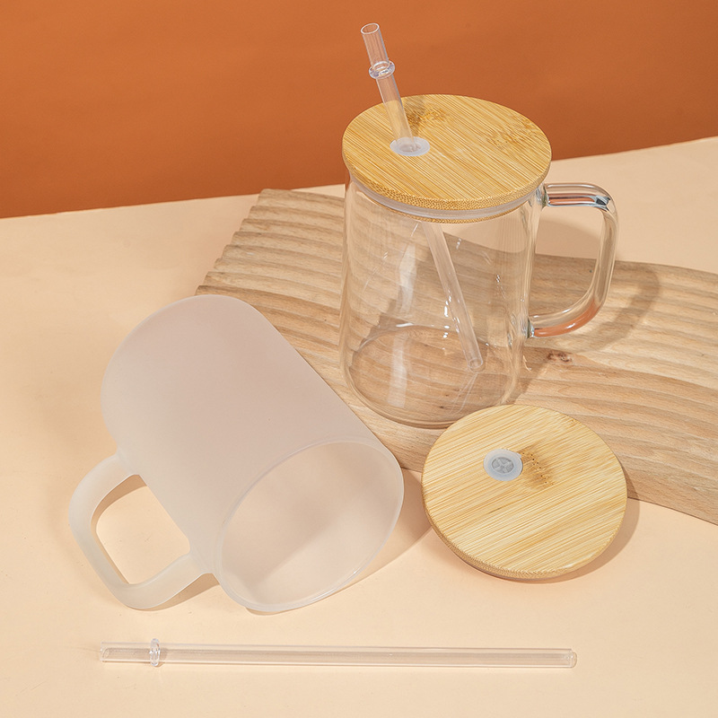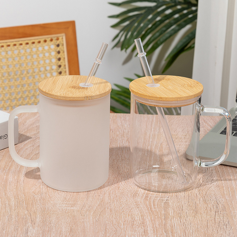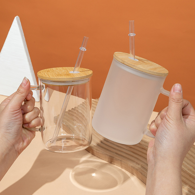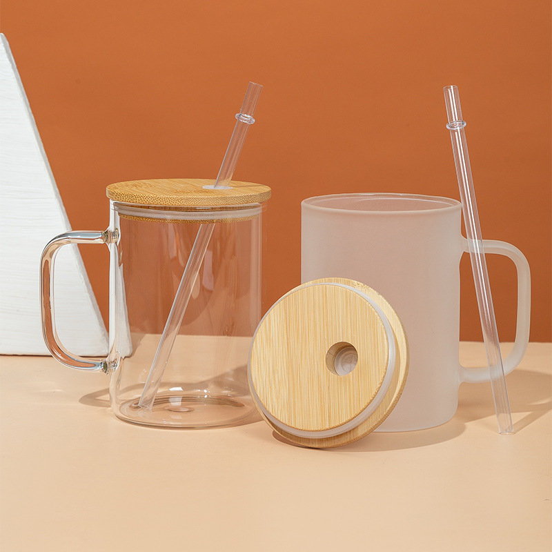 아마존 투명 머그잔 대나무 뚜껑 밀짚 손잡이 유리 컵 사무실 마시는 컵 500ml 프로스트 컵