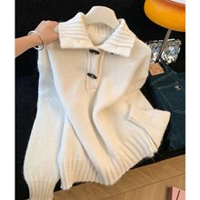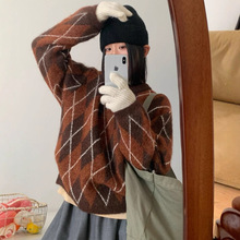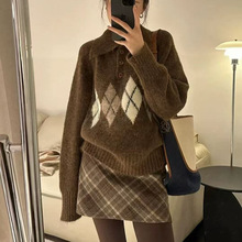 美拉德咖色菱格polo领毛衣女慵懒外穿早秋冬季宽松chic针织衫上衣