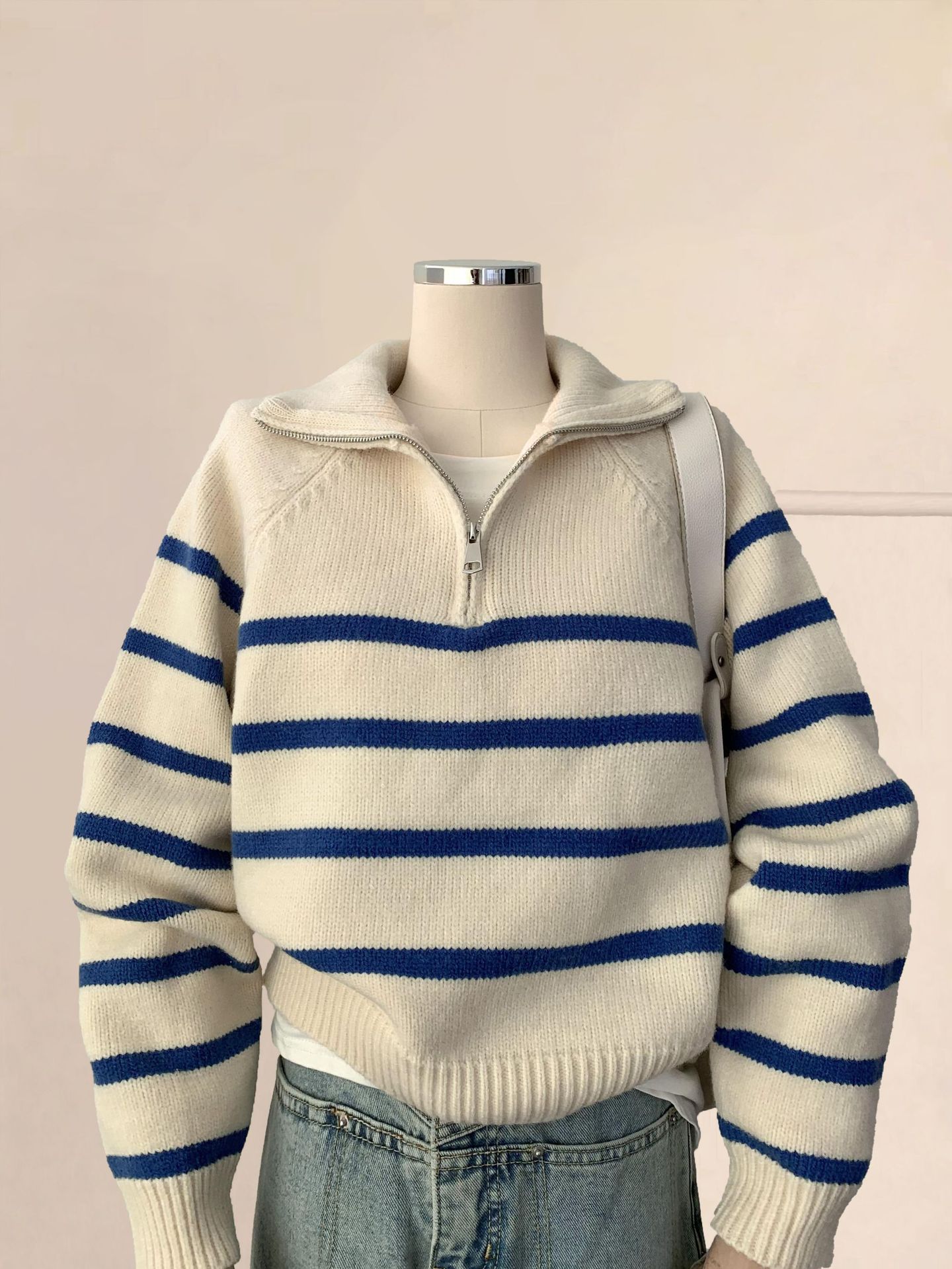 화이트 스트라이프 하프 지퍼 폴로 옷깃 스웨터 여성의 2024 겨울 소프트 왁스 니트 내베이스 셔츠 탑스토어 가기