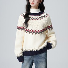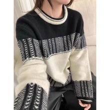 2025年秋冬新款圆领提花复古针织衫宽松横纹立体感拼色套头毛衣女