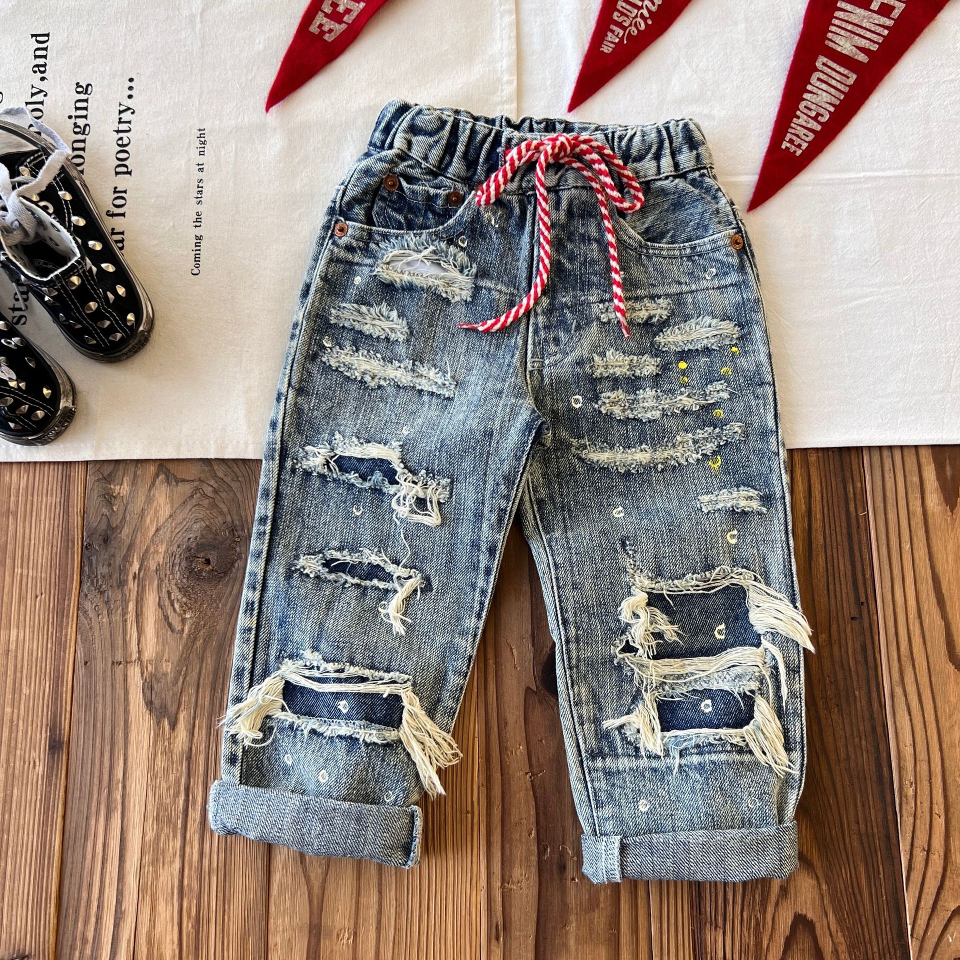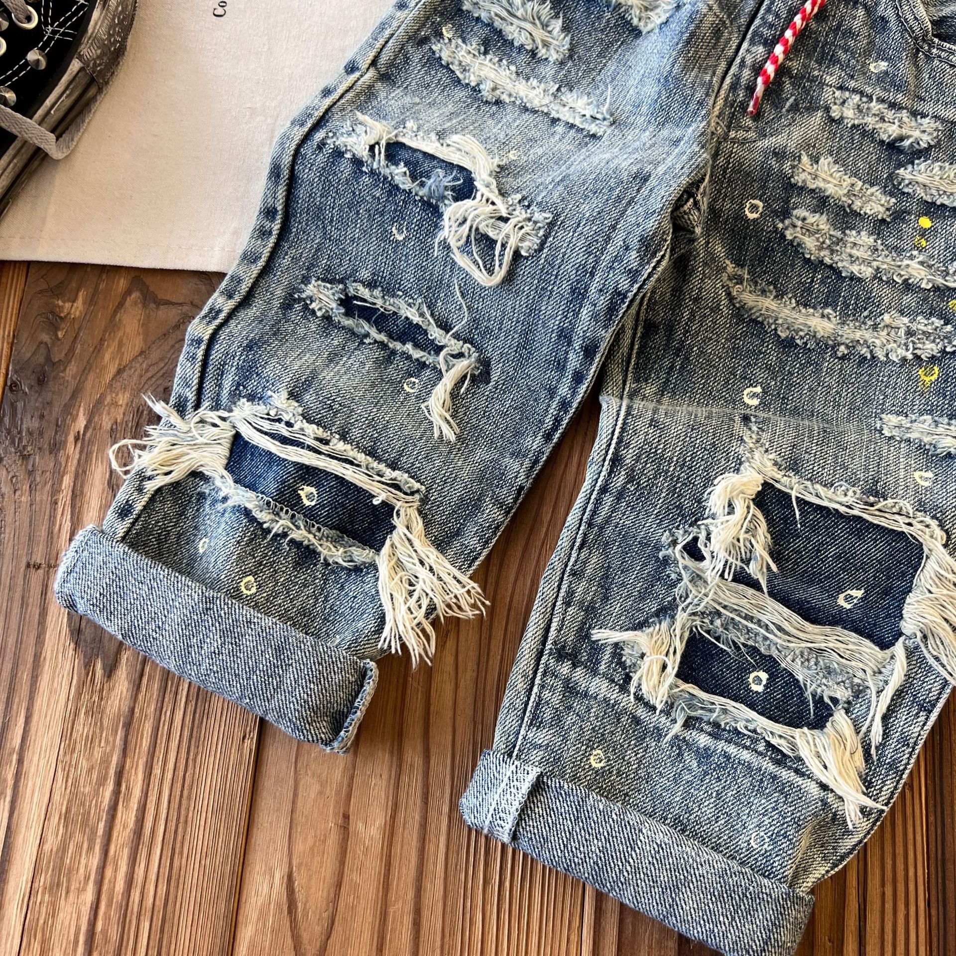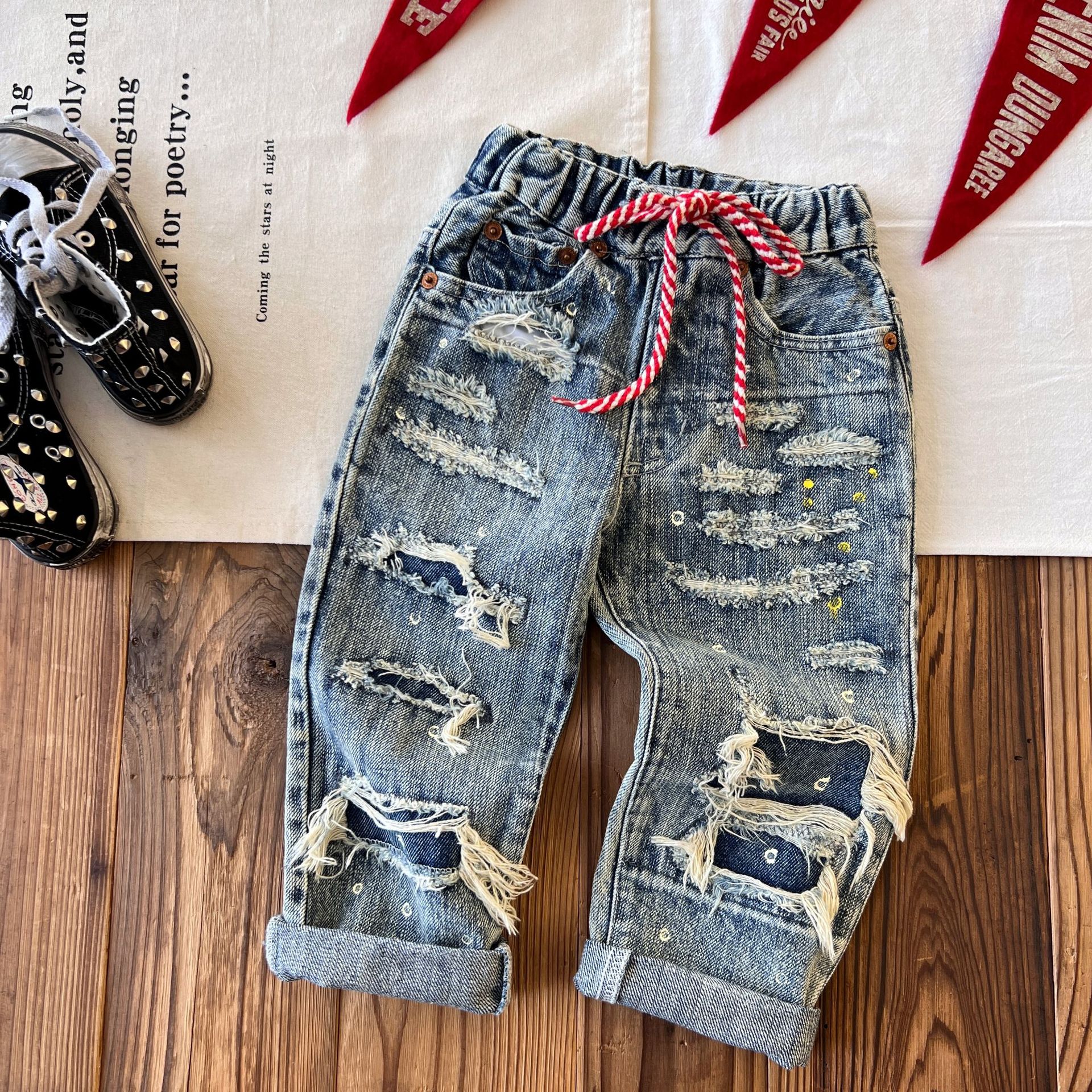 2024 일본 어린이 착용 중 고대 유행 브랜드 DD 어린이 오래된 찢어진 청바지