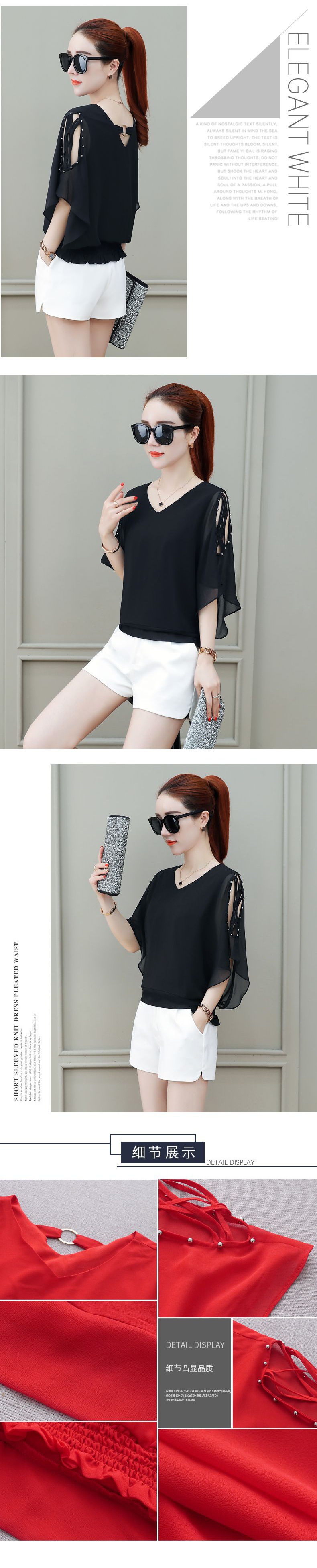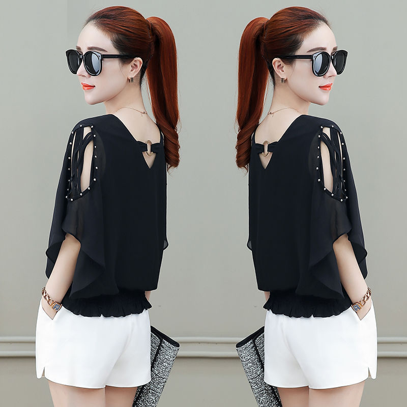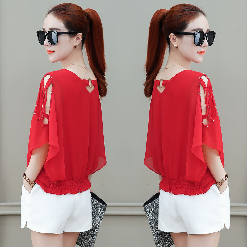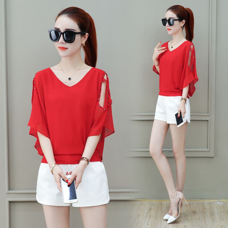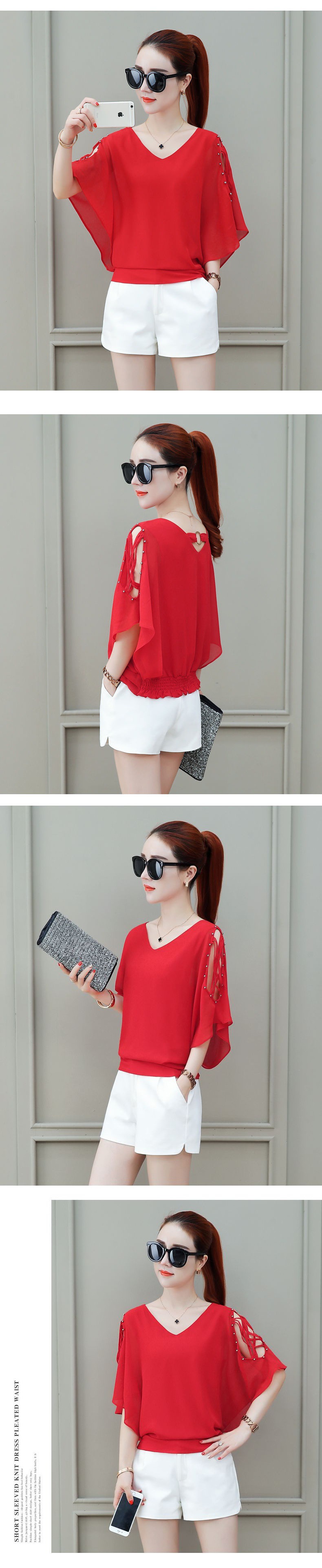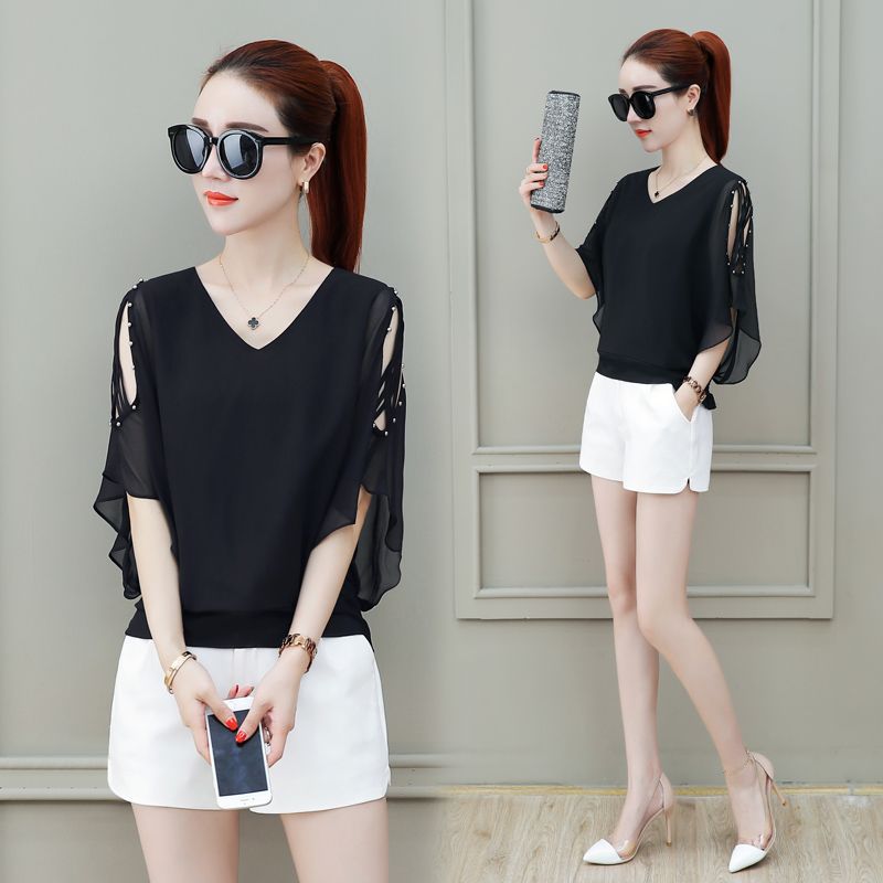 짧은 소매 쉬폰 셔츠 여성의 2022 새로운 패션 벨리 커버링 외국 스타일 작은 셔츠 더블 V-넥 박쥐 셔츠 여성용 셔츠스토어 가기