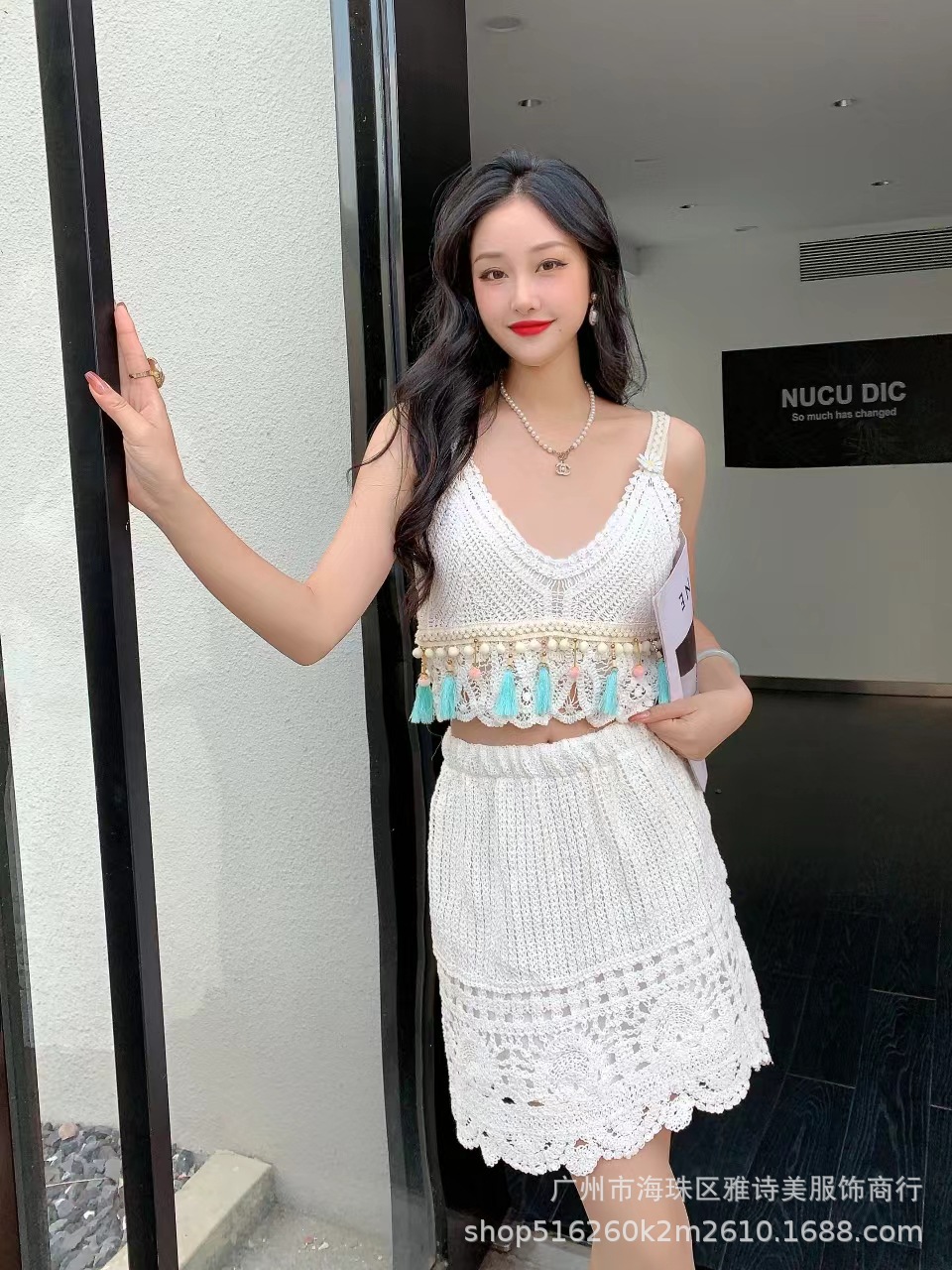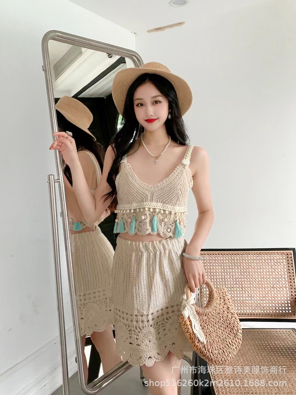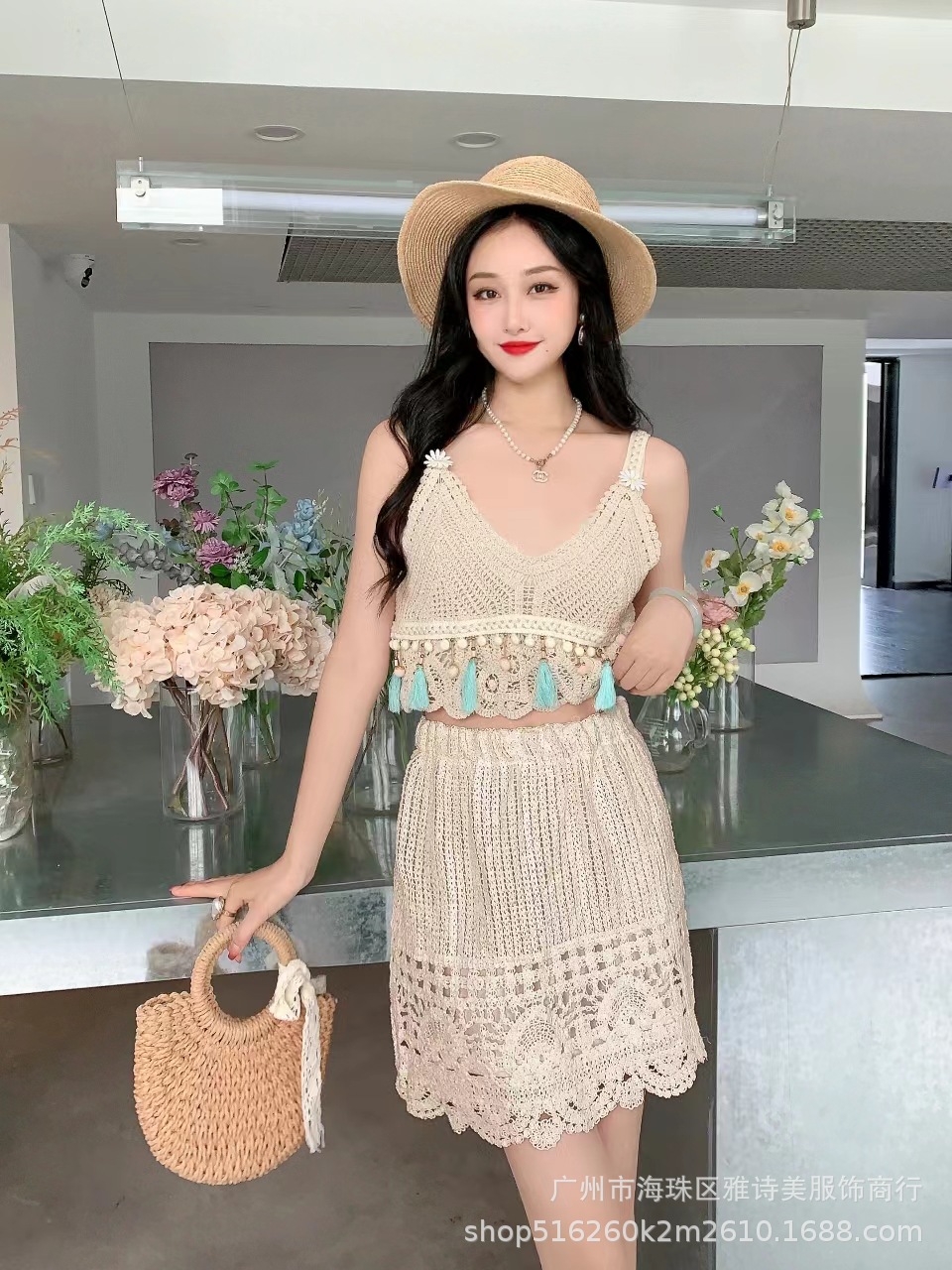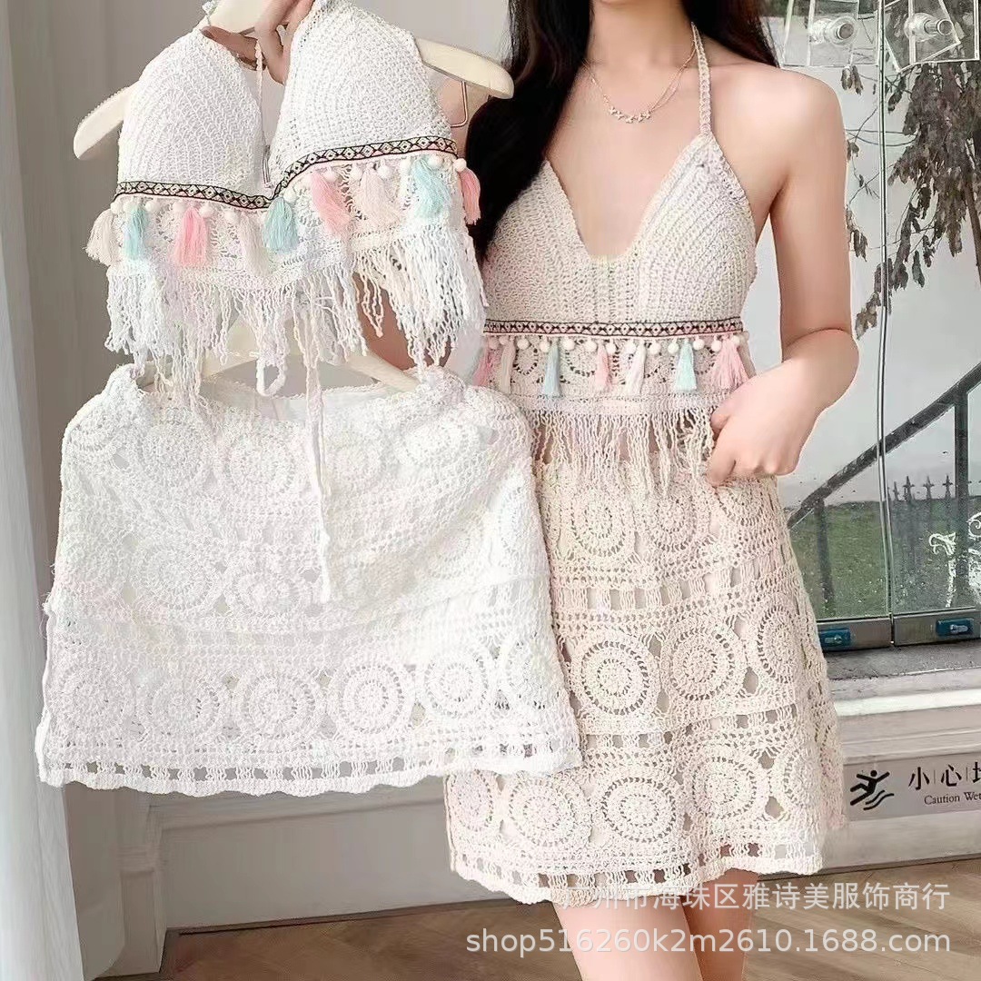 보헤미안 인터넷 인기있는 섹시한 Caule 기계 올 매치 크로 셰 니트 카미 솔 하이 웨이스트 할로우 투피스 여성용 세트스토어 가기