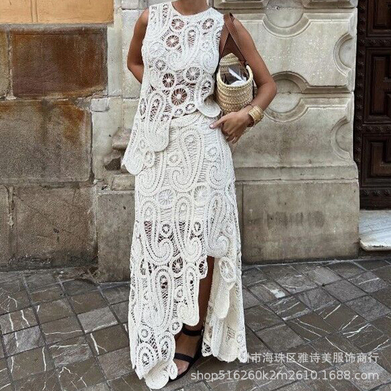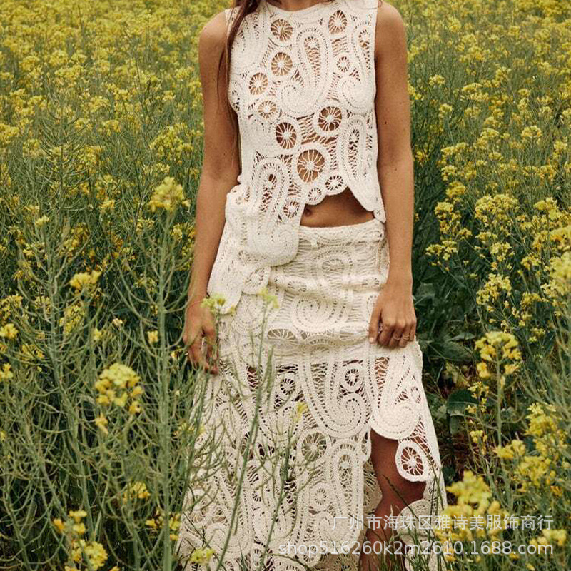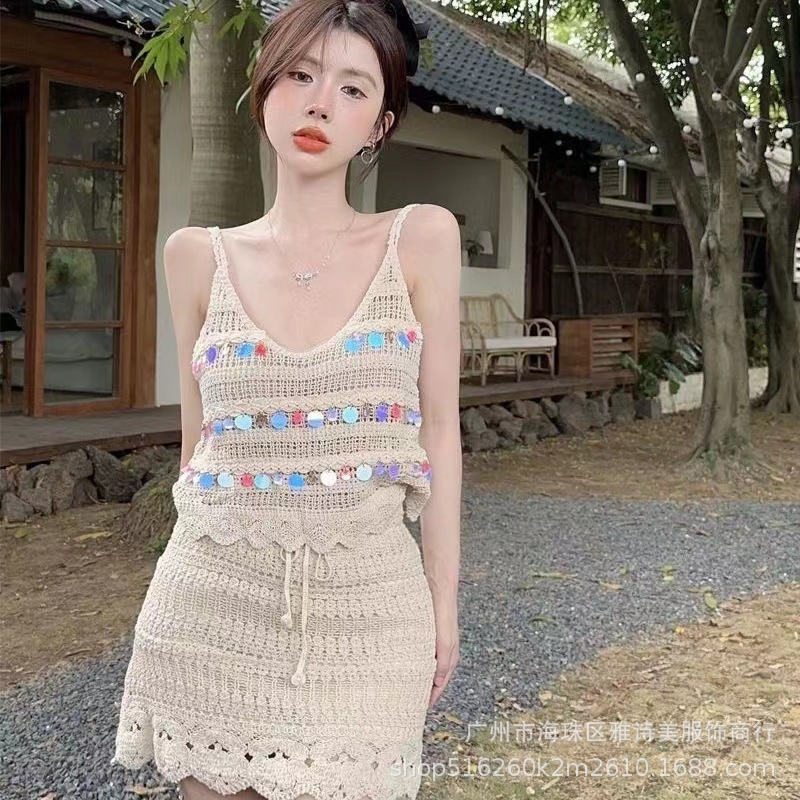 보헤미안 인터넷 인기있는 섹시한 Caule 기계 올 매치 크로 셰 니트 카미 솔 하이 웨이스트 할로우 투피스 여성용 세트