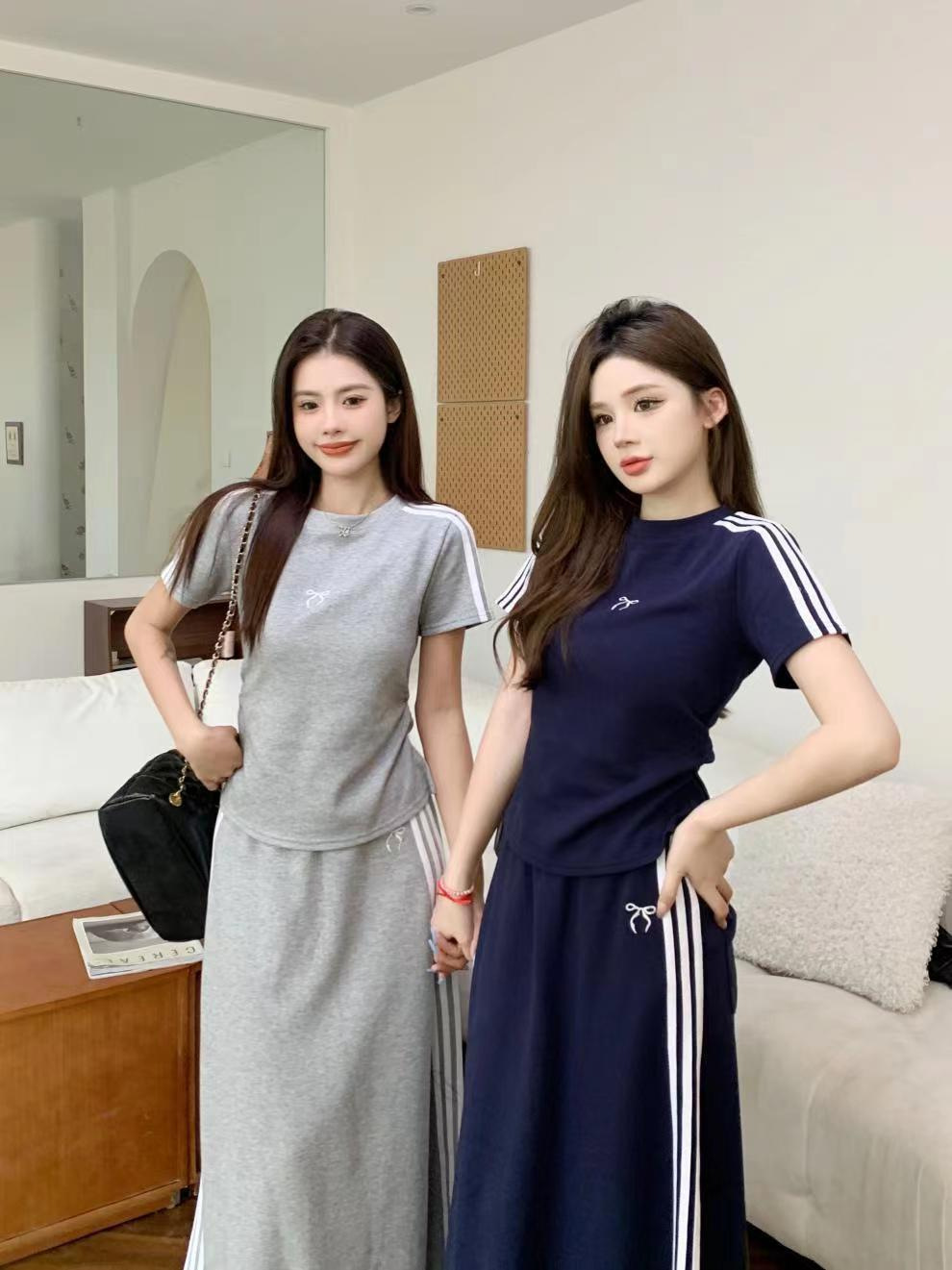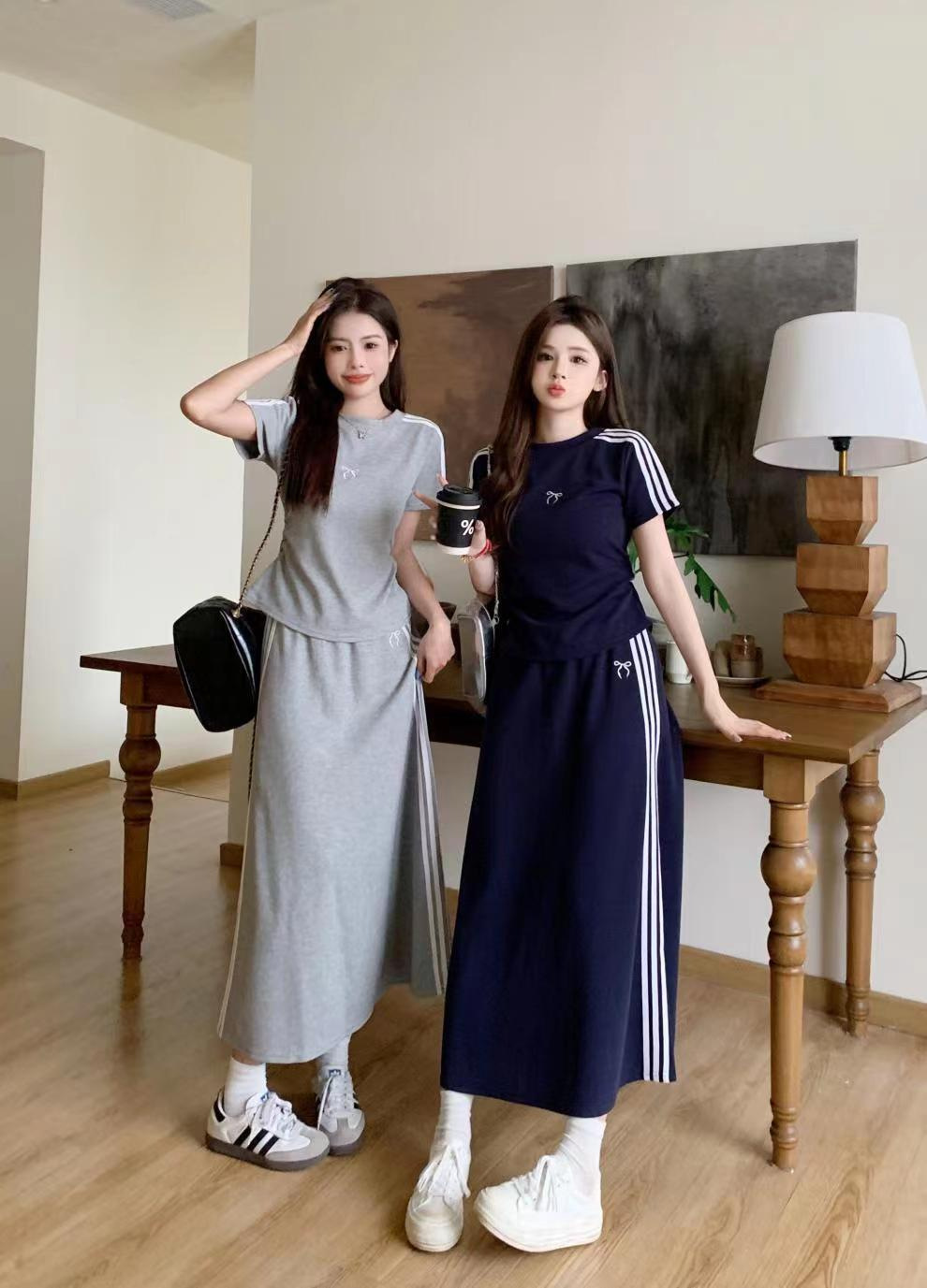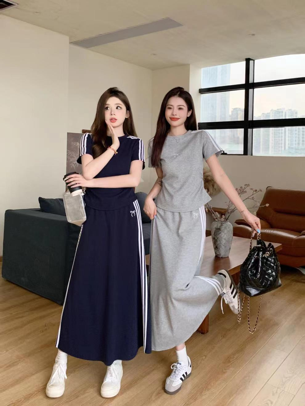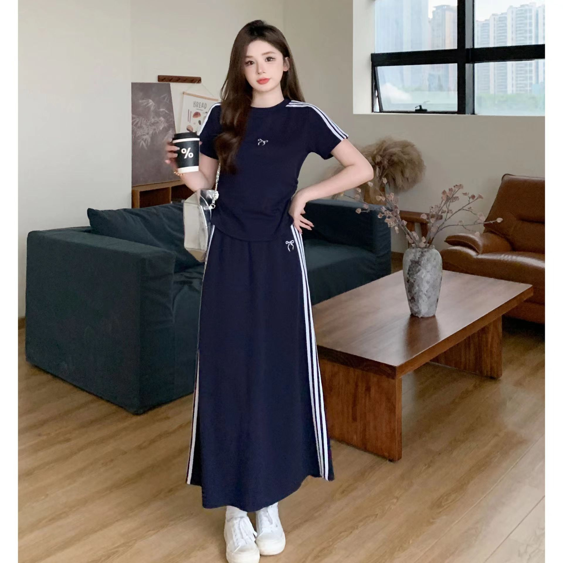 게으른 스타일 캐주얼 패션 세트 여성 3 바 반팔 티셔츠 여름 높은 허리 A 라인 스커트 스포츠 스타일 2 조각 유행 세트스토어 가기
