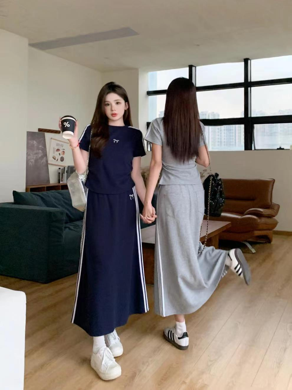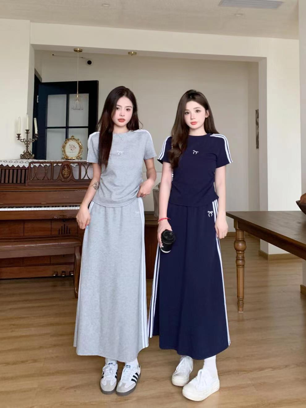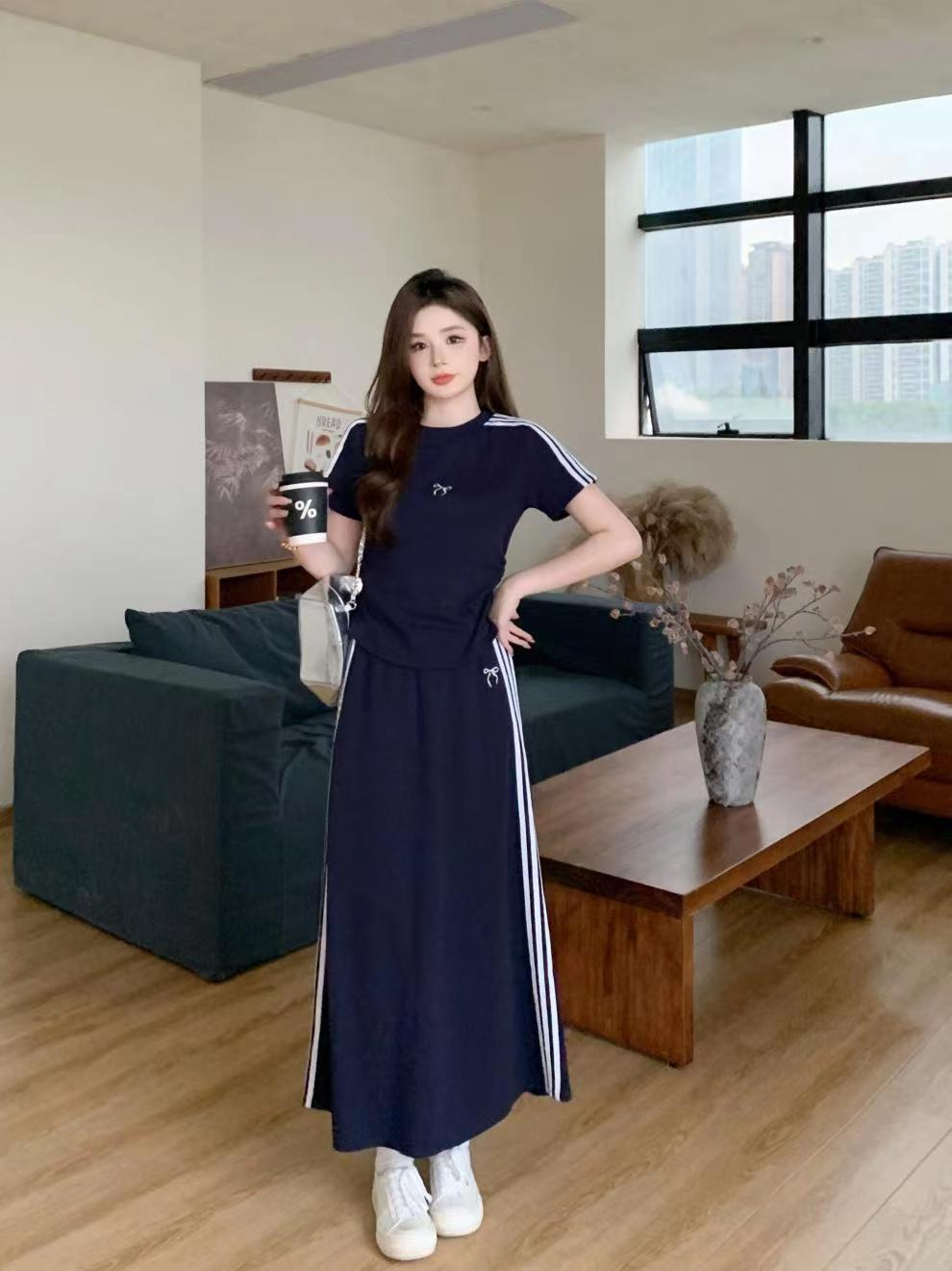 게으른 스타일 캐주얼 패션 세트 여성 3 바 반팔 티셔츠 여름 높은 허리 A 라인 스커트 스포츠 스타일 2 조각 유행 세트스토어 가기