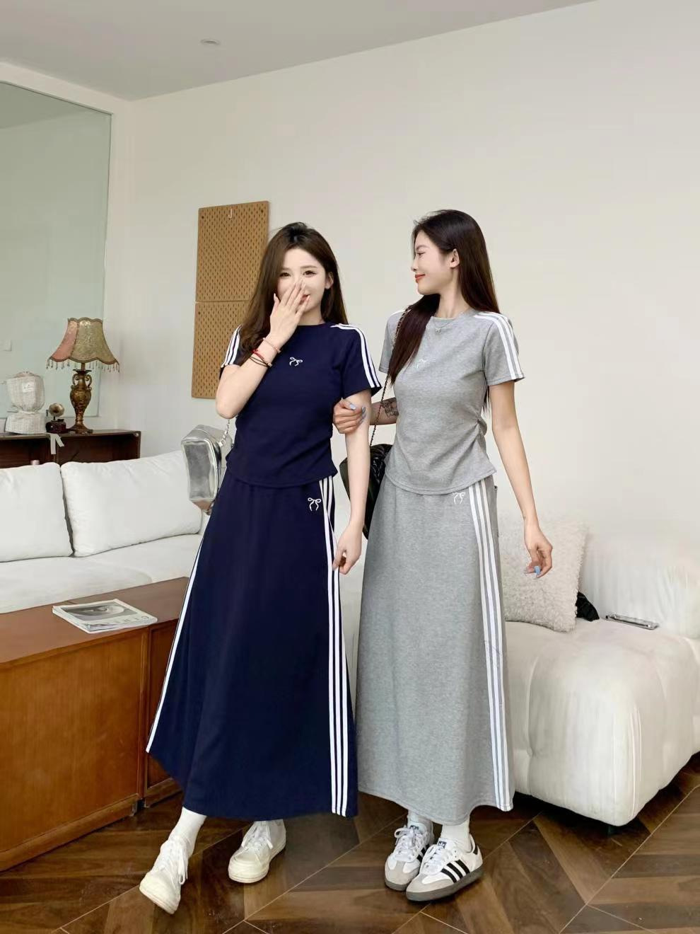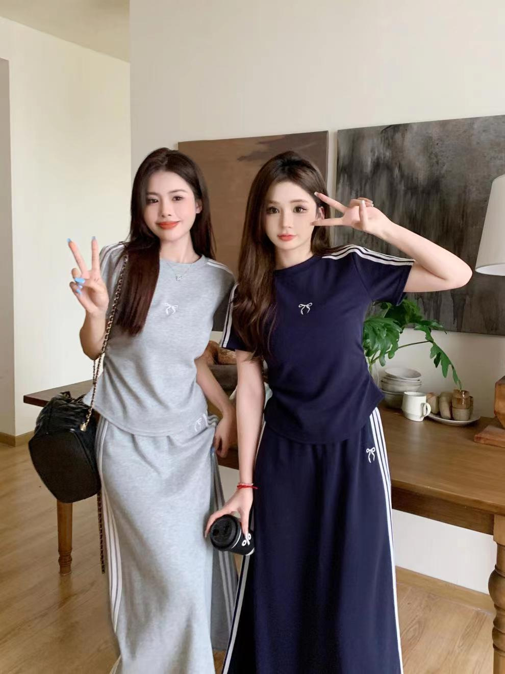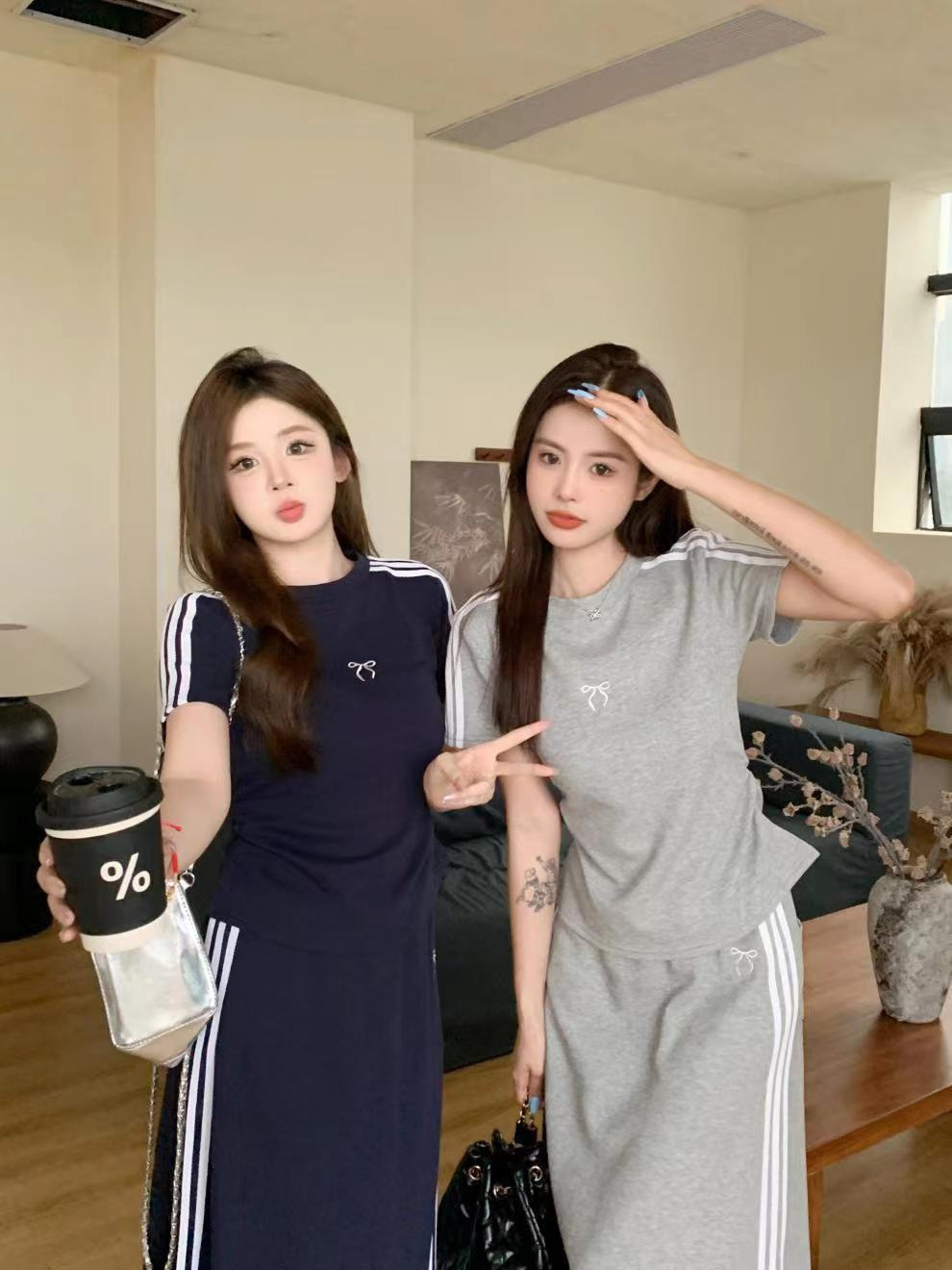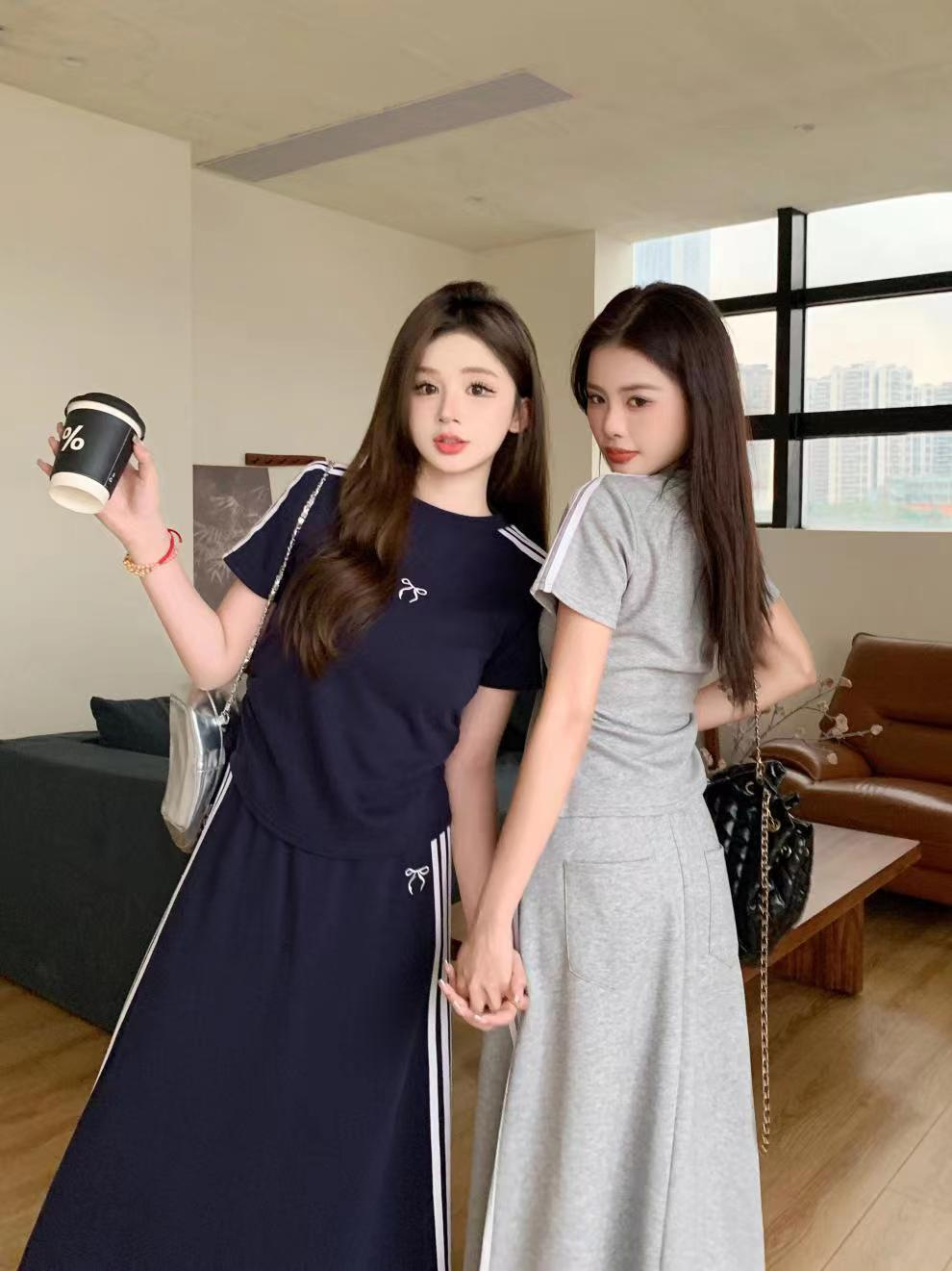 게으른 스타일 캐주얼 패션 세트 여성 3 바 반팔 티셔츠 여름 높은 허리 A 라인 스커트 스포츠 스타일 2 조각 유행 세트스토어 가기