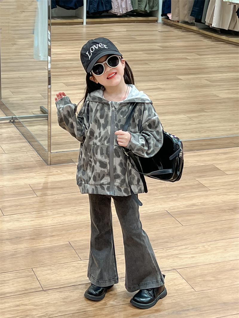 2025 가을 신상 한국 스타일 아동복 여아 레오파드 프린트 후드 스웨트셔츠 재킷 지퍼 셔츠 신축성 있는 플레어 팬츠