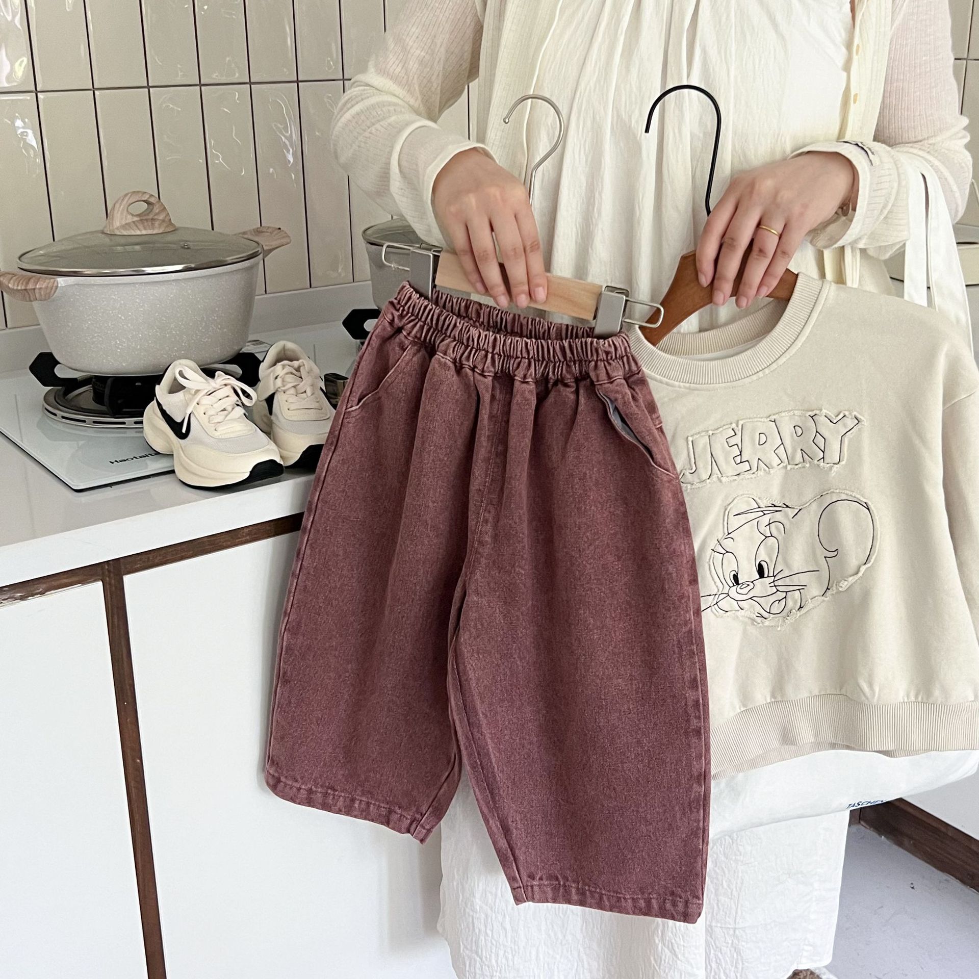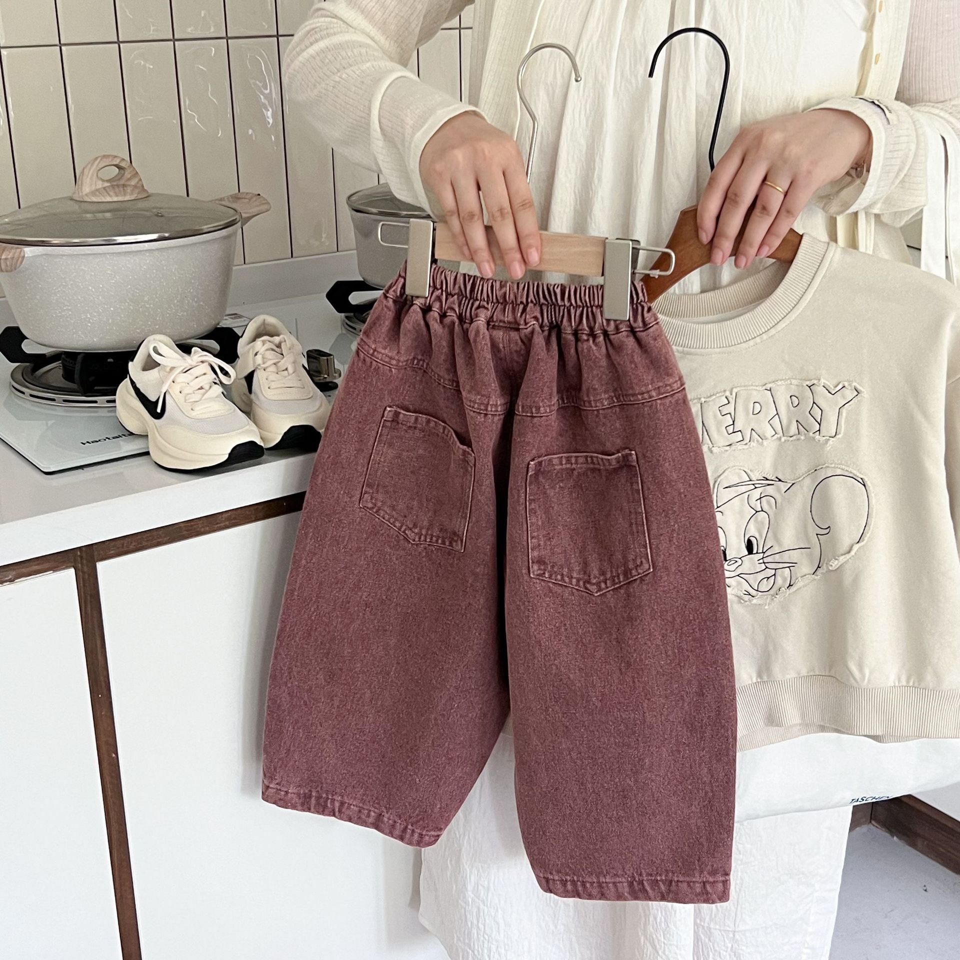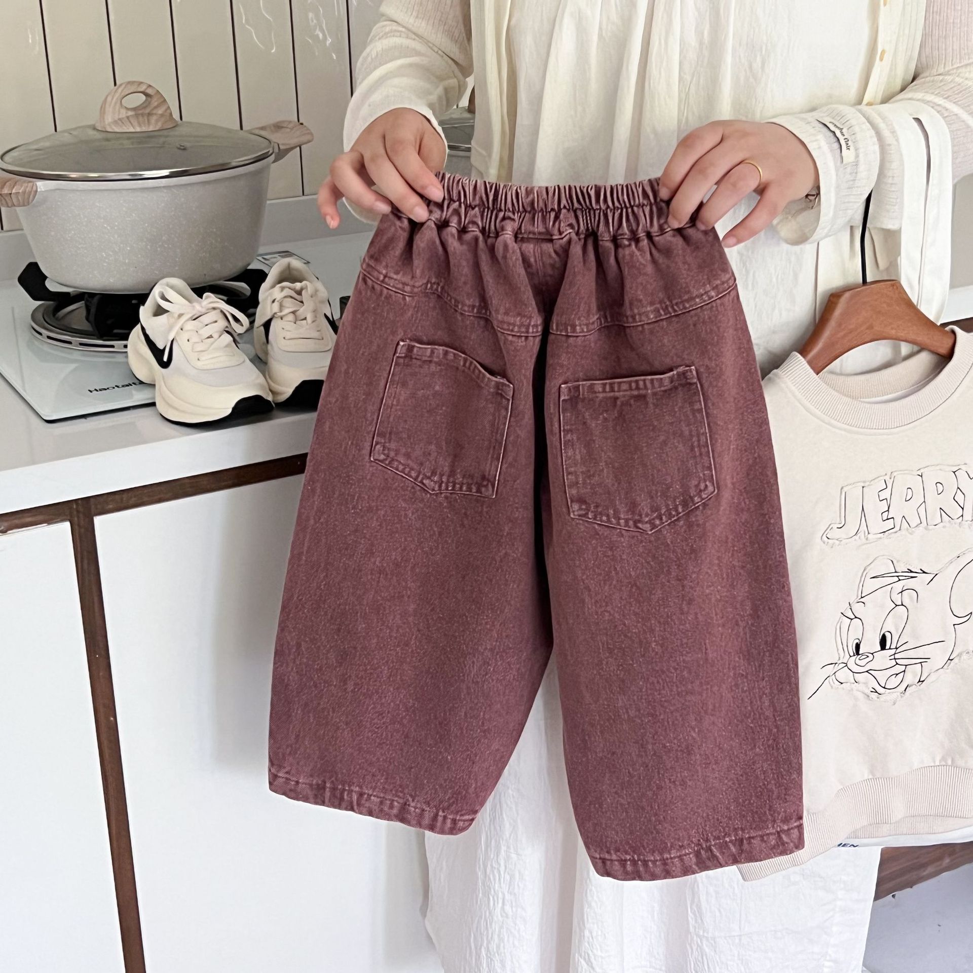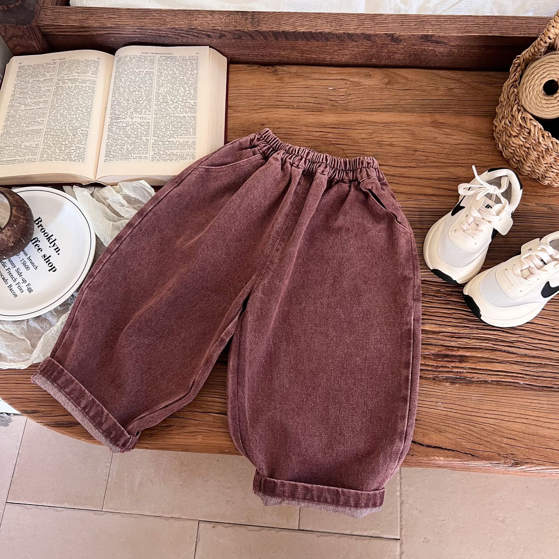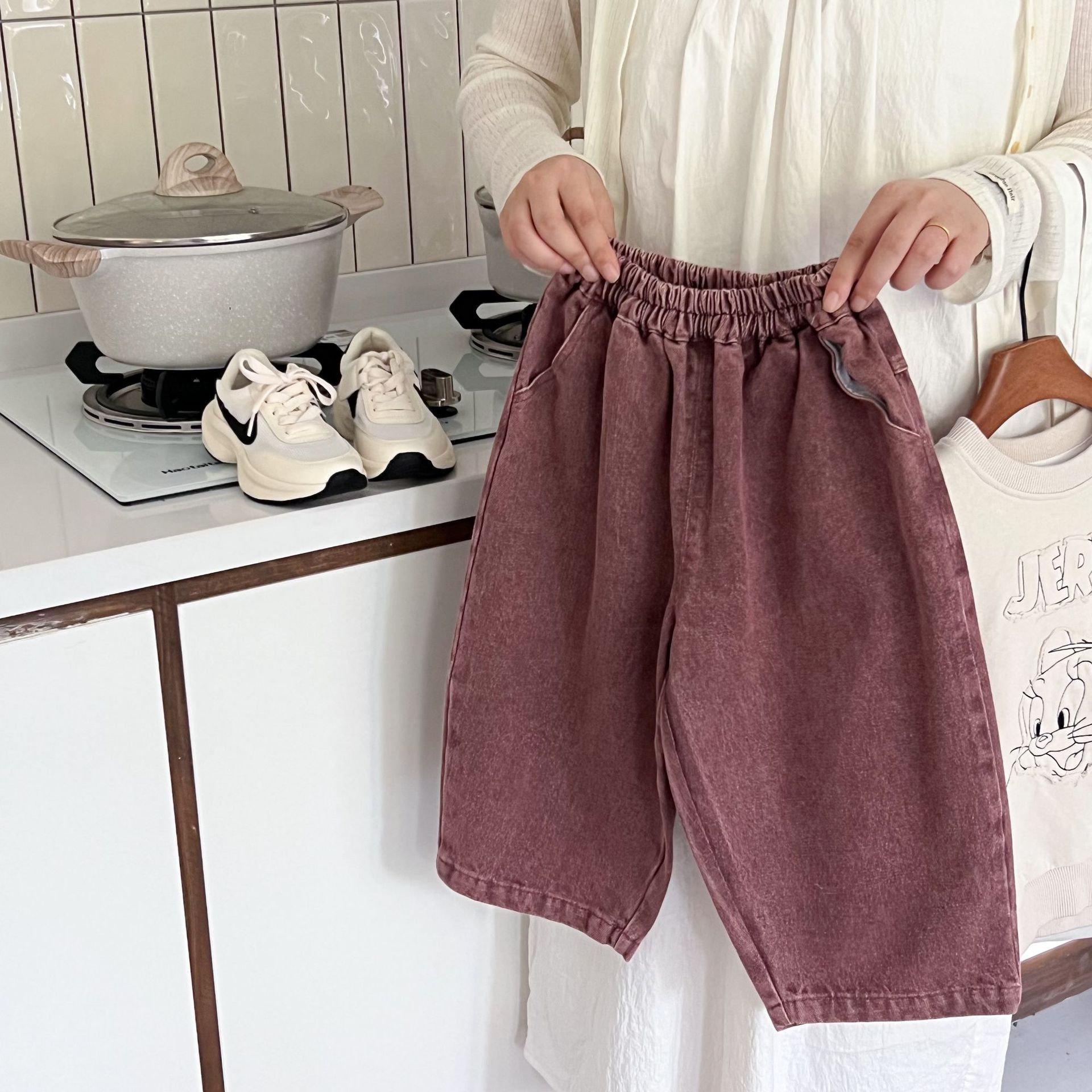 洗旧的红色,不同于常见的蓝色牛仔裤,充满热情与活力,让孩子瞬间成为焦点。比如在集体活动中,孩子能轻松被识别和记住。