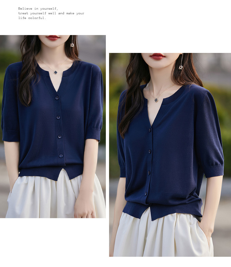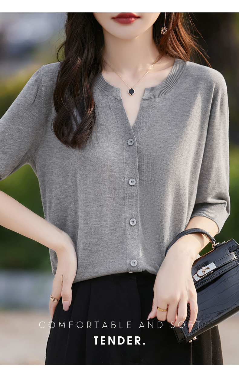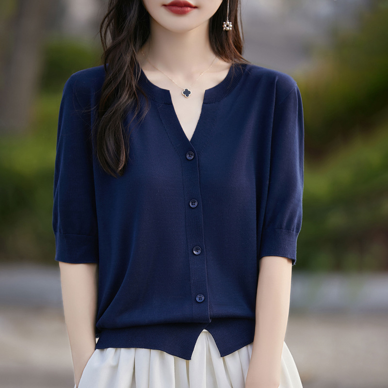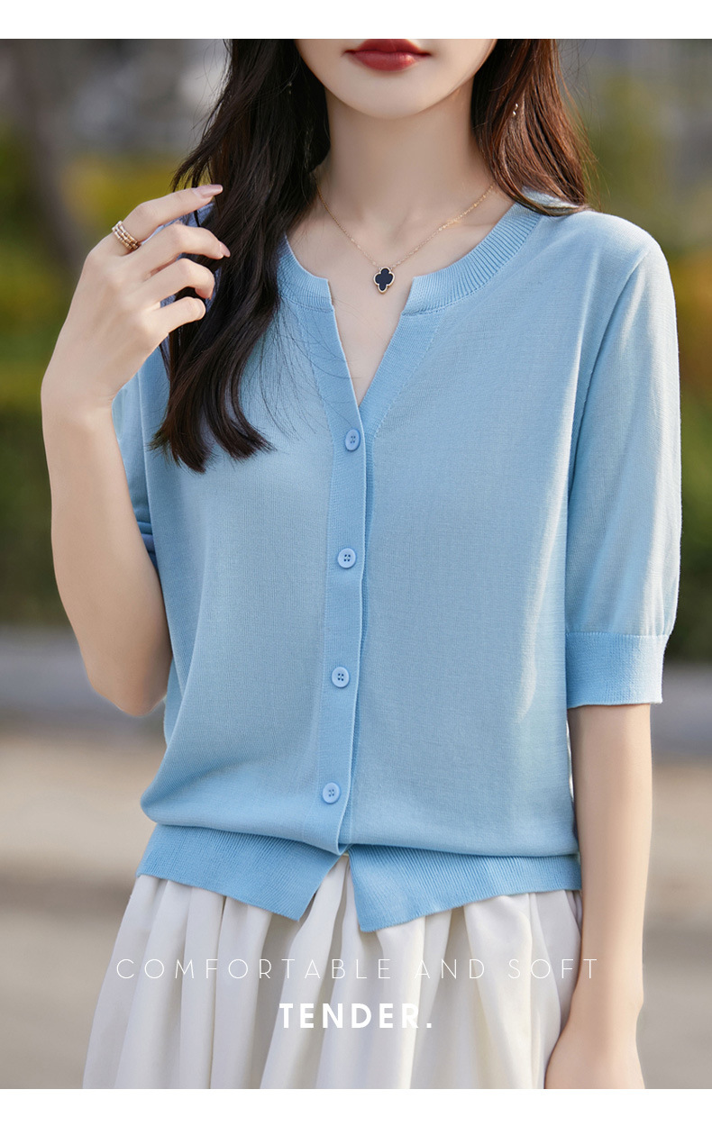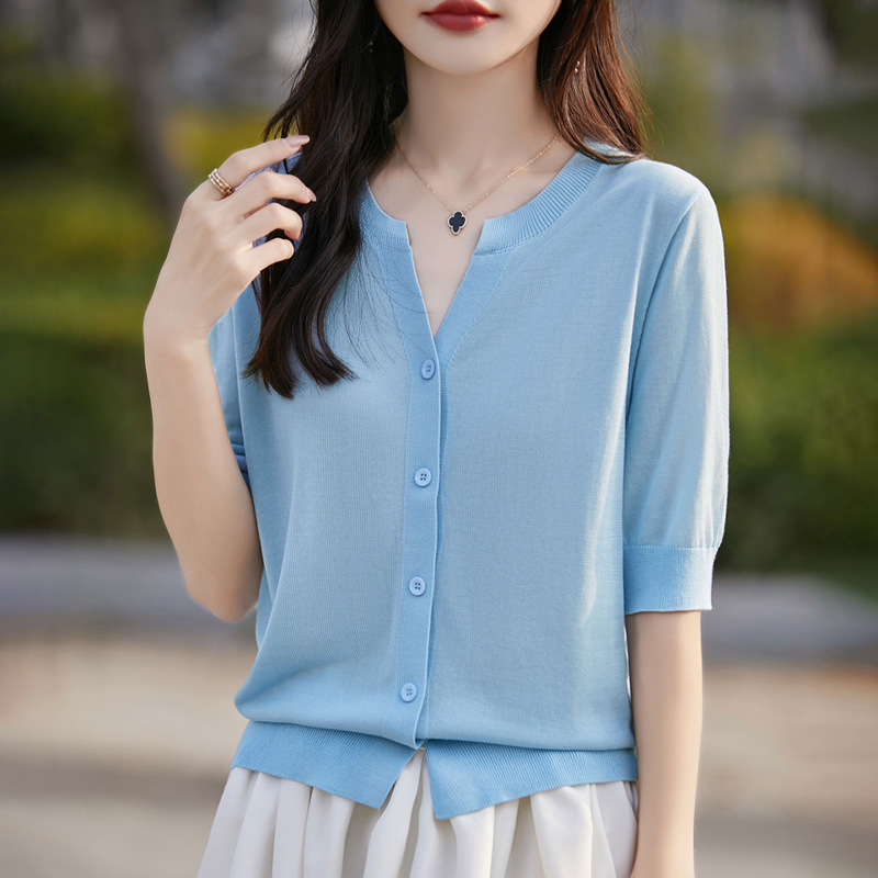텐셀 하프 슬리브 니트 스웨터 여성용 카디건 가위 칼라 루즈 슬림 핏 새로운 스타일 심플 올 매치 하프 슬리브 탑