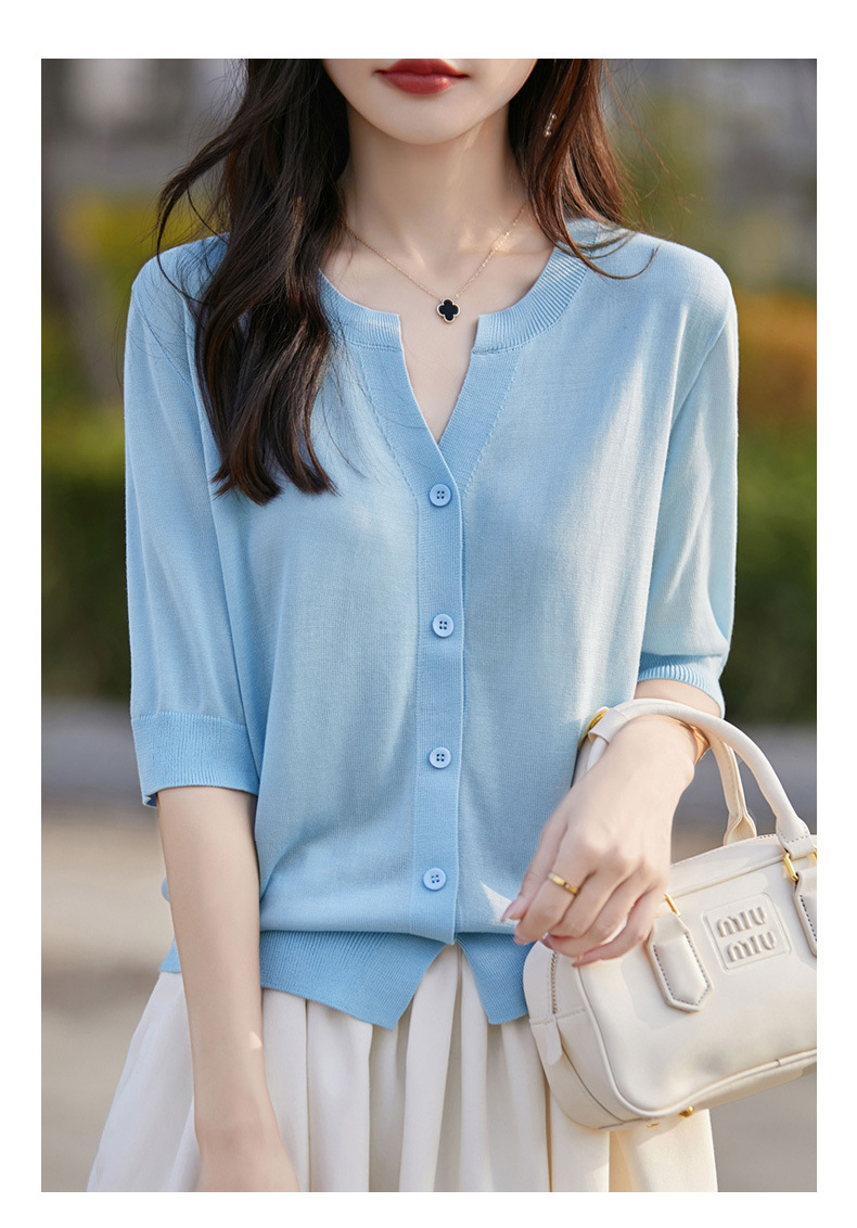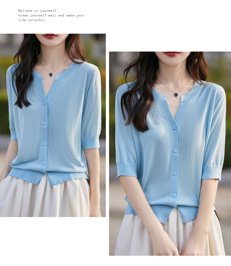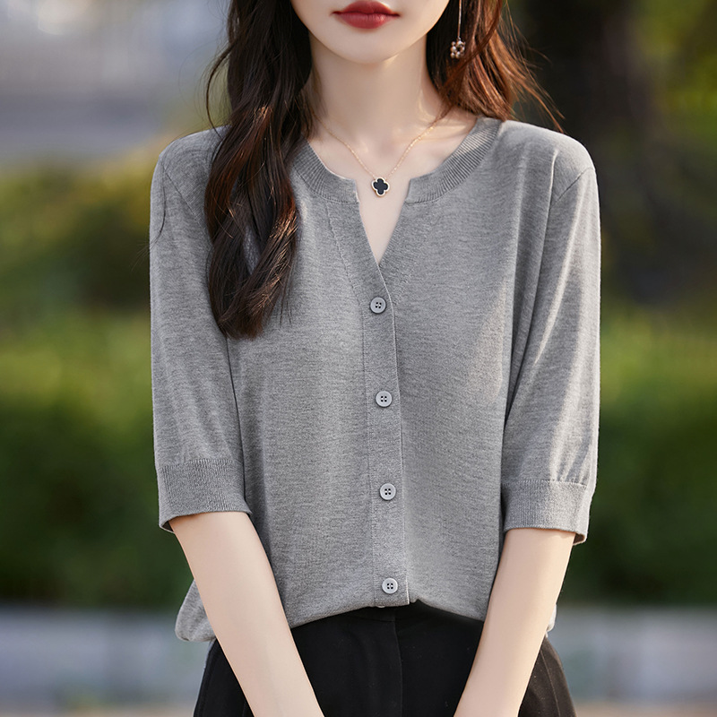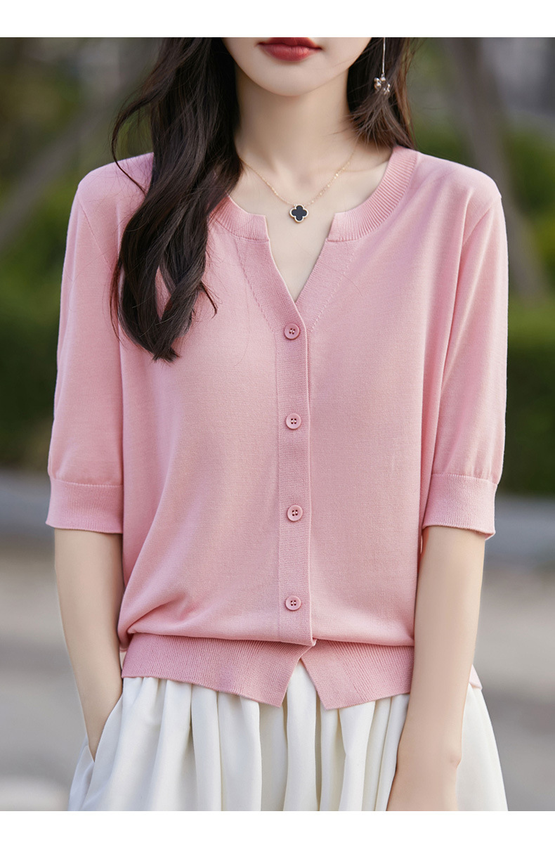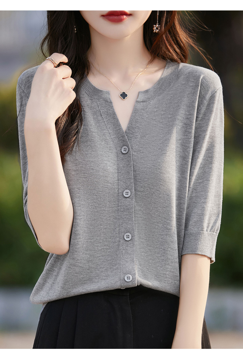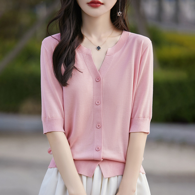 텐셀 하프 슬리브 니트 스웨터 여성용 카디건 가위 칼라 루즈 슬림 핏 새로운 스타일 심플 올 매치 하프 슬리브 탑