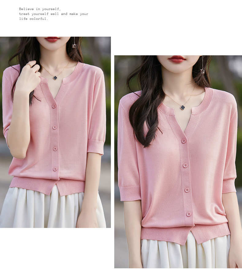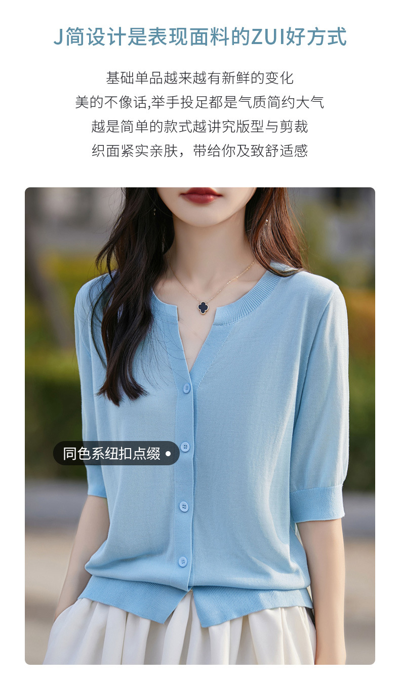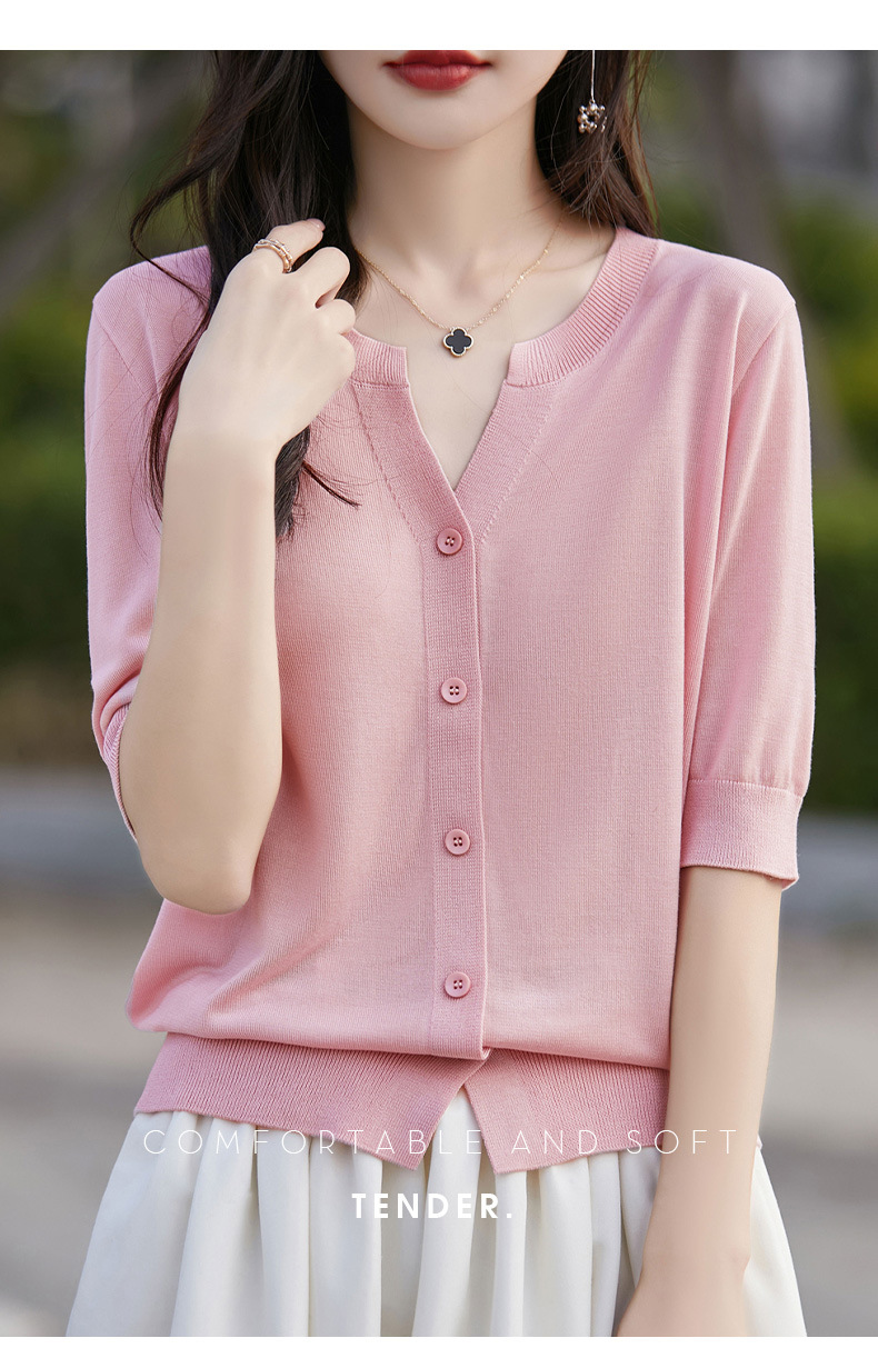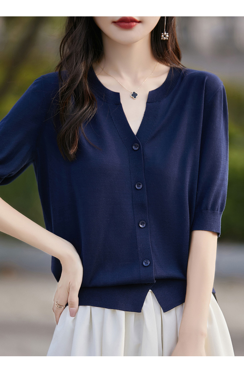 텐셀 하프 슬리브 니트 스웨터 여성용 카디건 가위 칼라 루즈 슬림 핏 새로운 스타일 심플 올 매치 하프 슬리브 탑