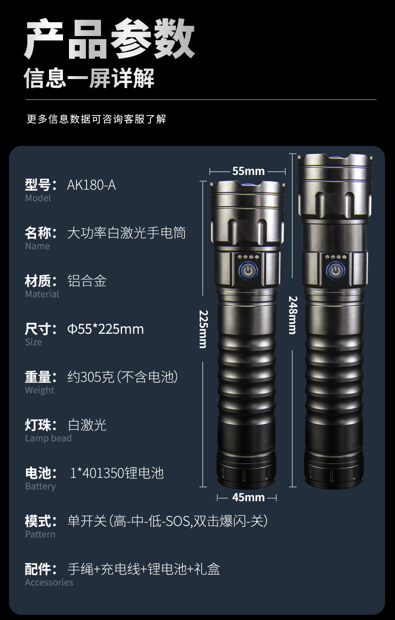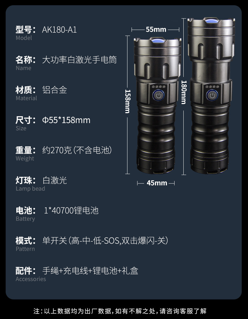 • AK180-A1 단일 손전등(배터리는 포함되어 있지 않음)
