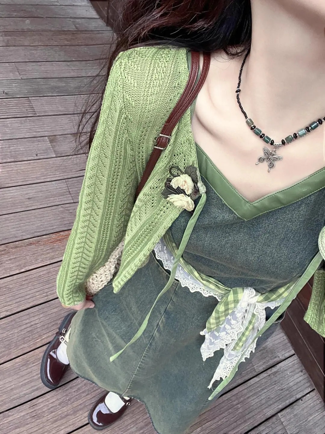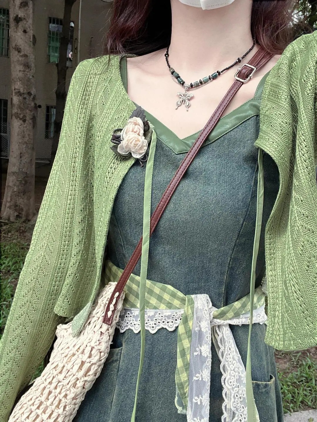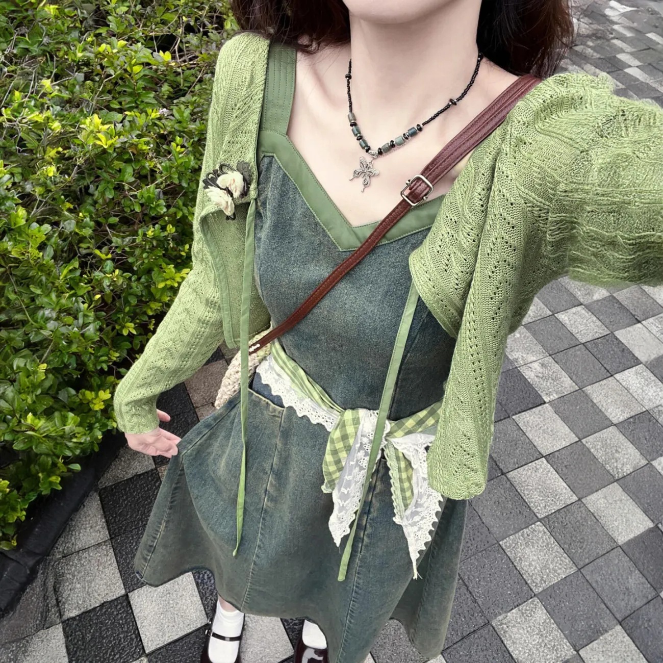 두 조각/세트 달콤한 소원 데님 슬링 원피스 여성용 중공 레트로 선 스크린 니트 카디건