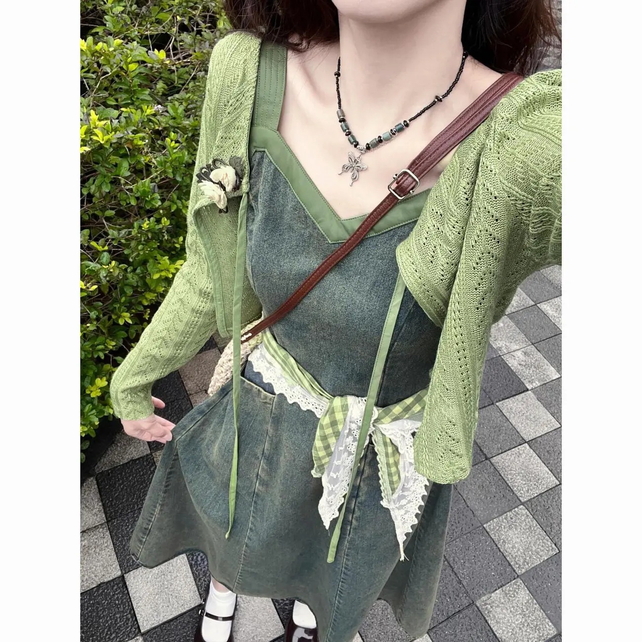 두 조각/세트 달콤한 소원 데님 슬링 원피스 여성용 중공 레트로 선 스크린 니트 카디건스토어 가기