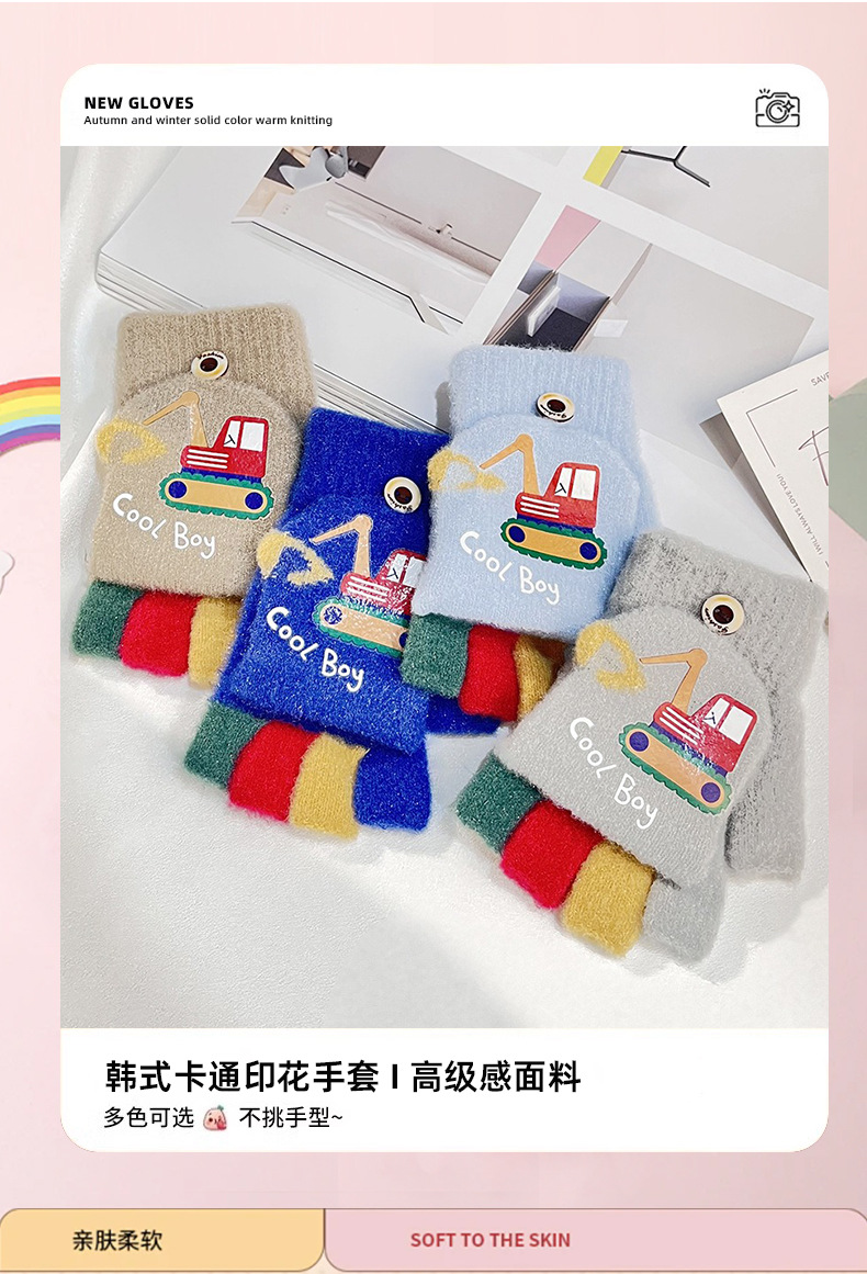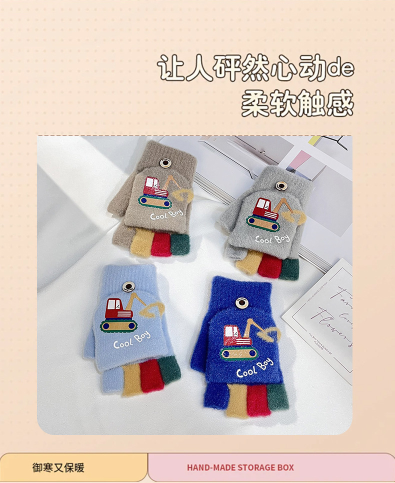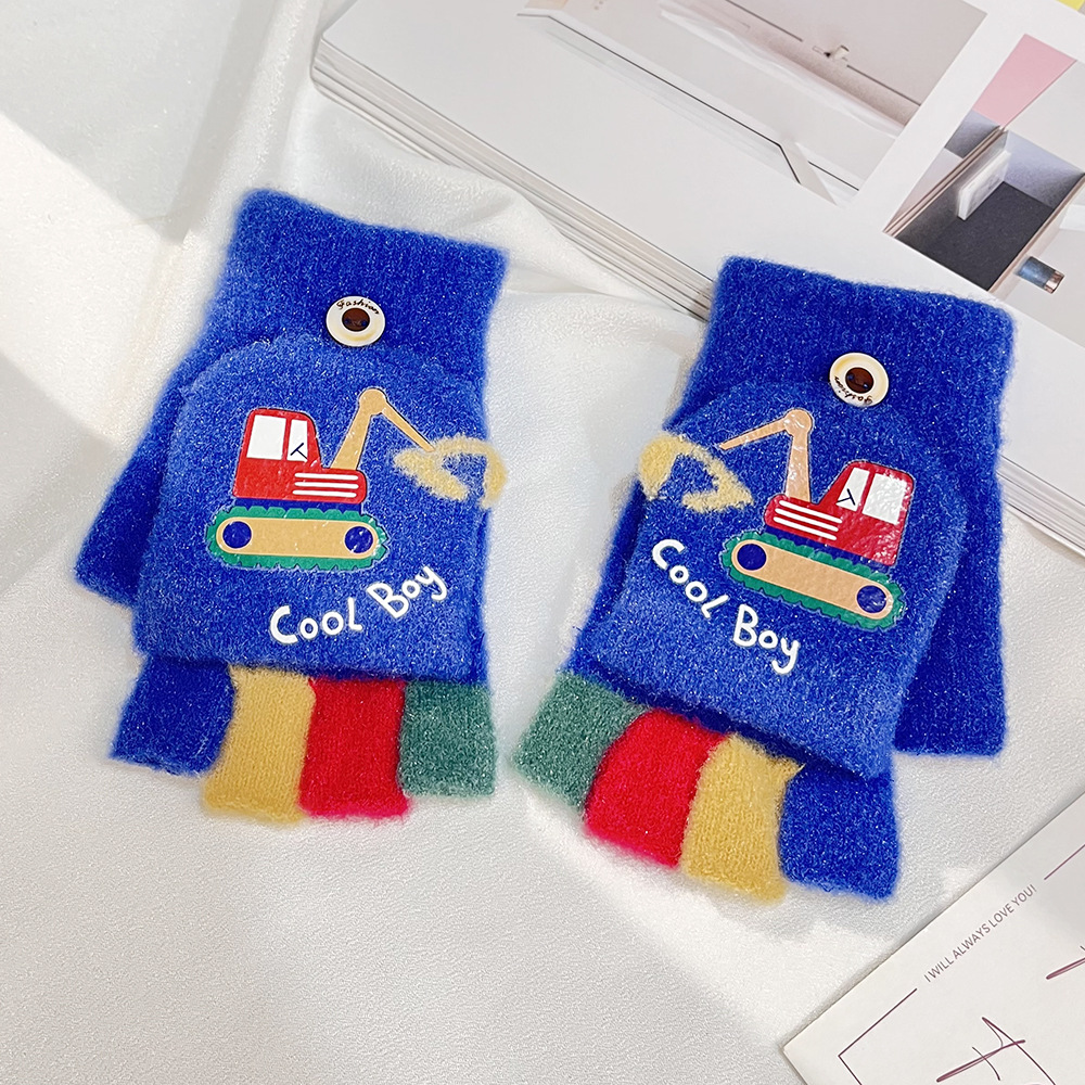 가을 겨울 어린이용 만화 굴착기 프린트 보온 장갑, 귀여운 반손가락 플립형 글쓰기용 방한 모직 장갑스토어 가기