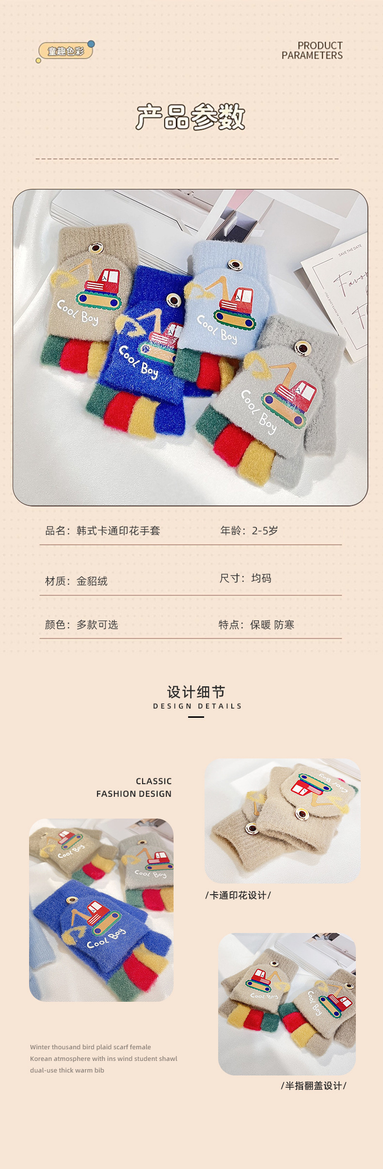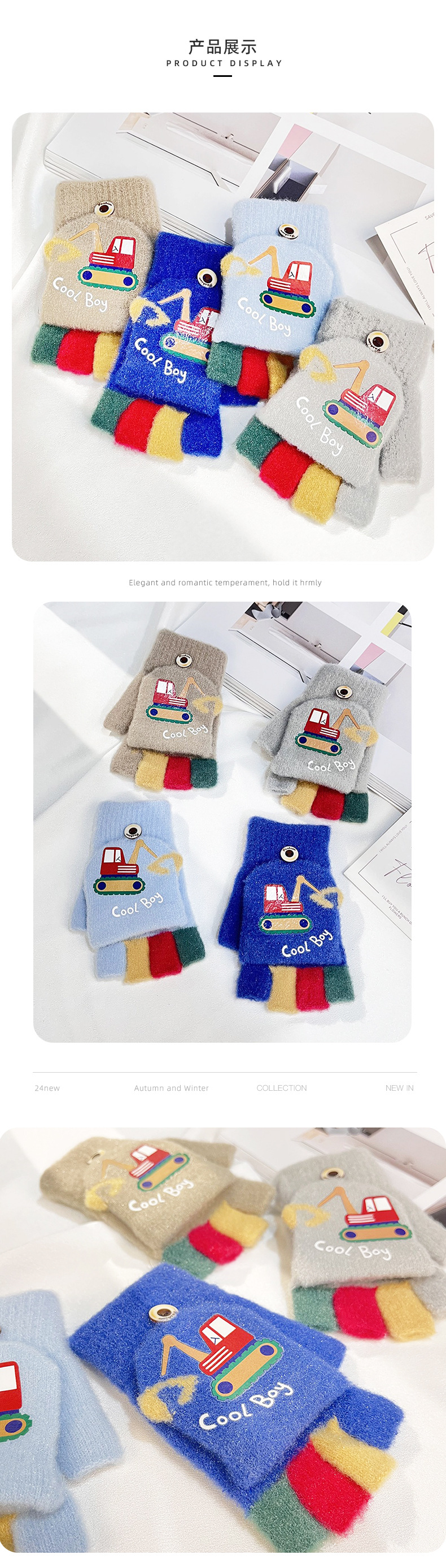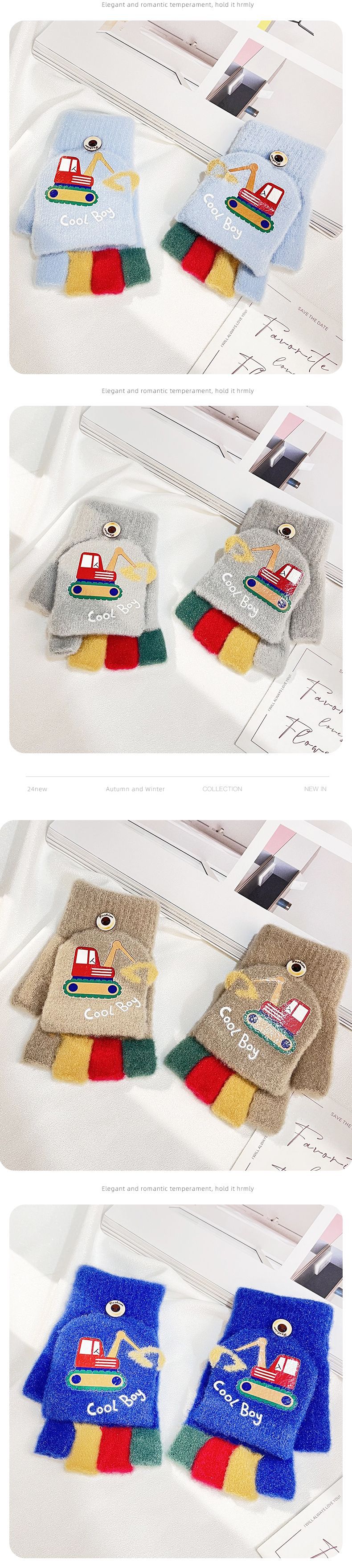 가을 겨울 어린이용 만화 굴착기 프린트 보온 장갑, 귀여운 반손가락 플립형 글쓰기용 방한 모직 장갑스토어 가기
