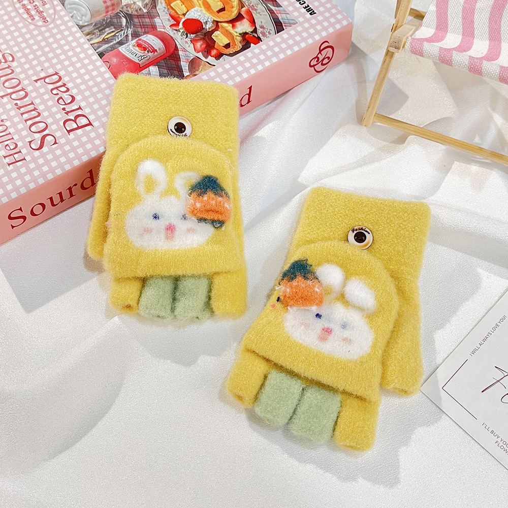 가을 겨울 어린이용 만화 굴착기 프린트 보온 장갑, 귀여운 반손가락 플립형 글쓰기용 방한 모직 장갑