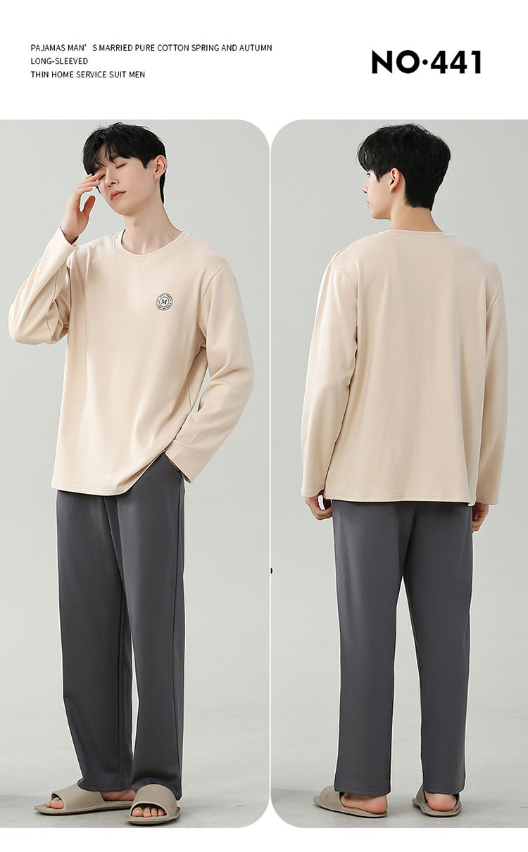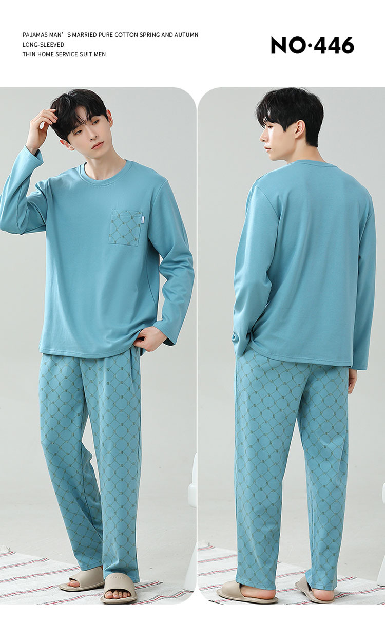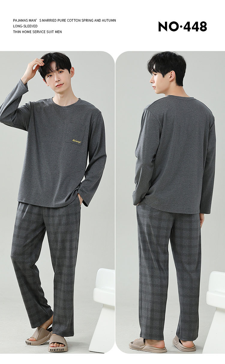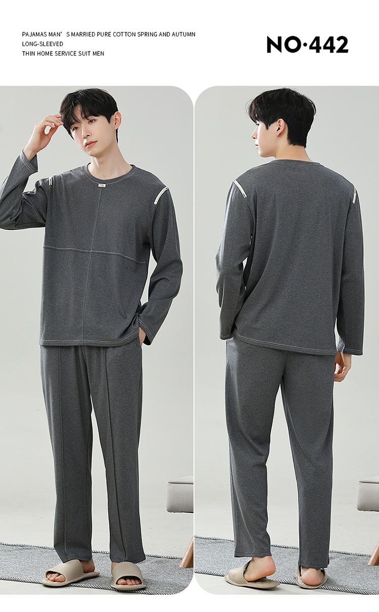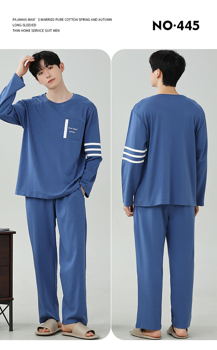 남성용 잠옷 봄 가을 신상 라운드넥 풀오버 긴팔 긴바지 세트 외출복 스포츠 스타일 홈웨어 투피스 세트스토어 가기