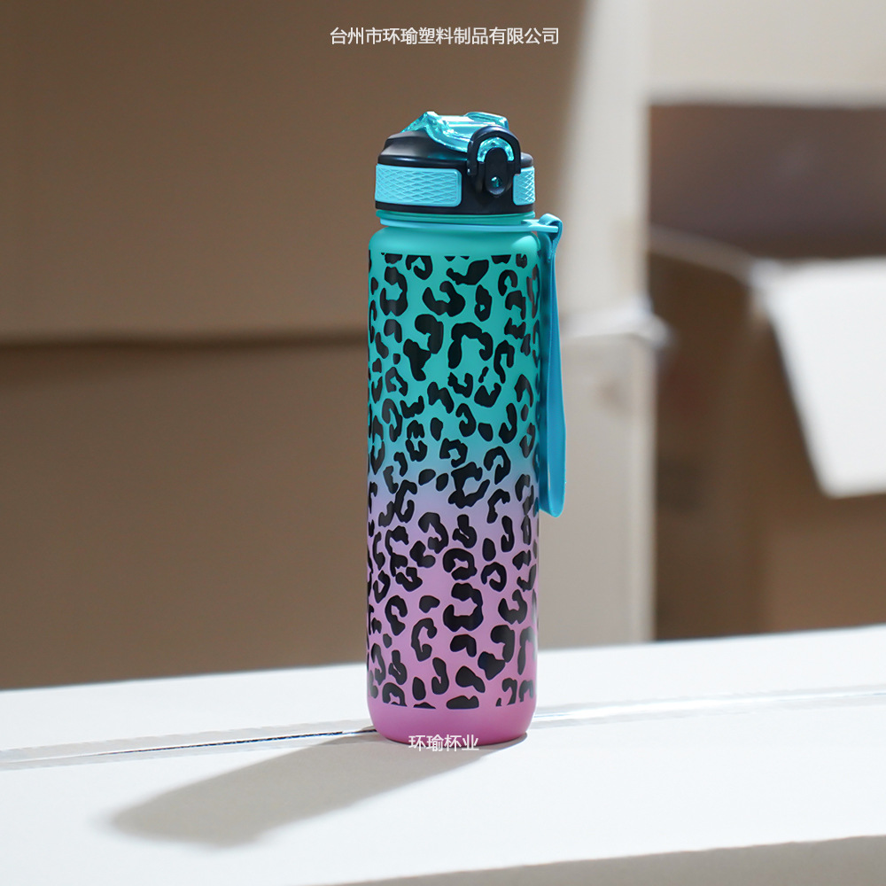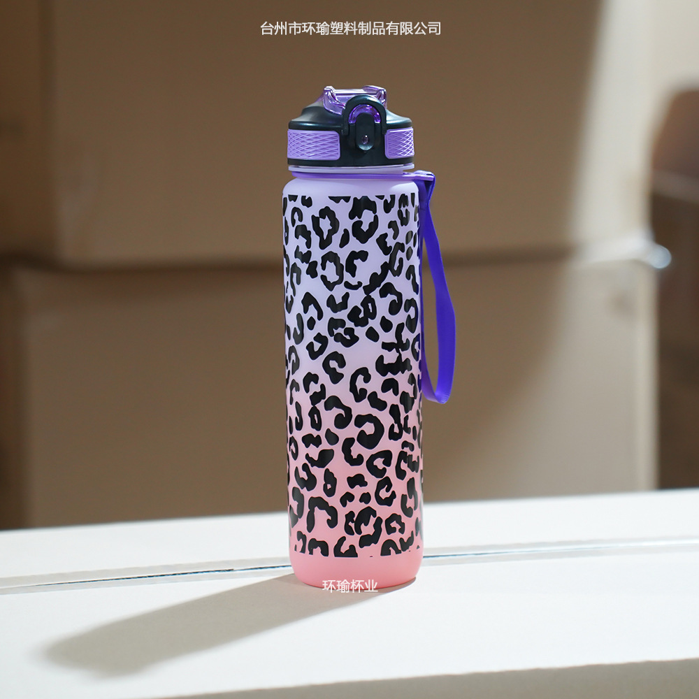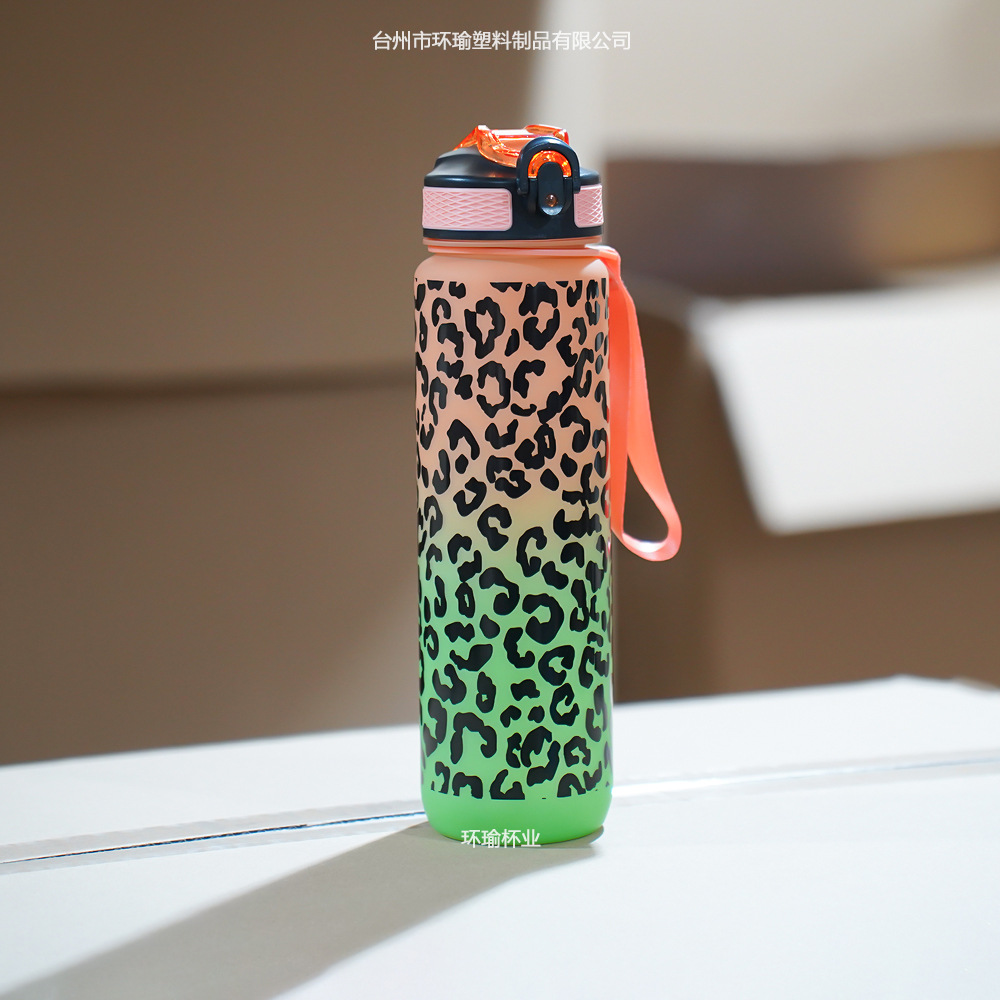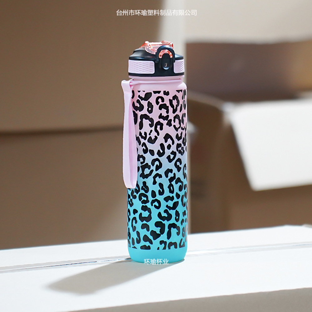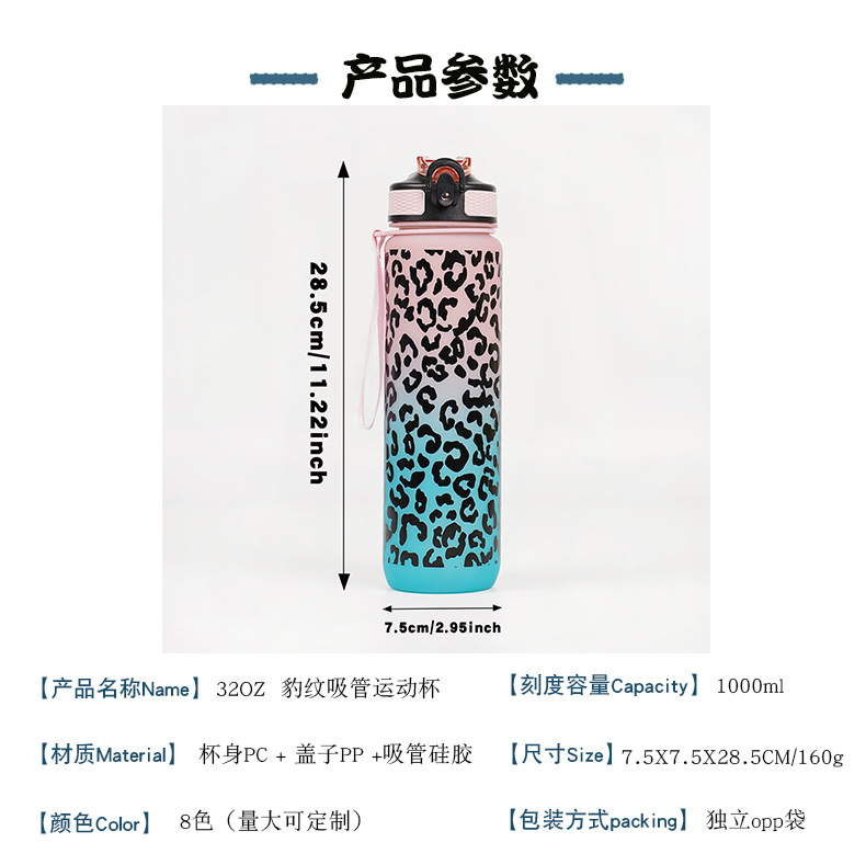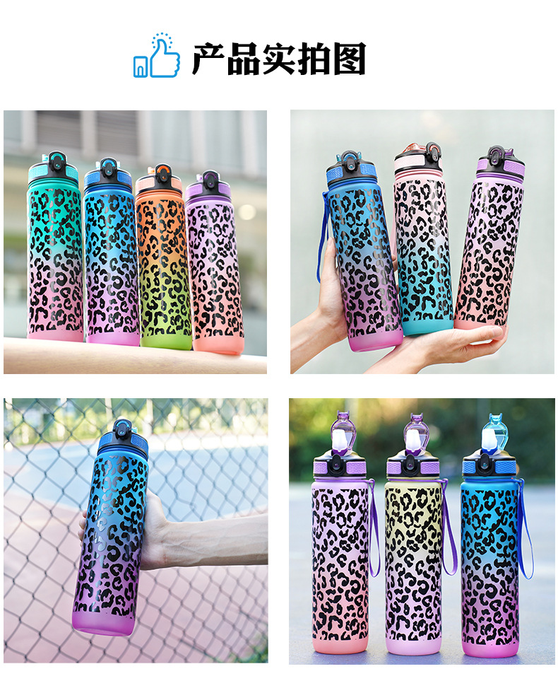 아마존 국경 1L 그라디언트 색상 표범 인쇄 사랑 스포츠 튀는 플라스틱 워터 컵 핸들 로프 대용량 밀짚 컵