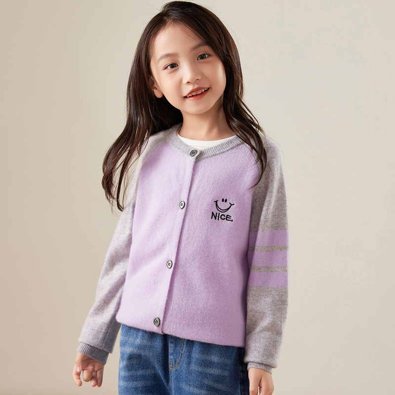 2024 가을과 겨울 새로운 달콤한 어린이 울 카디건 크루 넥 컬러 매칭 코트 수 놓은 캐시미어베이스 셔츠스토어 가기