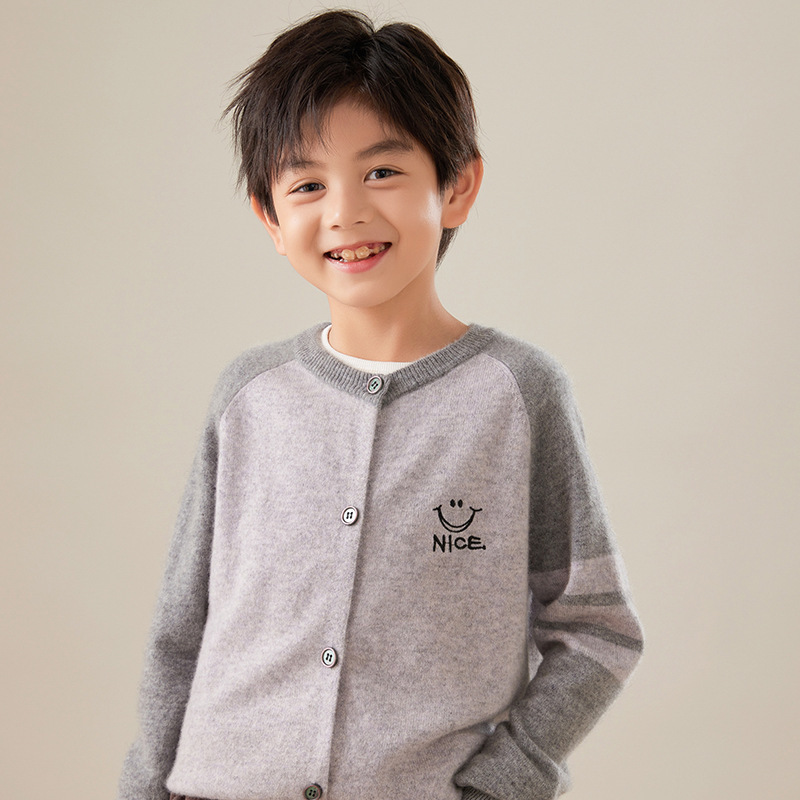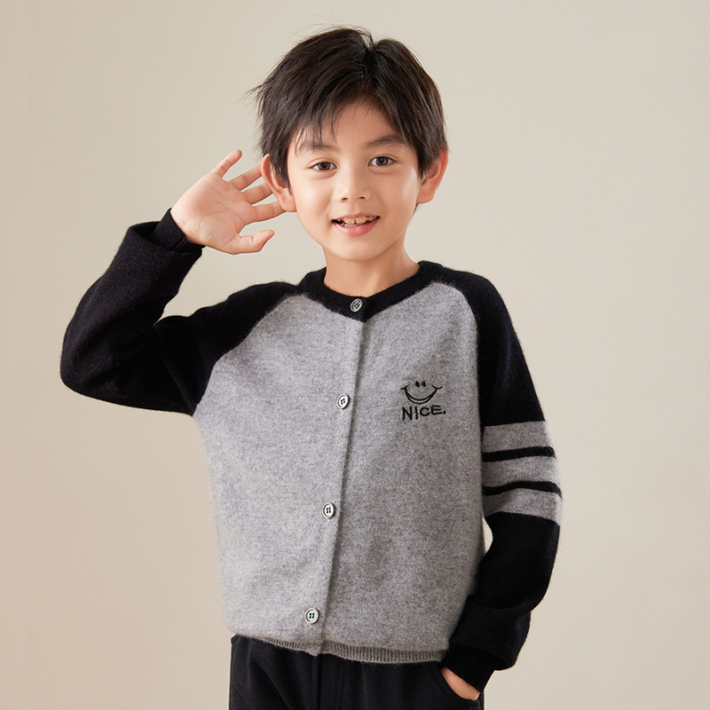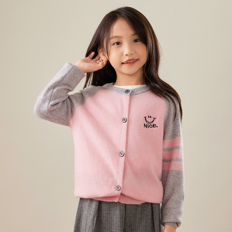 2024 가을과 겨울 새로운 달콤한 어린이 울 카디건 크루 넥 컬러 매칭 코트 수 놓은 캐시미어베이스 셔츠