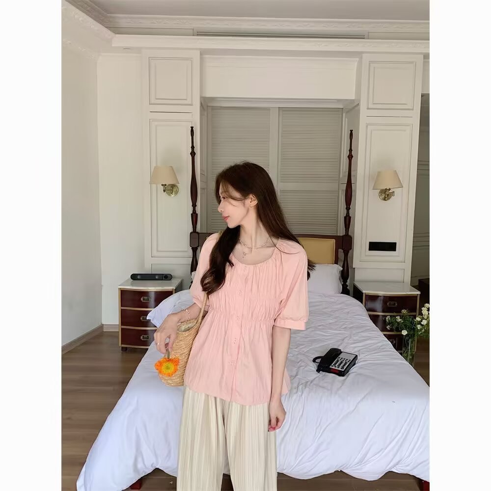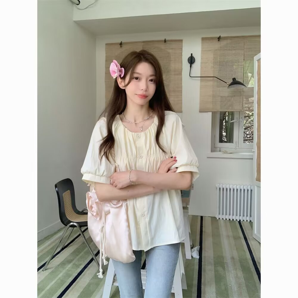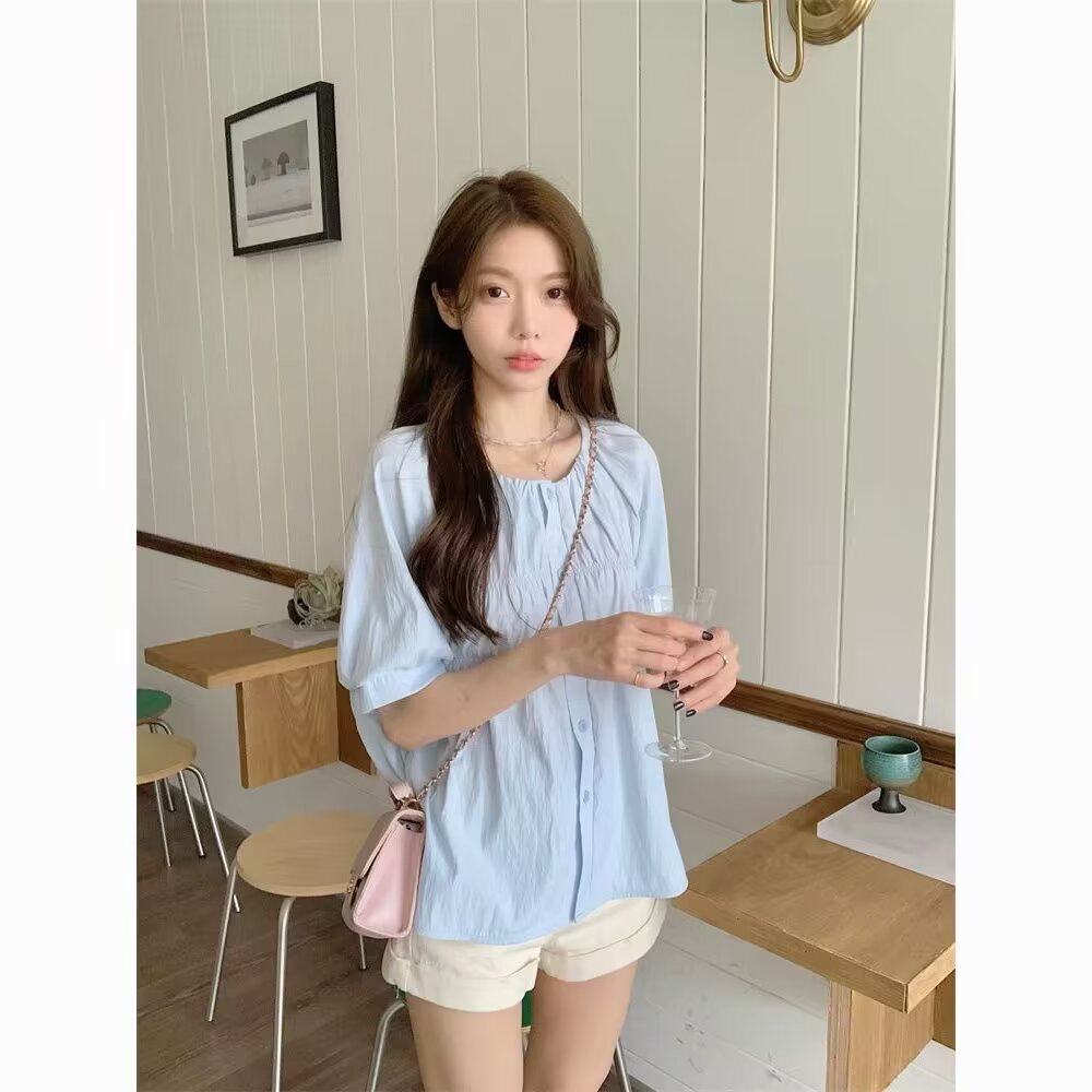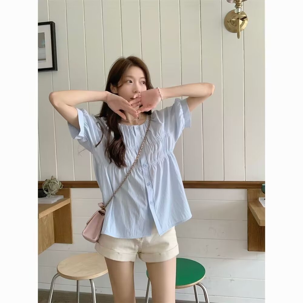 탄성 스퀘어 칼라 셔츠 여성의 여름 디자인 감각 틈새 편안한 슬림 프렌치 탑 달콤한 인형 셔츠스토어 가기