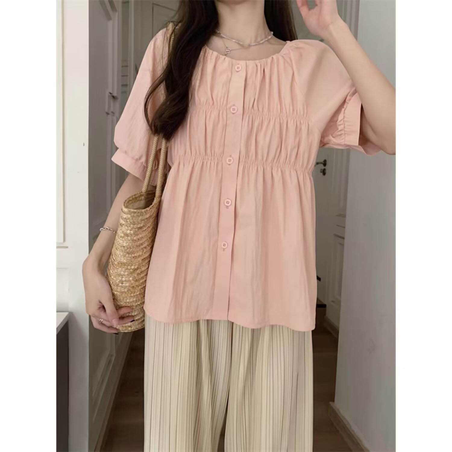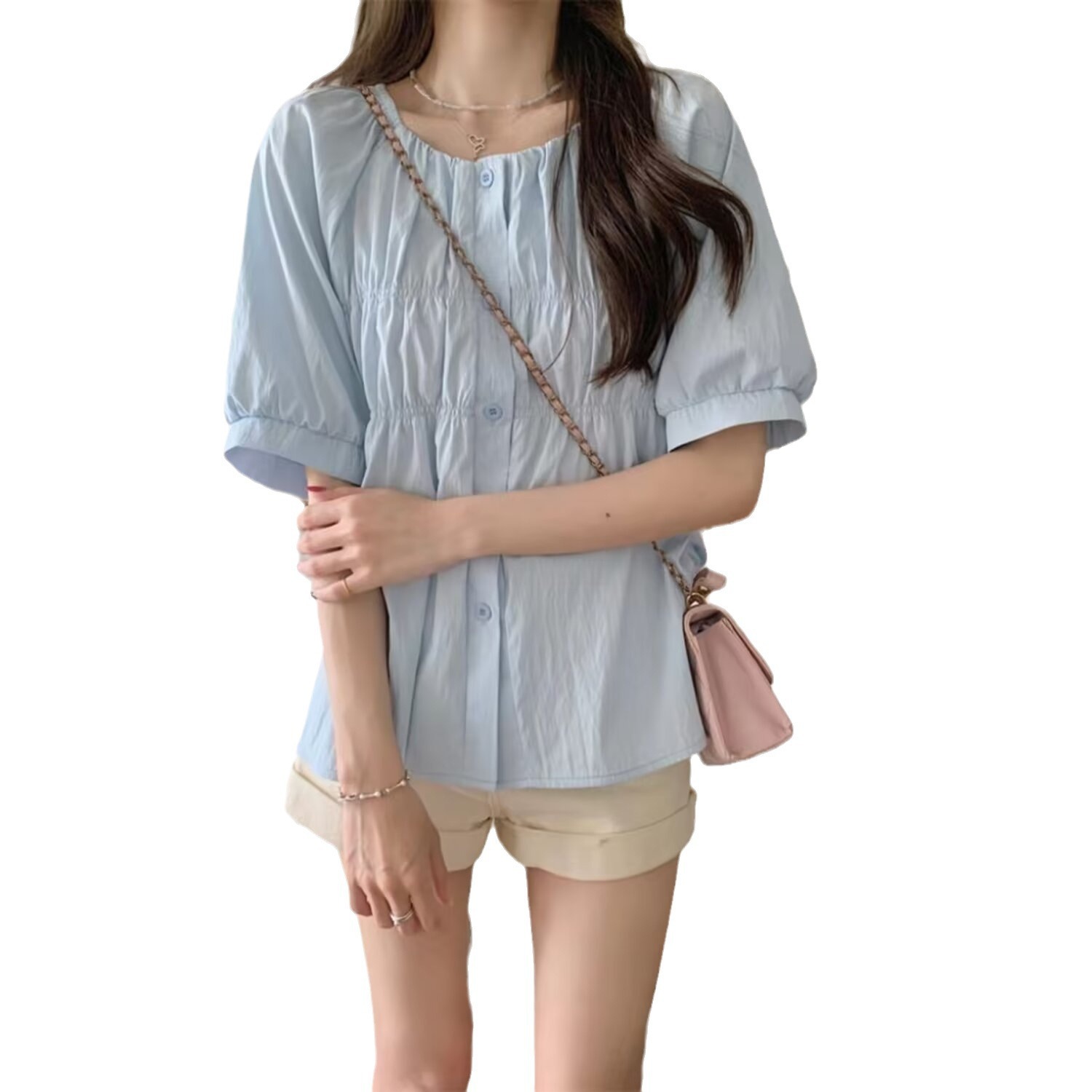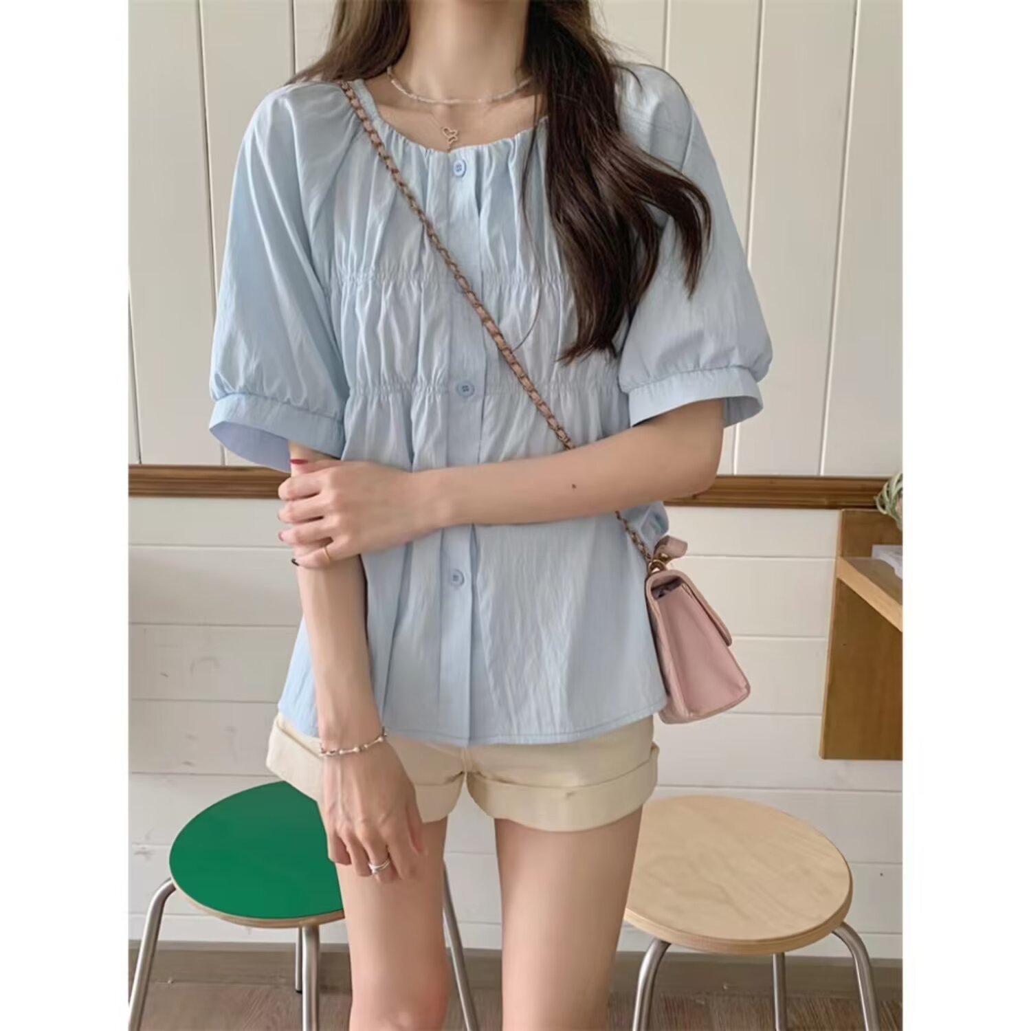 탄성 스퀘어 칼라 셔츠 여성의 여름 디자인 감각 틈새 편안한 슬림 프렌치 탑 달콤한 인형 셔츠스토어 가기