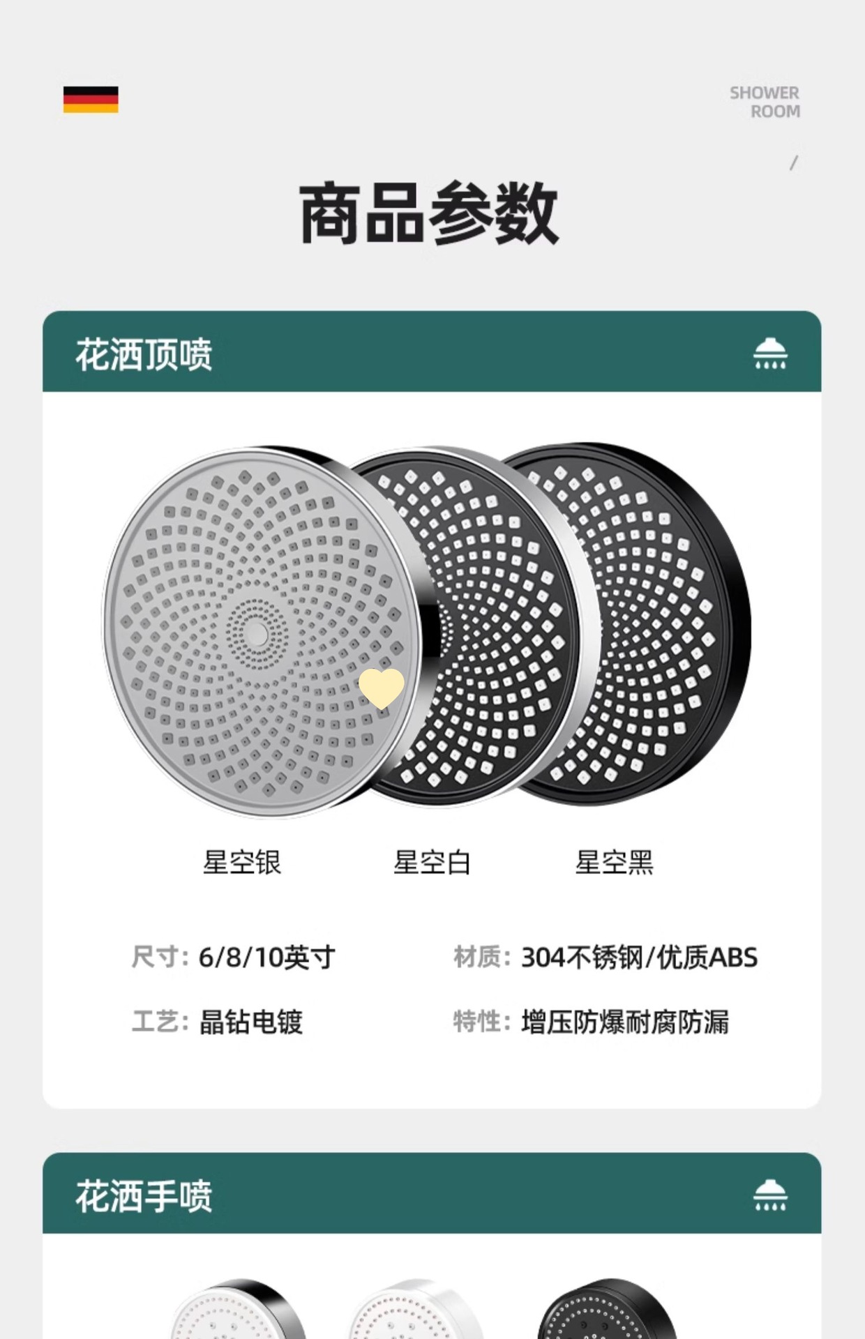 • ⇦⇦⇦[스타실버세트2] 9inch탑스프레이 + 핸드샤워 + 1.5m호스 ↦↦↦