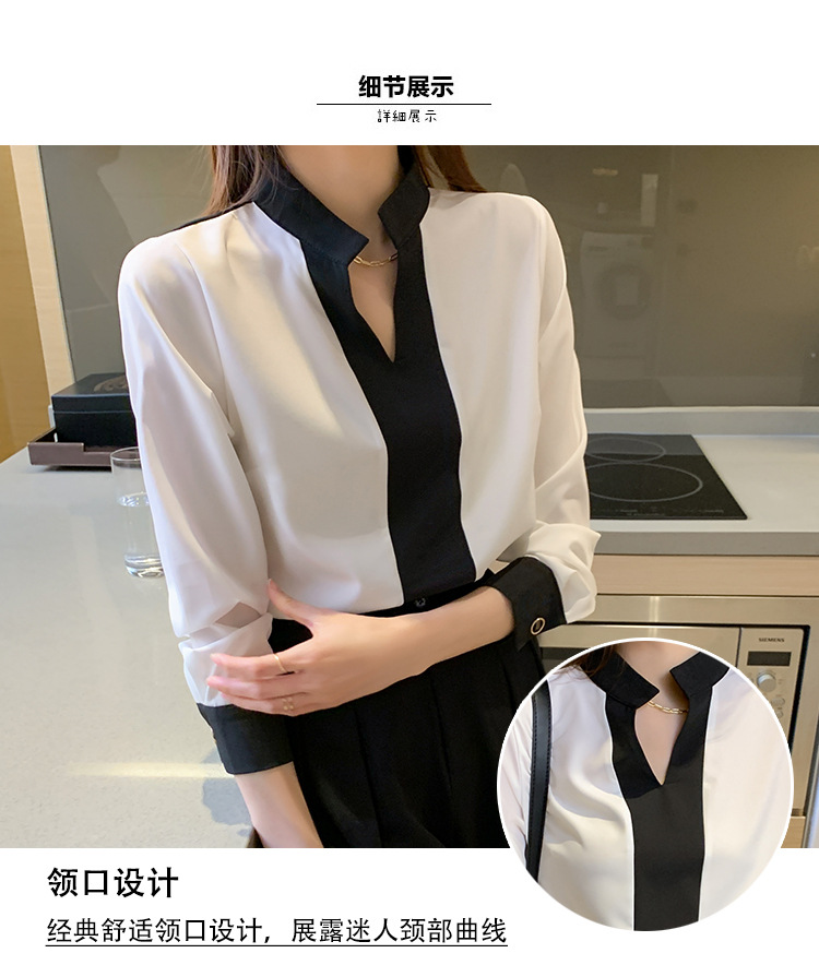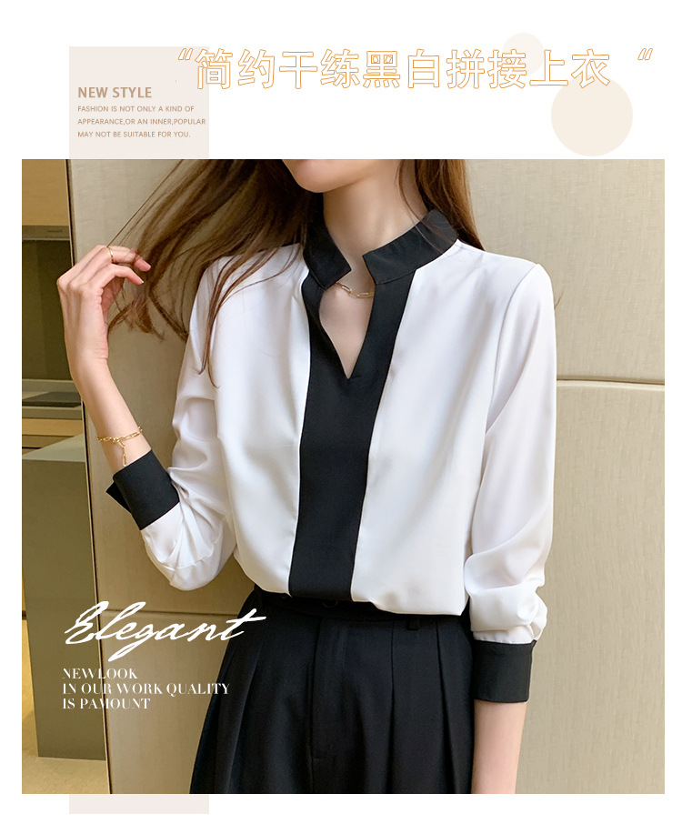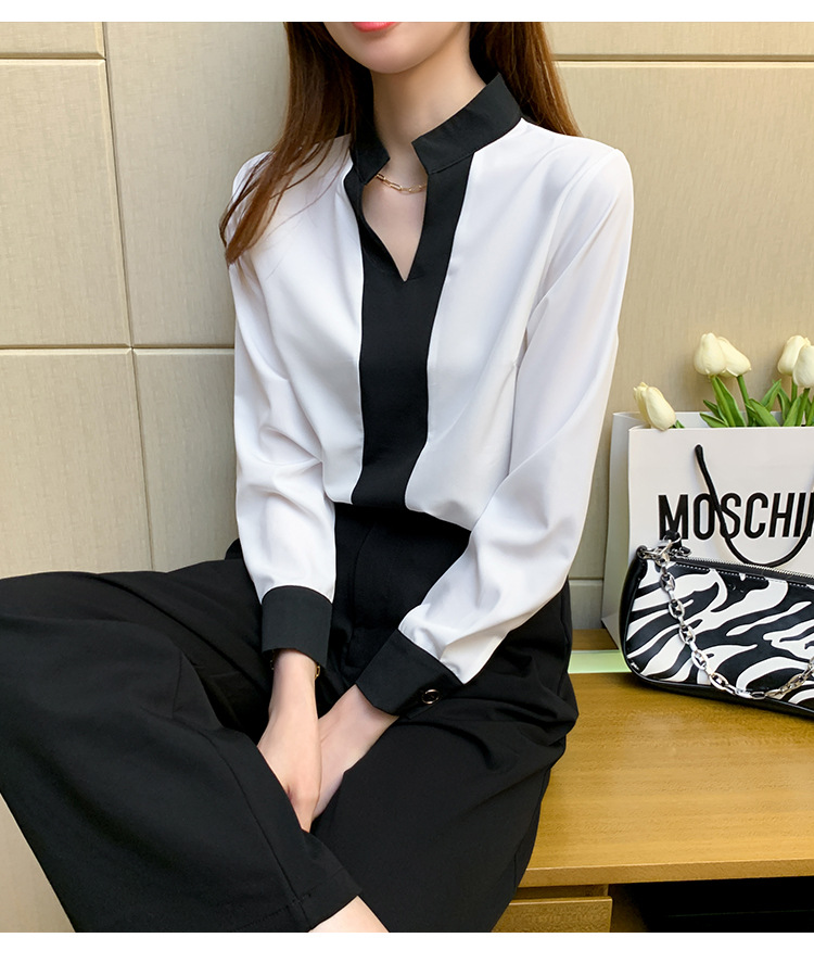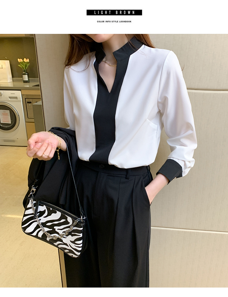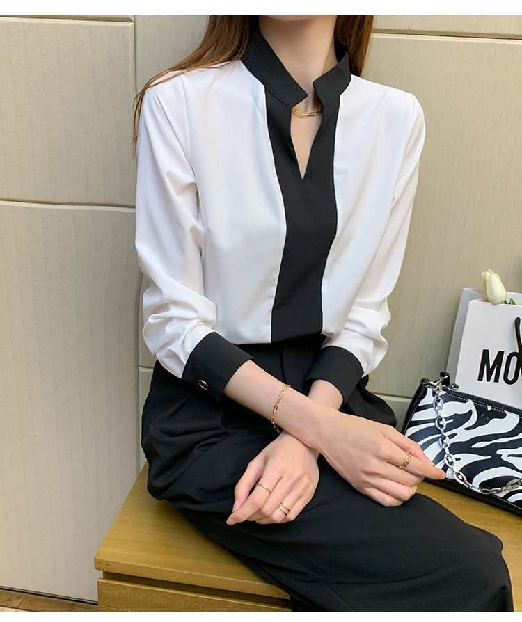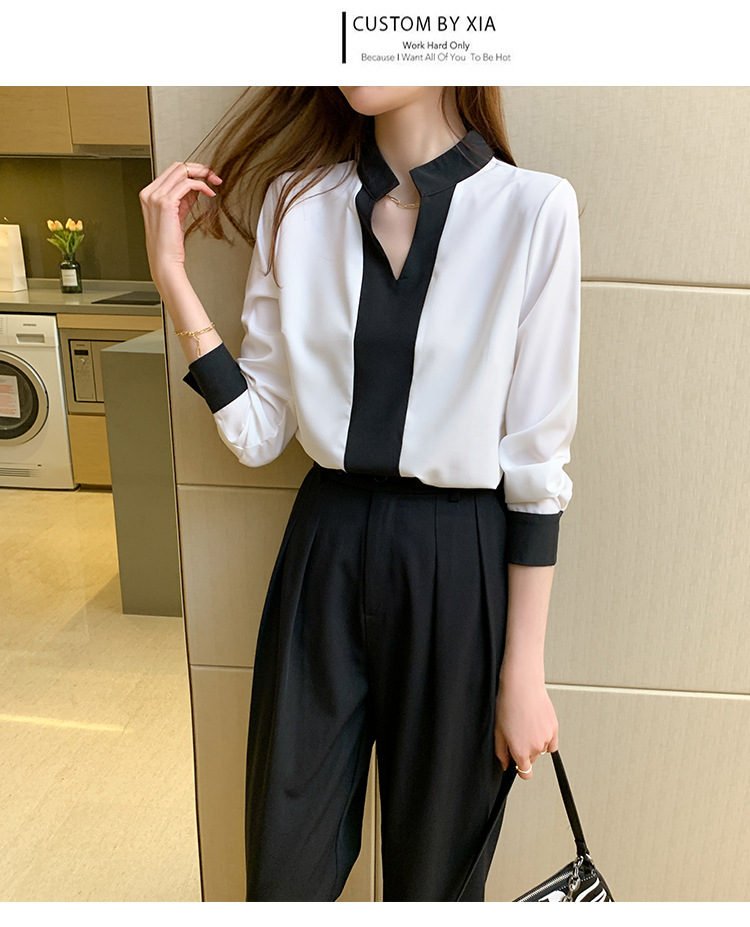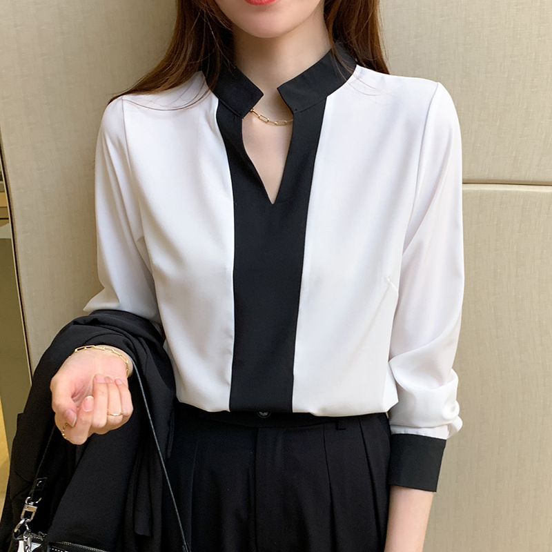 재고 서양식 시폰 셔츠 여성의 2024 가을 새로운 V-목 대비 색상 디자인 틈새 OL 통근 셔츠 탑스토어 가기