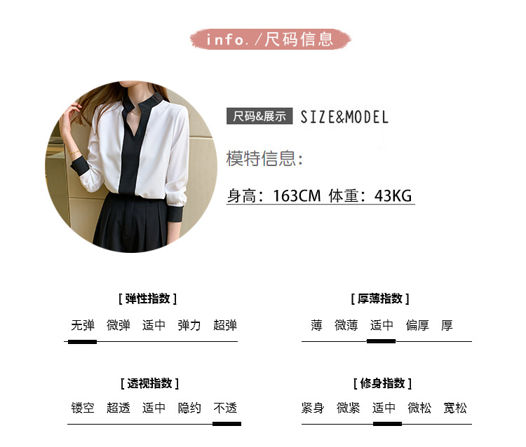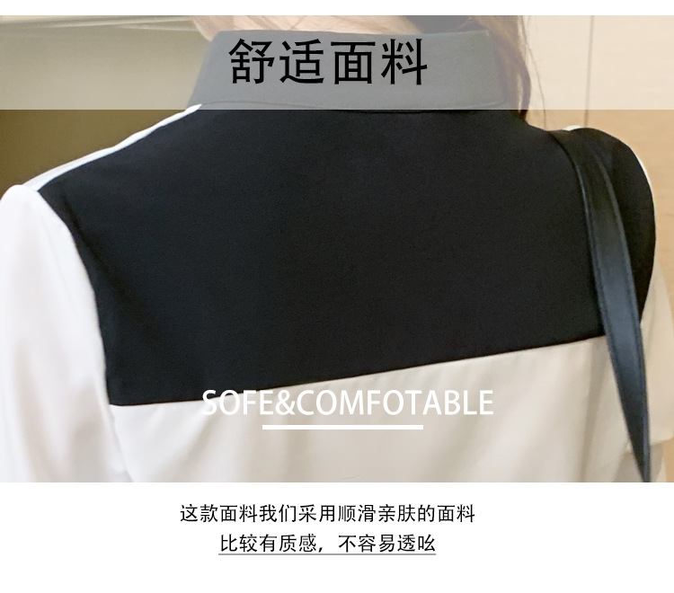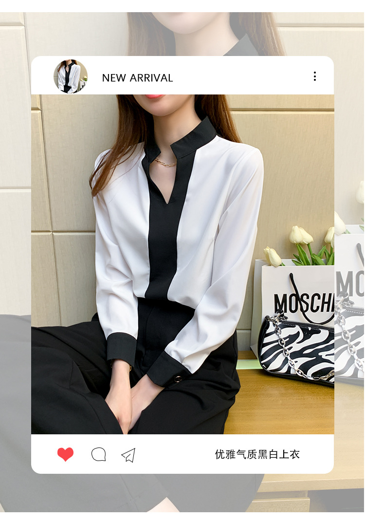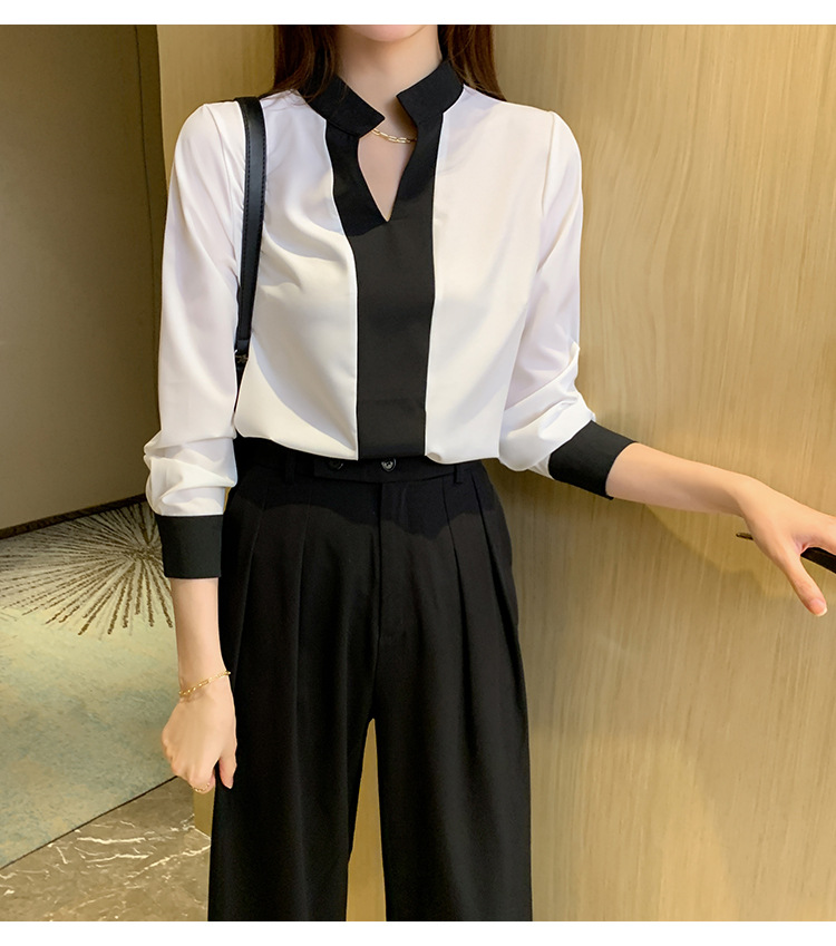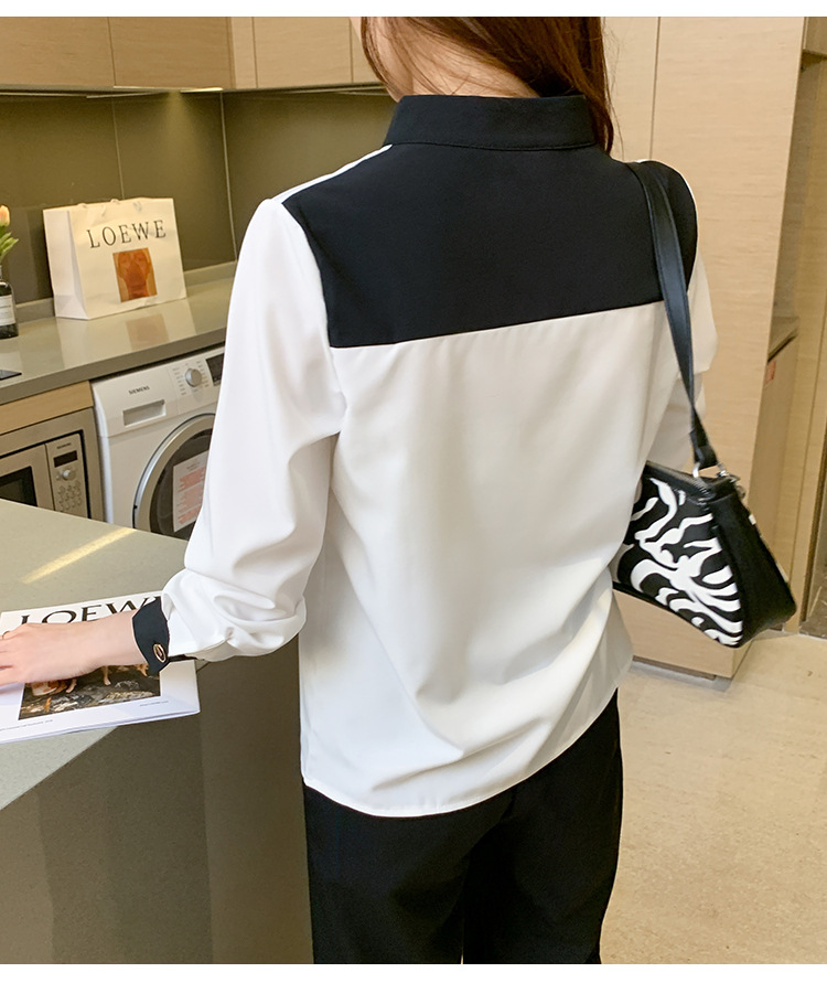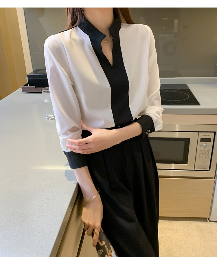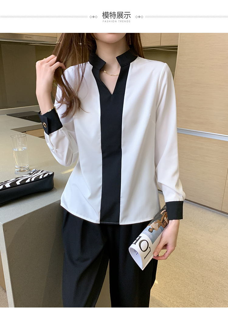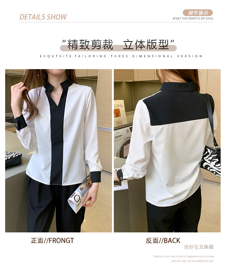 재고 서양식 시폰 셔츠 여성의 2024 가을 새로운 V-목 대비 색상 디자인 틈새 OL 통근 셔츠 탑스토어 가기