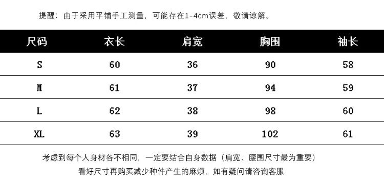 因裁剪工艺和丈量手法不同,可能存在1~3CM 左右误差,尺码仅供参考,以实物为准