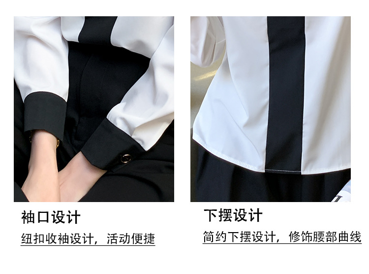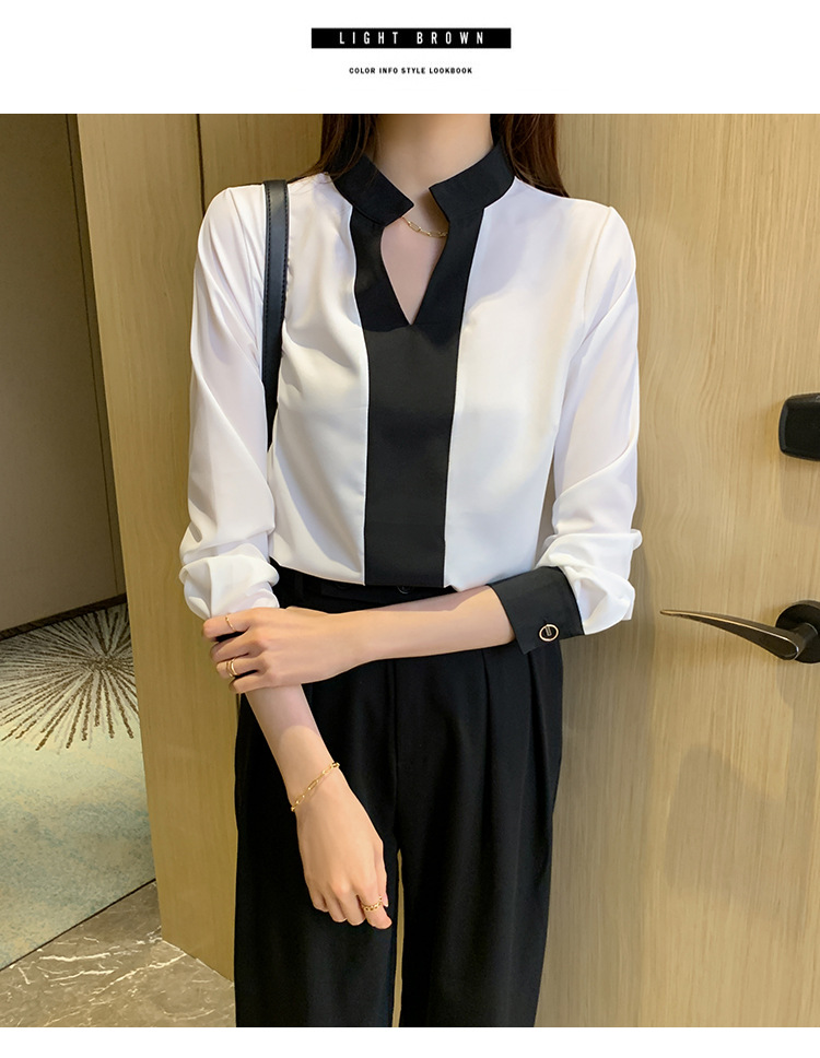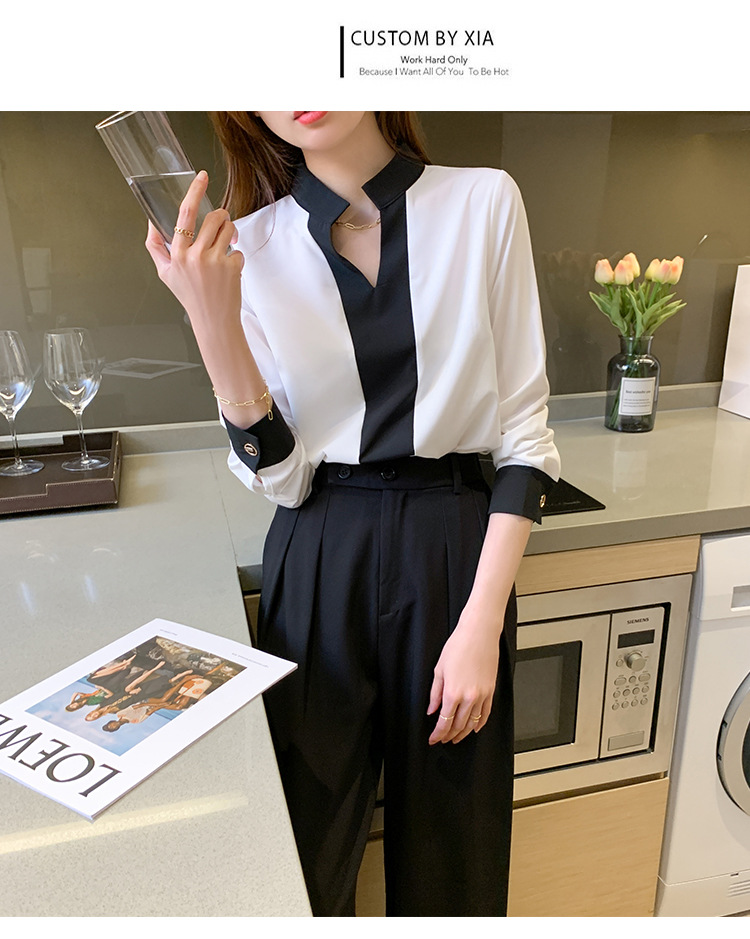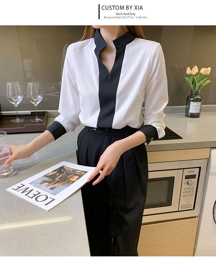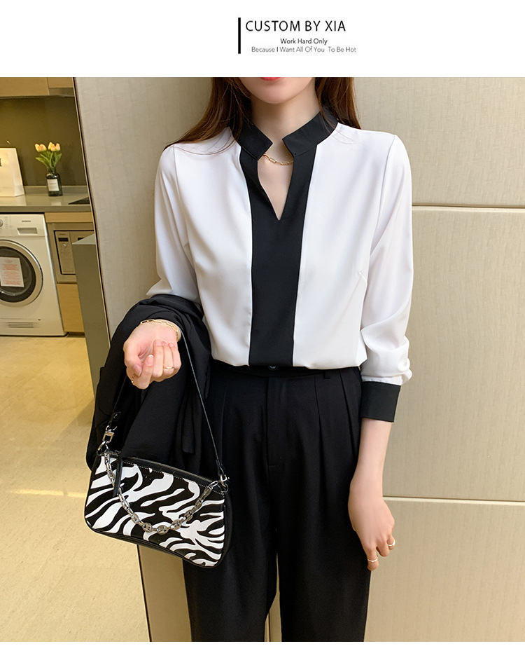 재고 서양식 시폰 셔츠 여성의 2024 가을 새로운 V-목 대비 색상 디자인 틈새 OL 통근 셔츠 탑