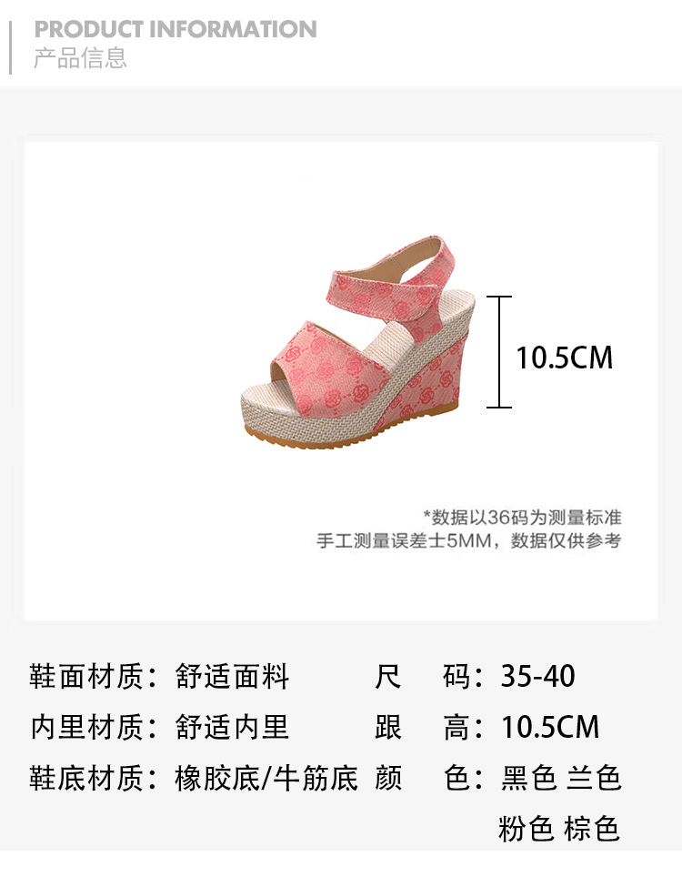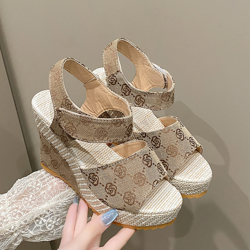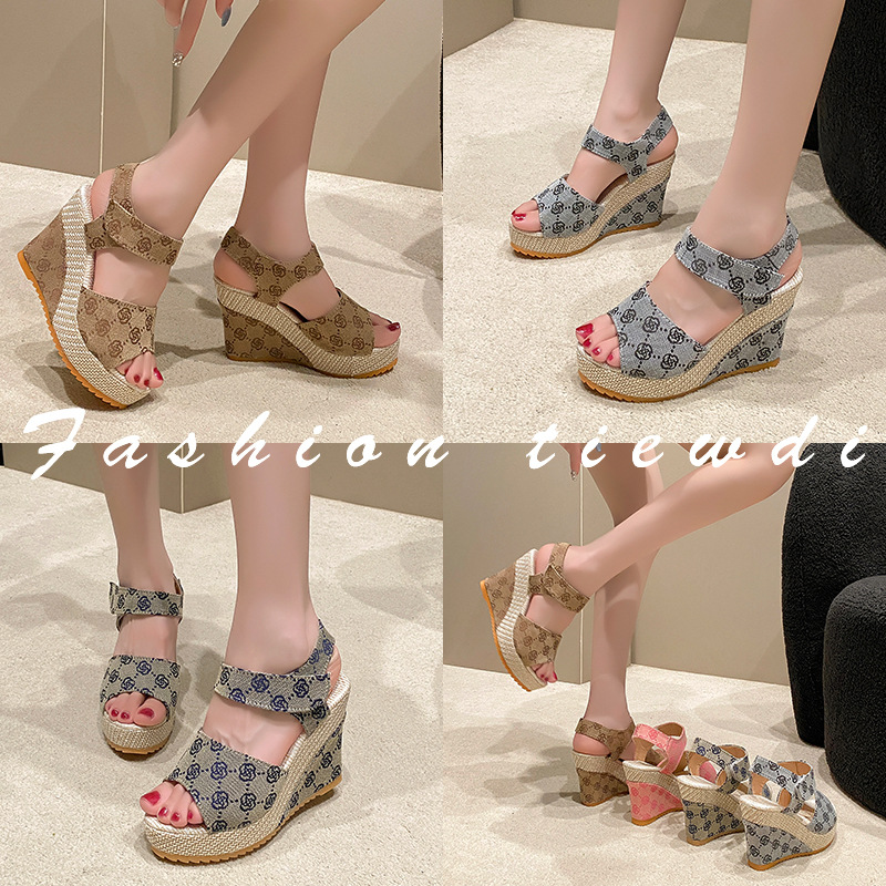 유럽과 미국의 대외 무역 대형 자수 웨지 피쉬 입 샌들 여성용 크로스 보더 하이힐 벨크로 오픈 토우 로마 신발 Amazon스토어 가기