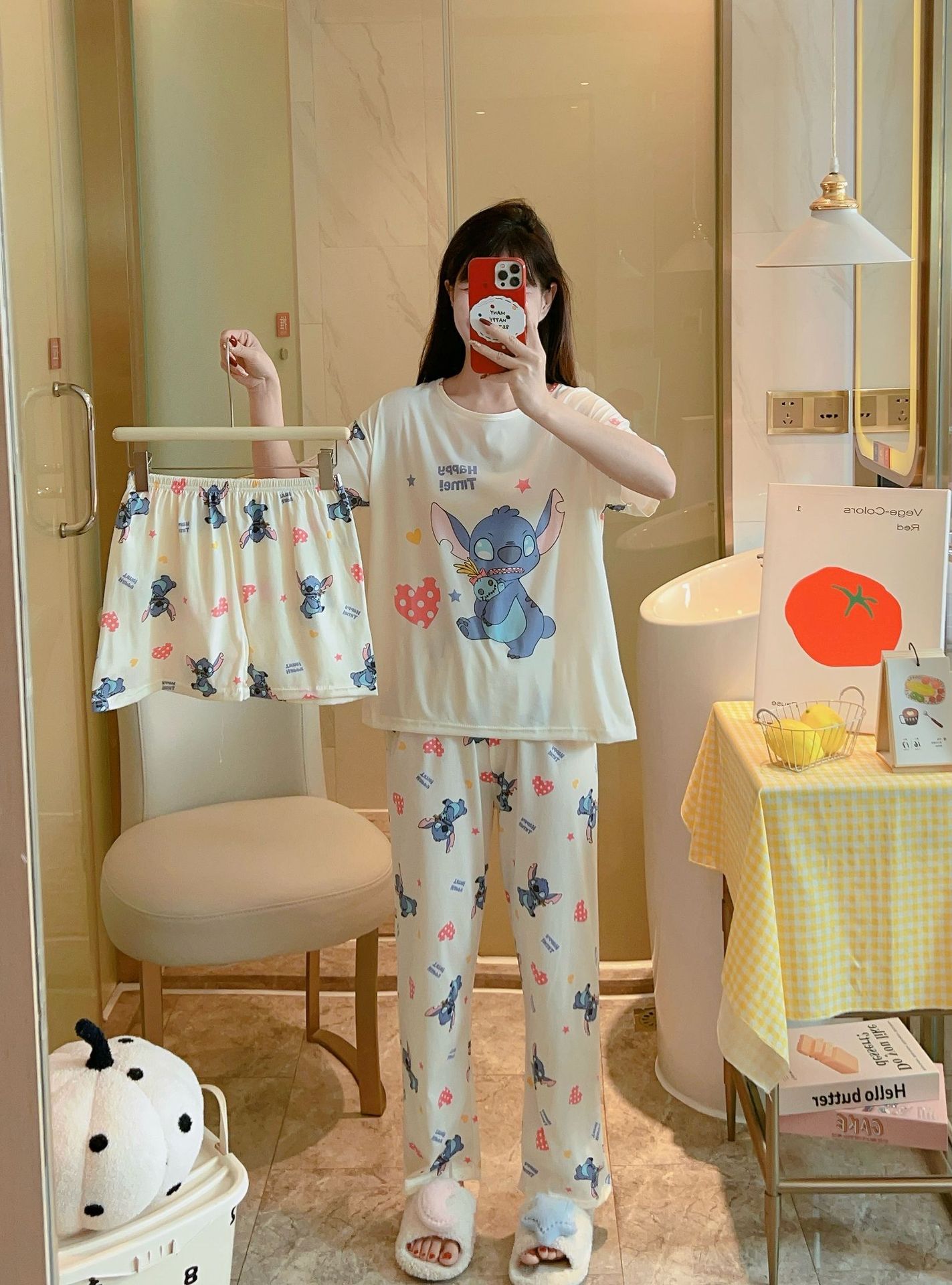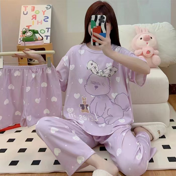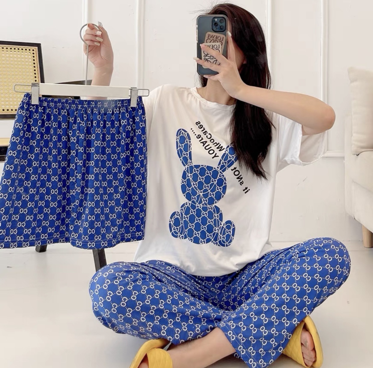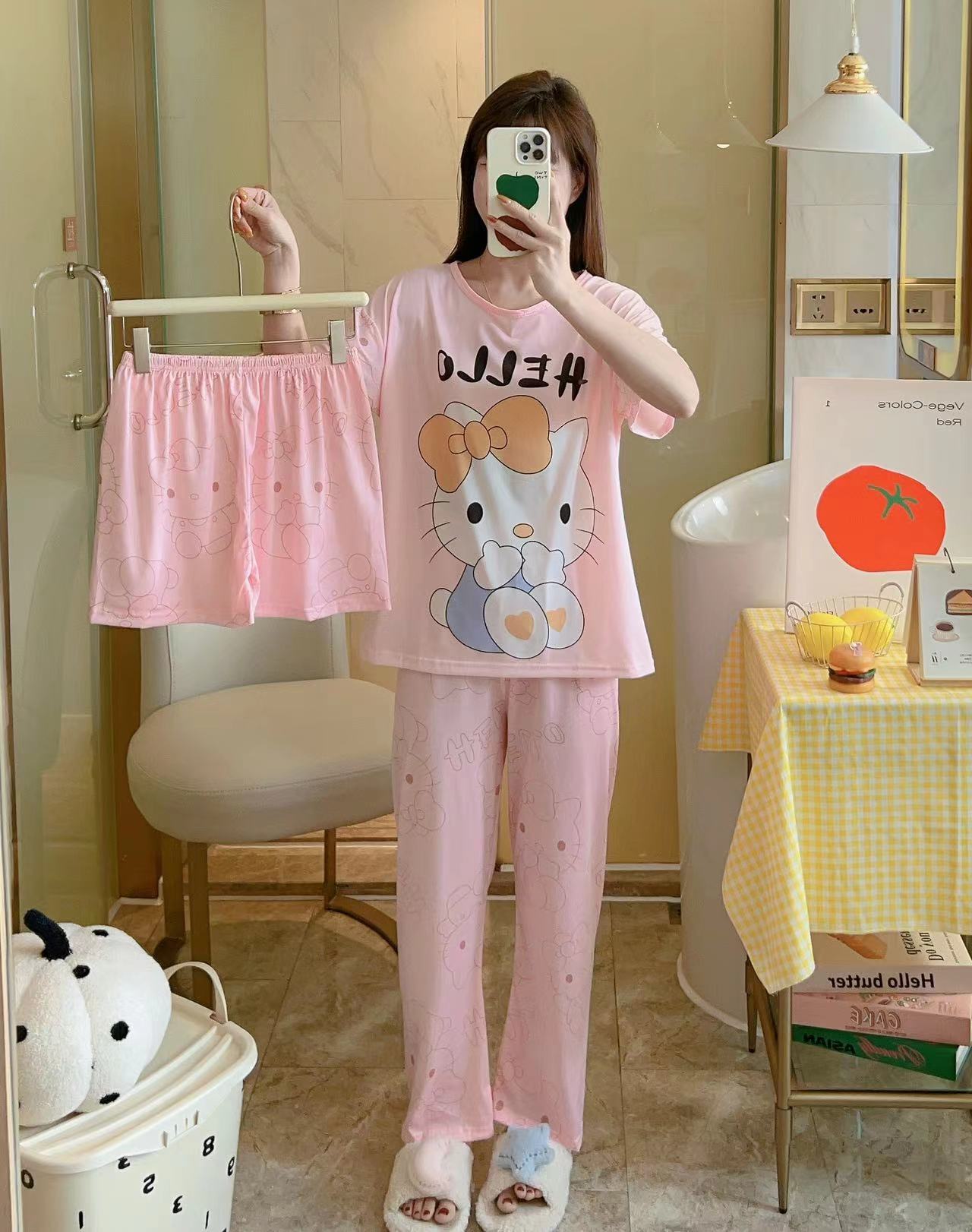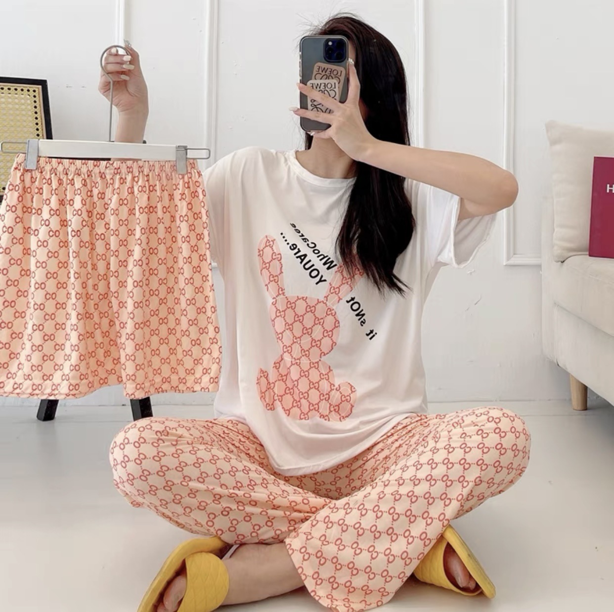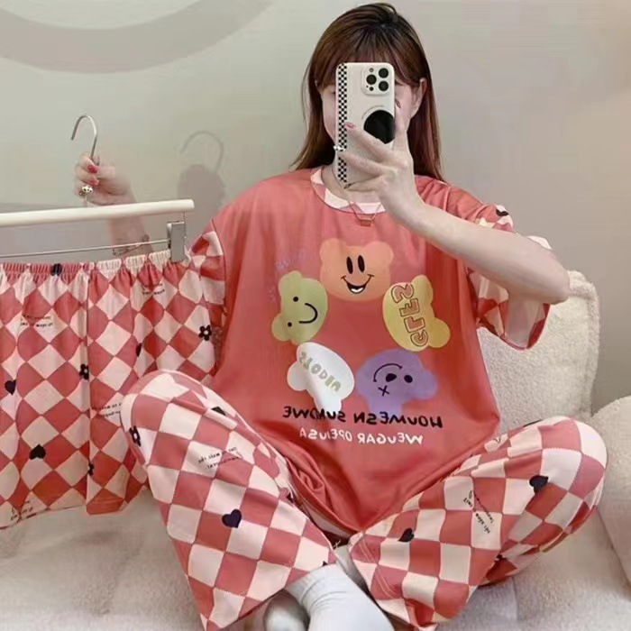 대외 무역 국경 파자마 여성 여름 3 종 세트 여름 얇은 반팔 반바지 바지 달콤한 귀여운 여성용 홈 옷