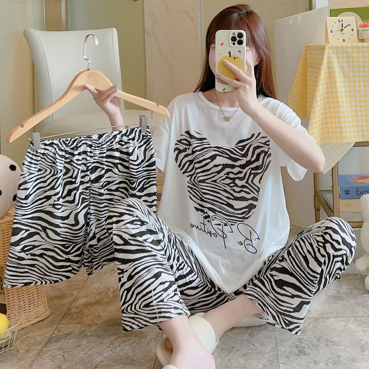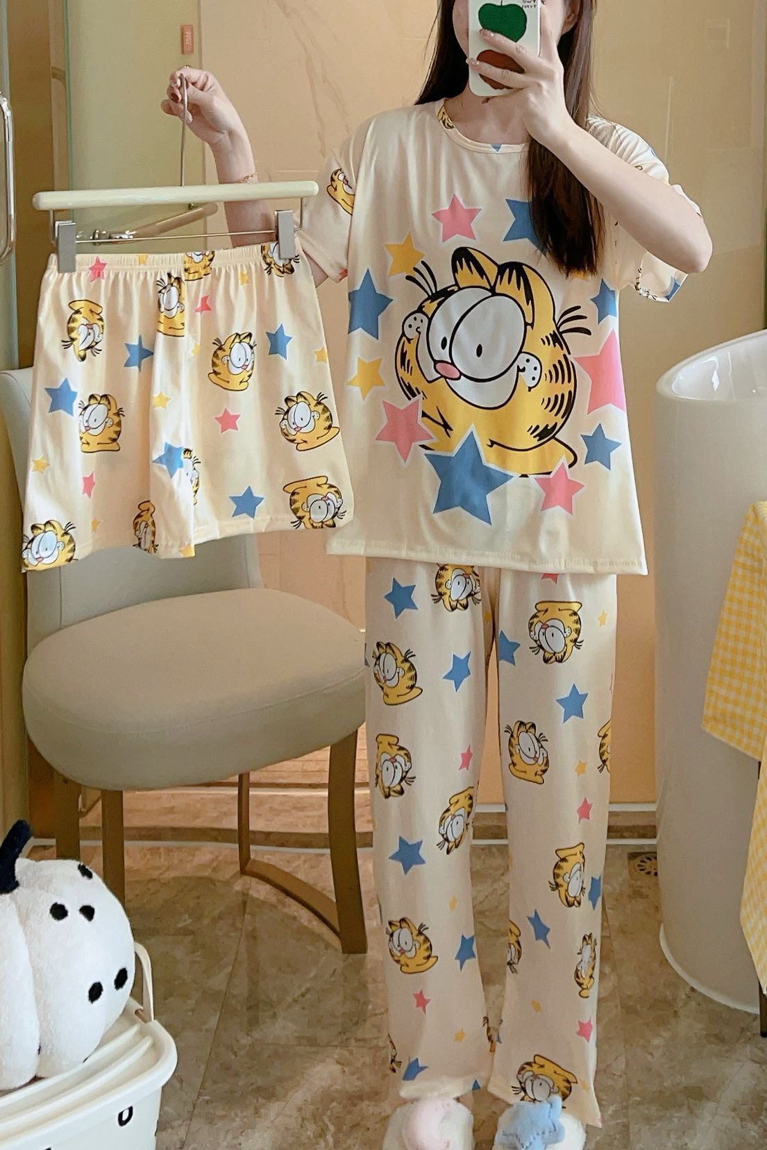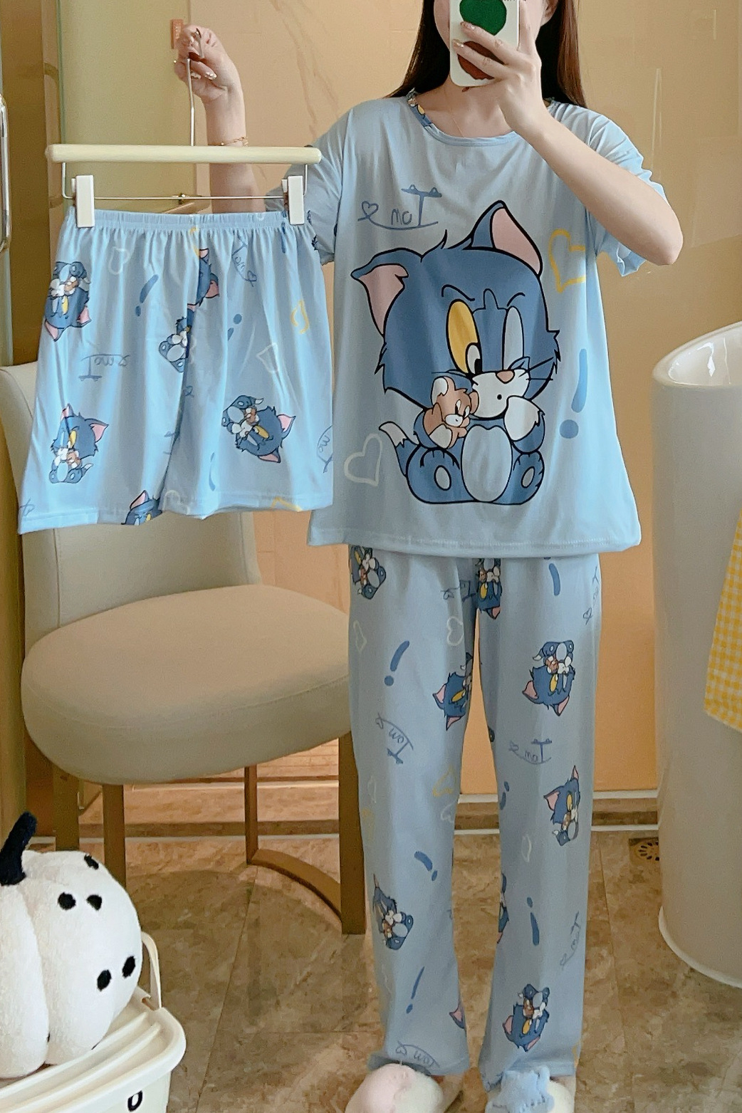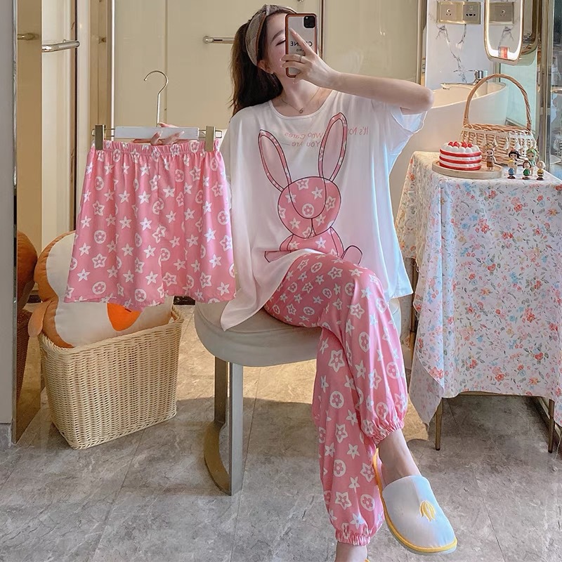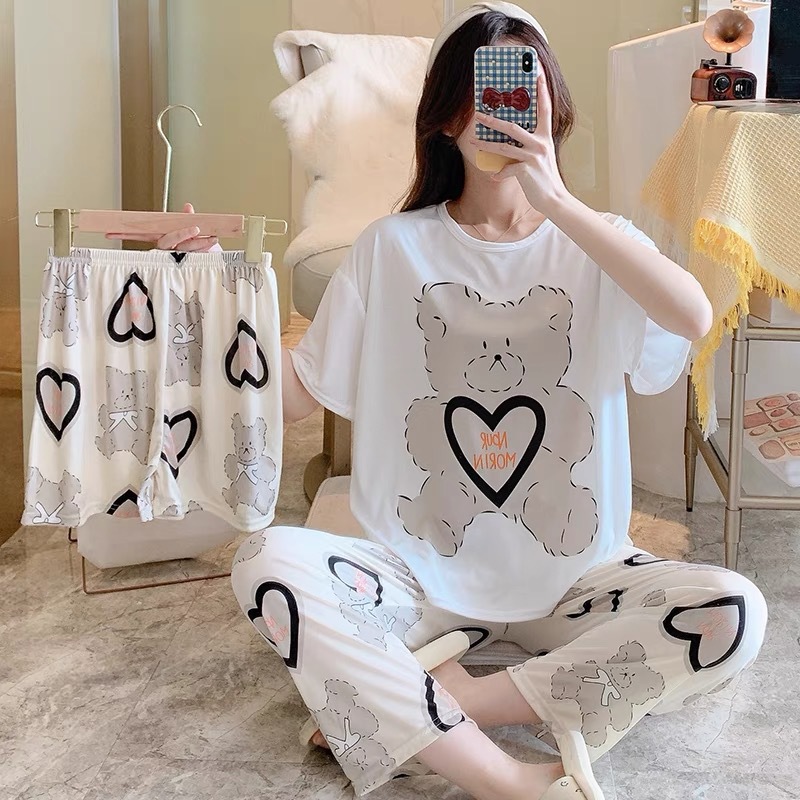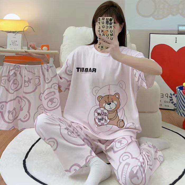 대외 무역 국경 파자마 여성 여름 3 종 세트 여름 얇은 반팔 반바지 바지 달콤한 귀여운 여성용 홈 옷스토어 가기