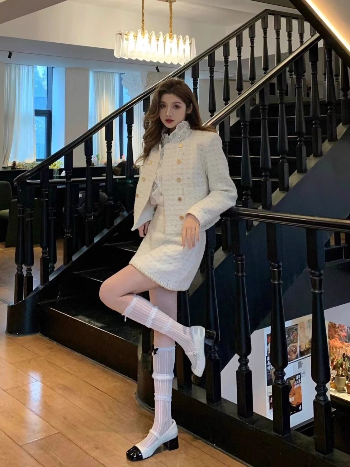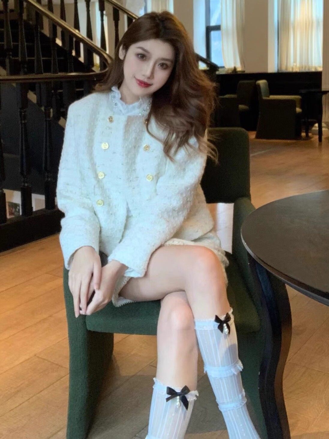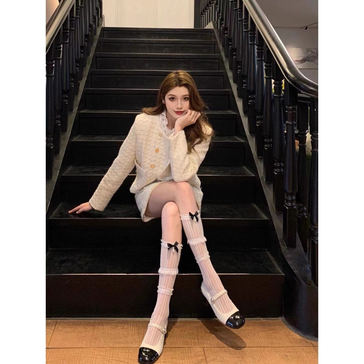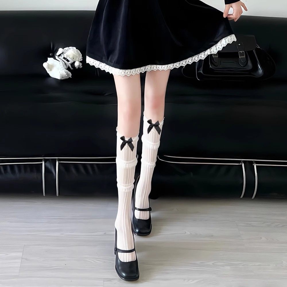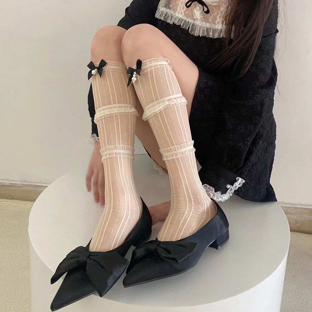 발레 스타일 화이트 레이스 실크 스타킹 레이스 보우 매듭 송아지 스타킹 메리 제인 신발 및 스타킹 여름 얇은 긴 JK 스타킹스토어 가기