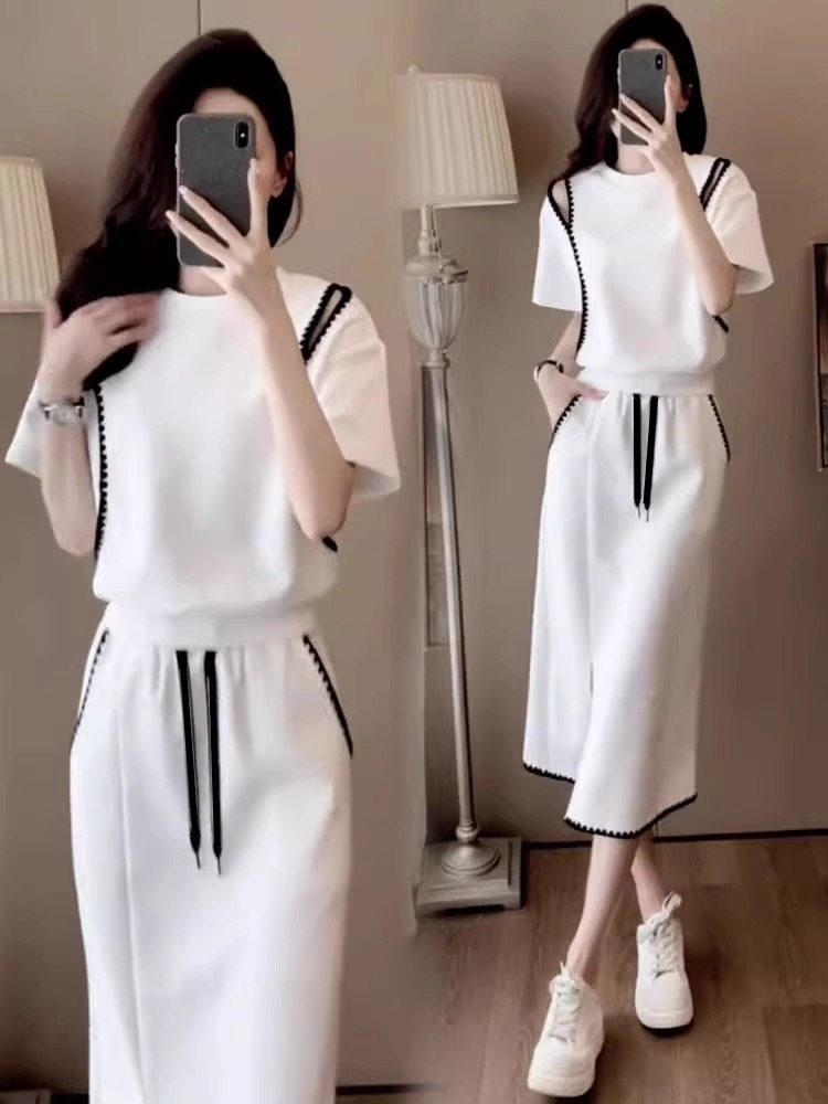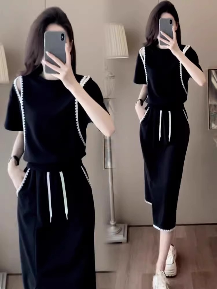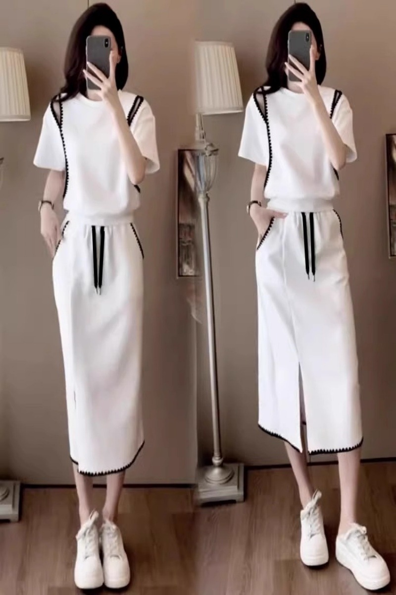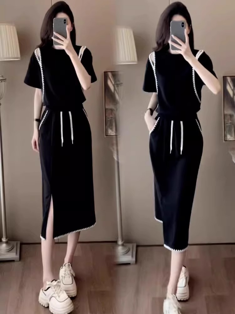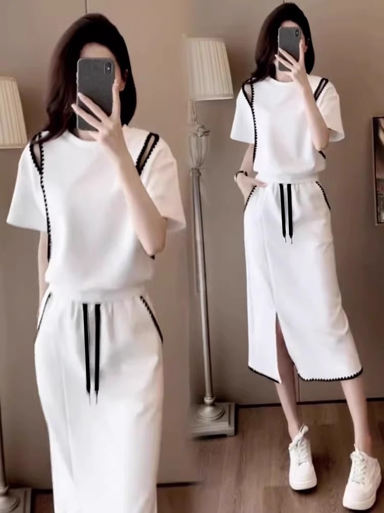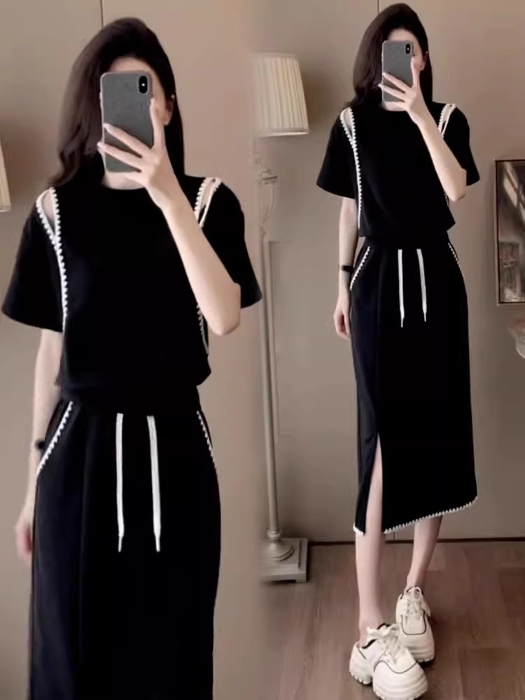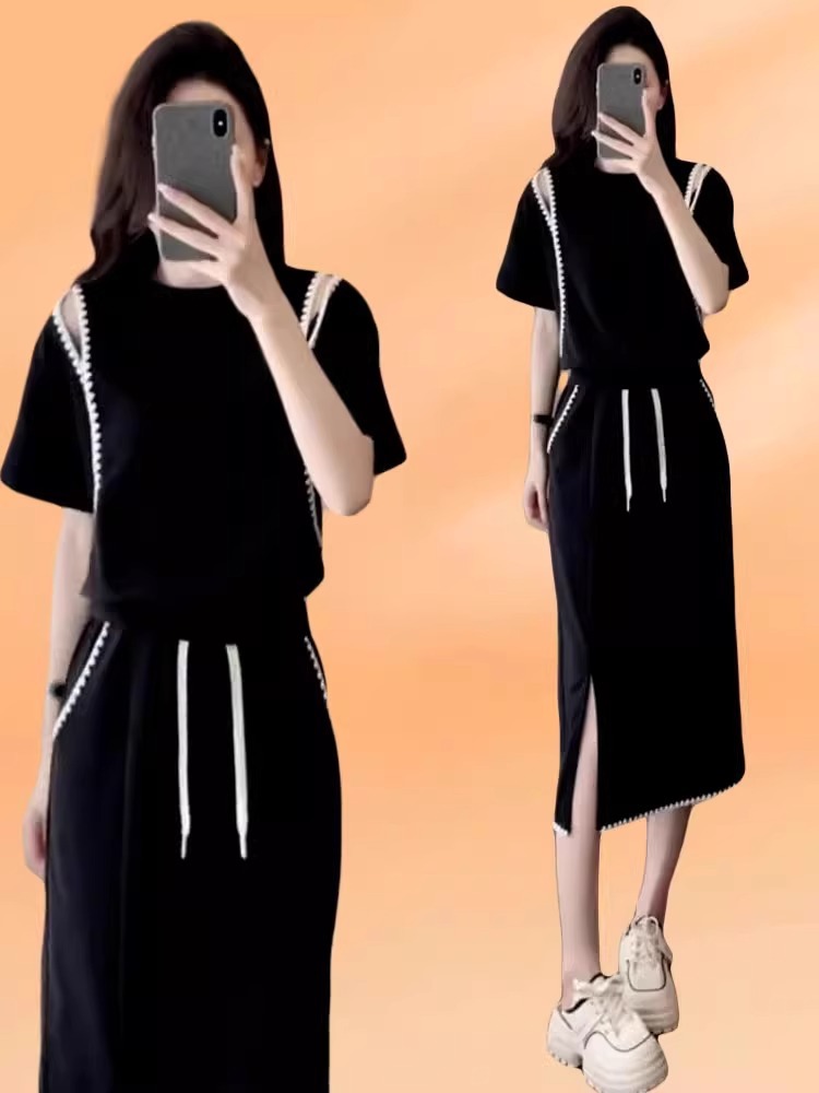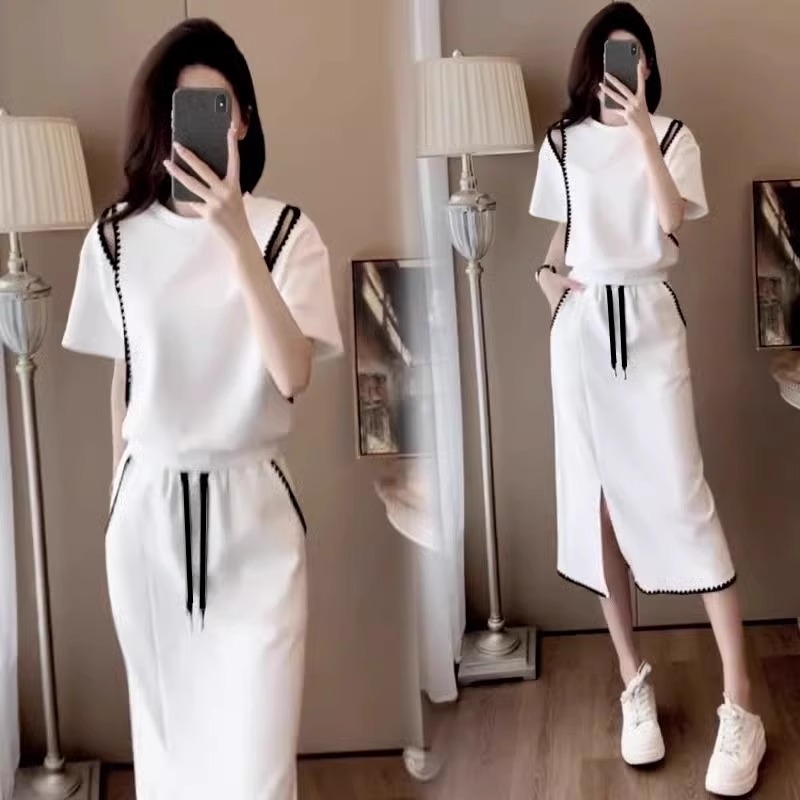 캐주얼 패션 여성 정장 스커트 2026 여름 신상품, 우아하고 젊어 보이는 탑과 슬릿 스커트 투피스 세트스토어 가기