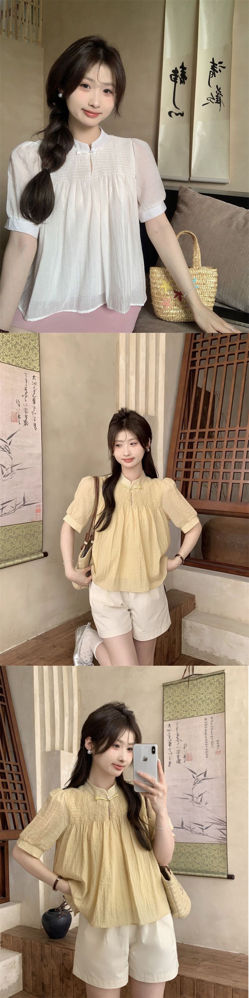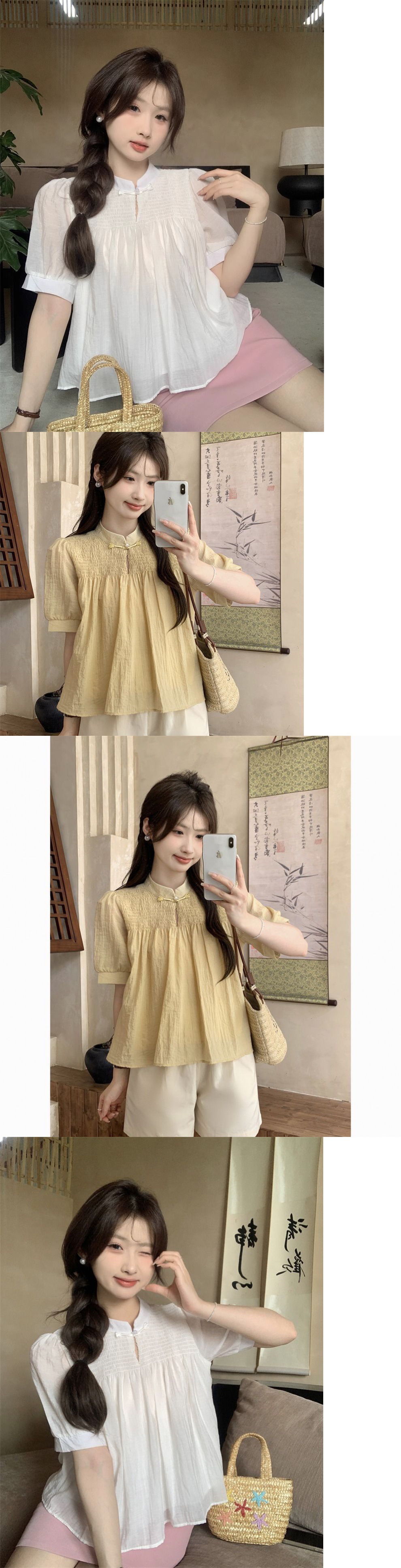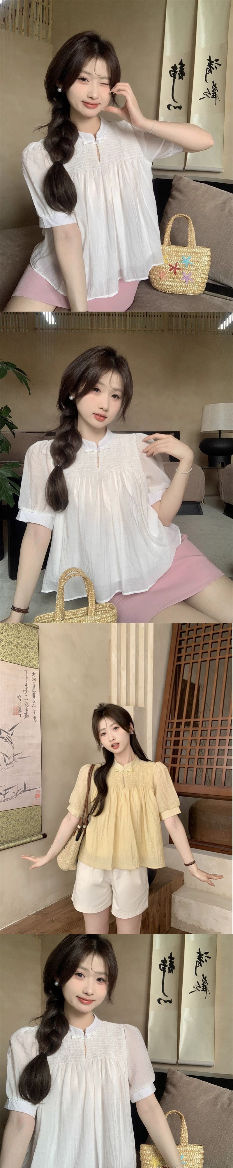여성을위한 새로운 중국 스타일 버튼 반팔 쉬폰 셔츠 2024 여름 새로운 달콤한 짧은 인형 셔츠스토어 가기