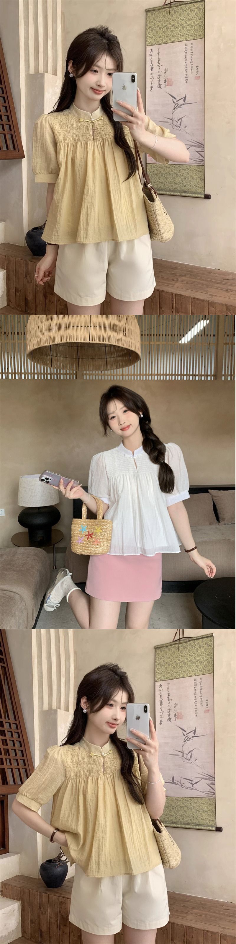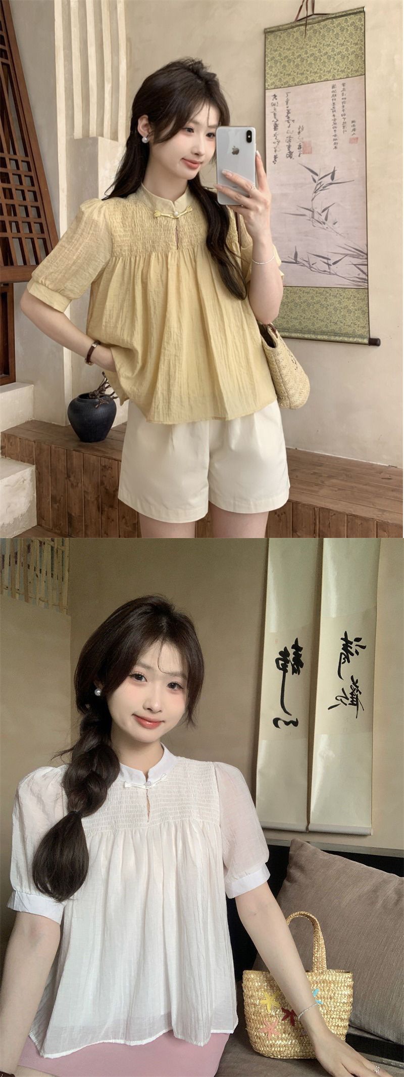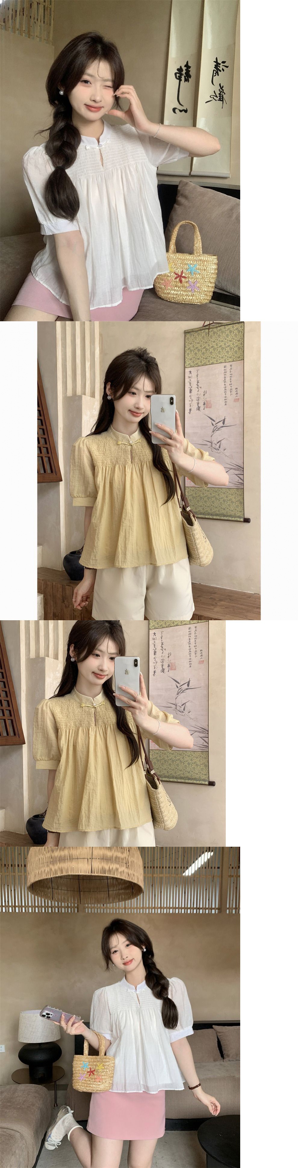 여성을위한 새로운 중국 스타일 버튼 반팔 쉬폰 셔츠 2024 여름 새로운 달콤한 짧은 인형 셔츠스토어 가기