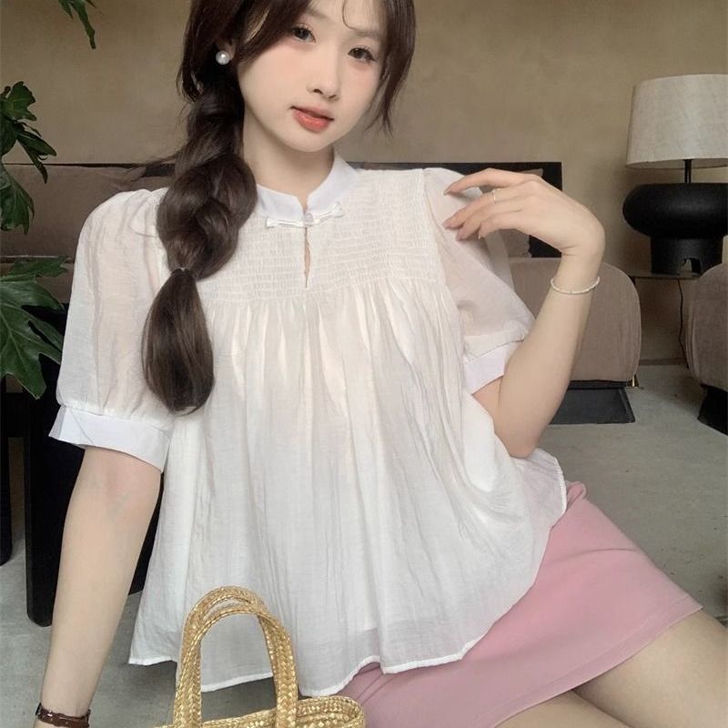여성을위한 새로운 중국 스타일 버튼 반팔 쉬폰 셔츠 2024 여름 새로운 달콤한 짧은 인형 셔츠