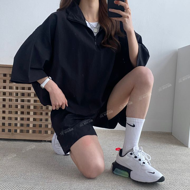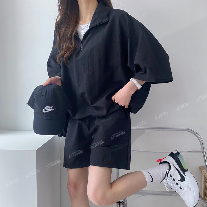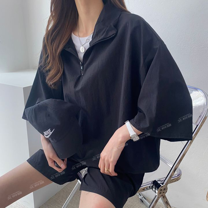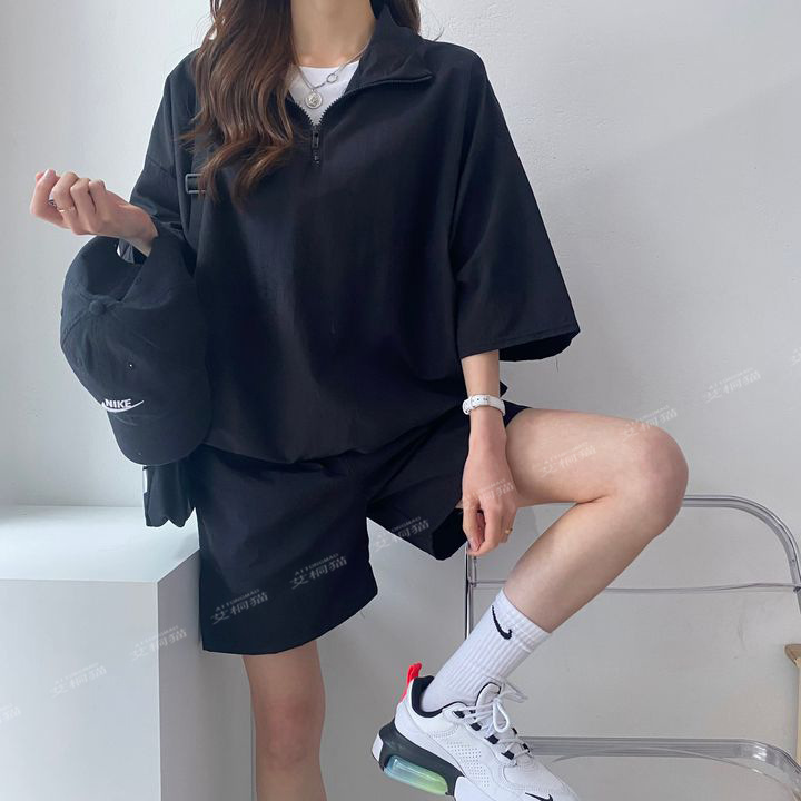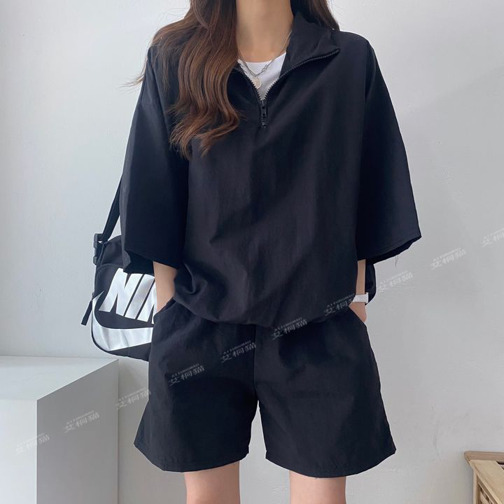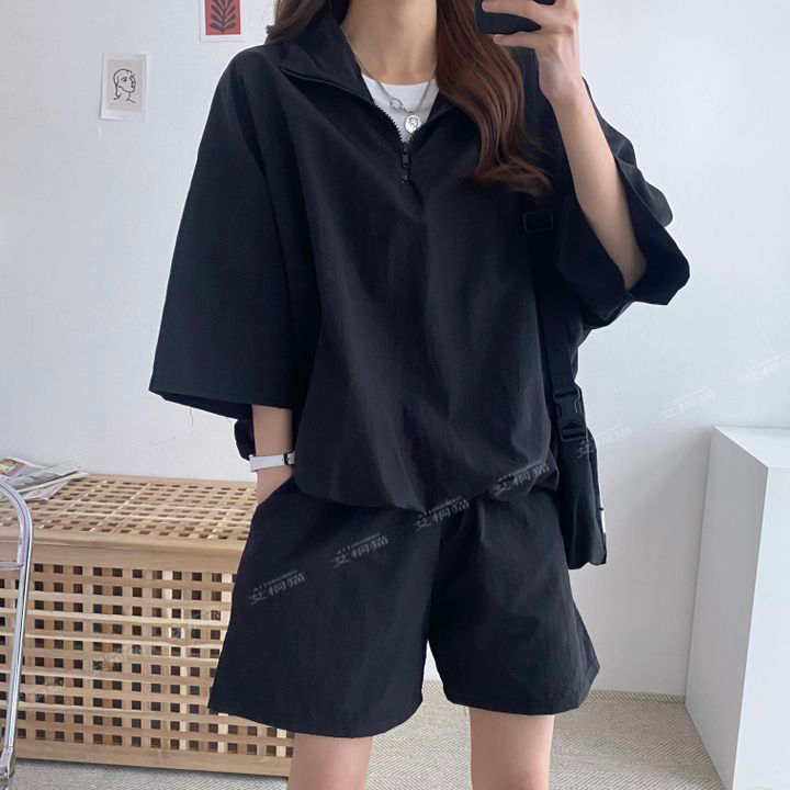 [대량 재고] 한국식 루즈한 스탠드 칼라 미드슬리브 캐주얼 스포츠 정장 여성 한국식 얇은 반바지