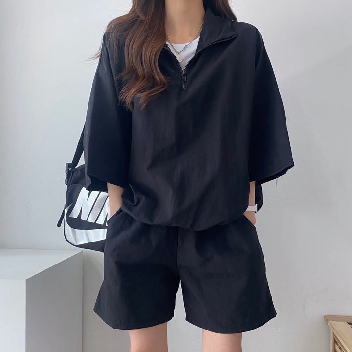 [대량 재고] 한국식 루즈한 스탠드 칼라 미드슬리브 캐주얼 스포츠 정장 여성 한국식 얇은 반바지스토어 가기