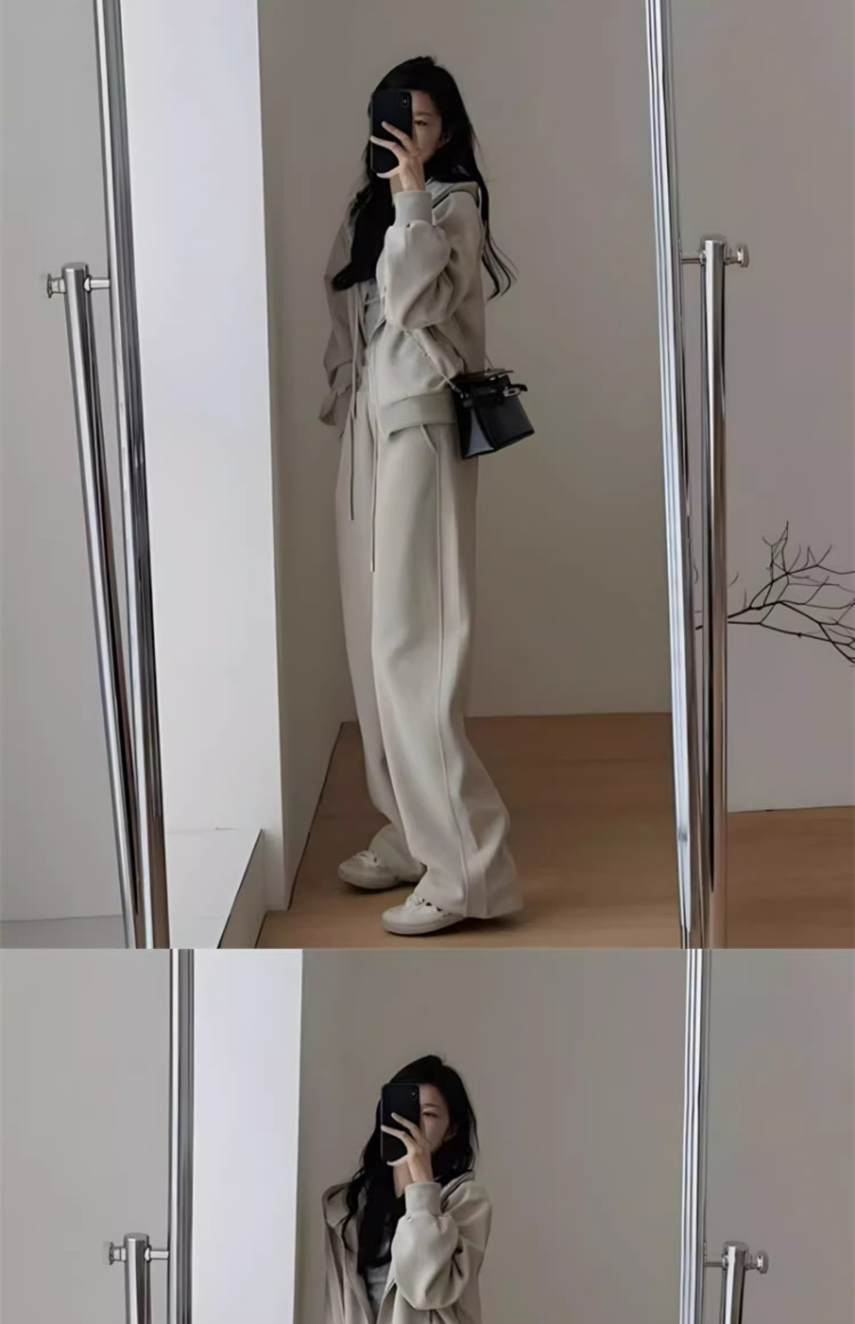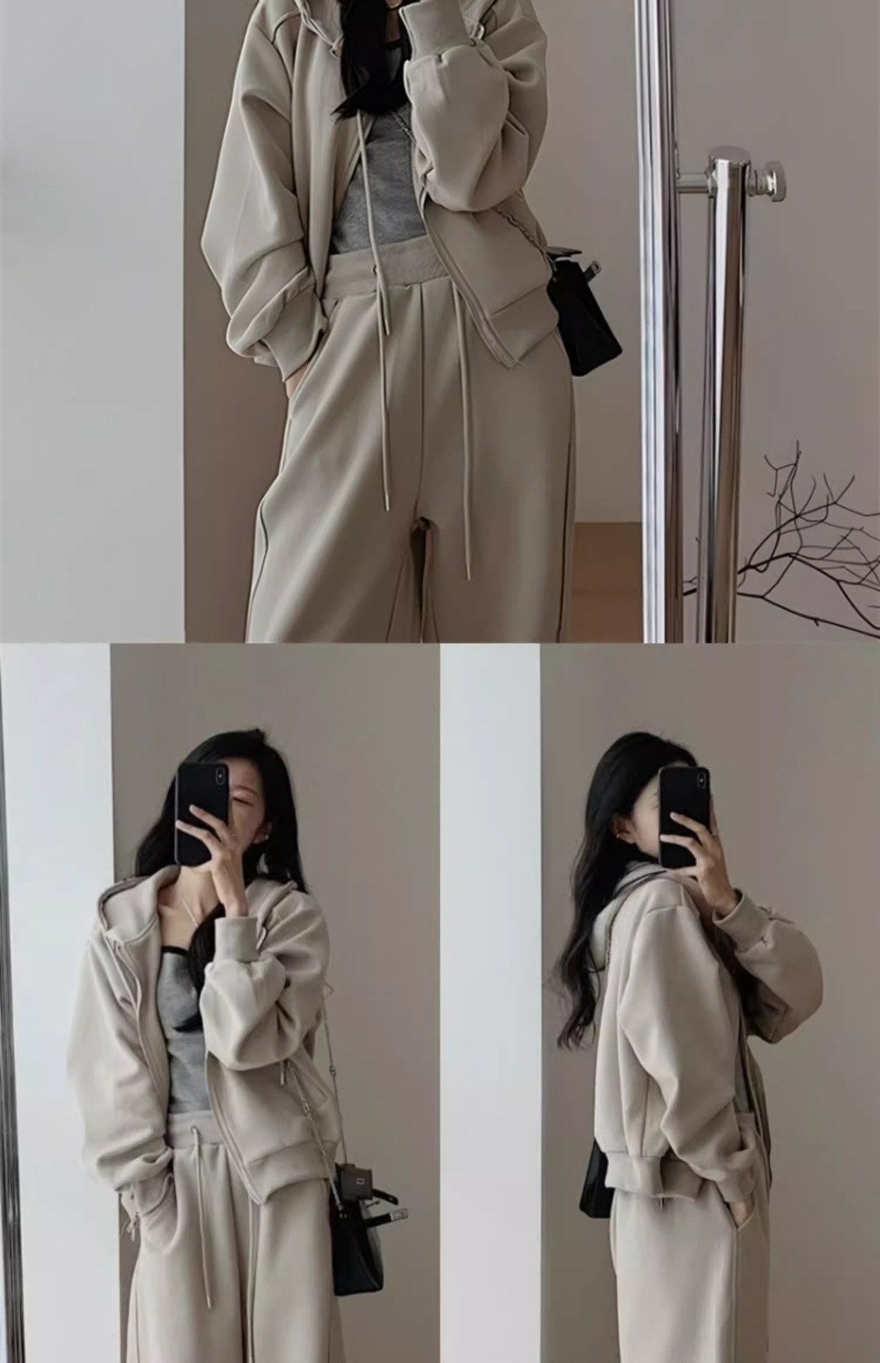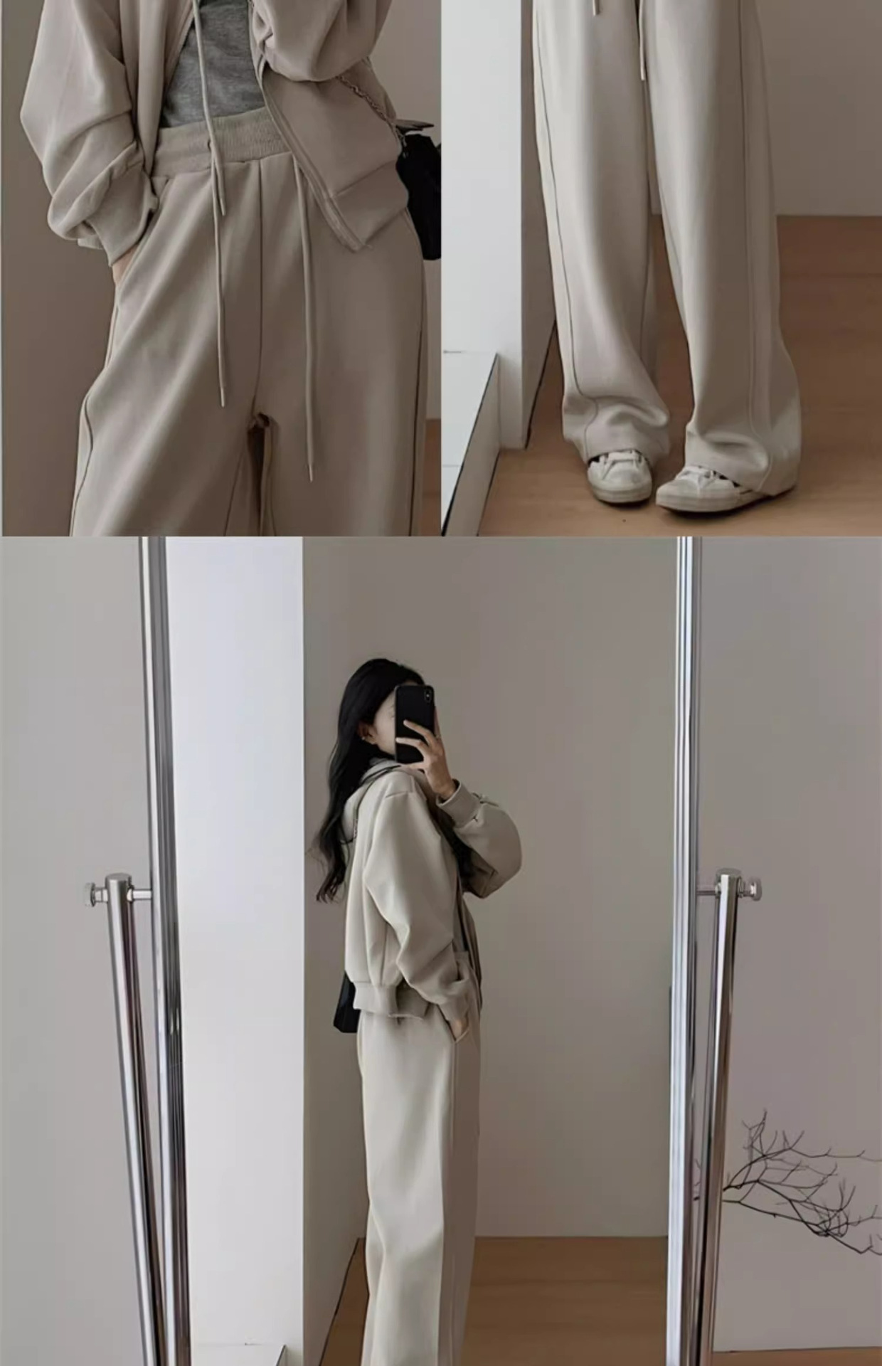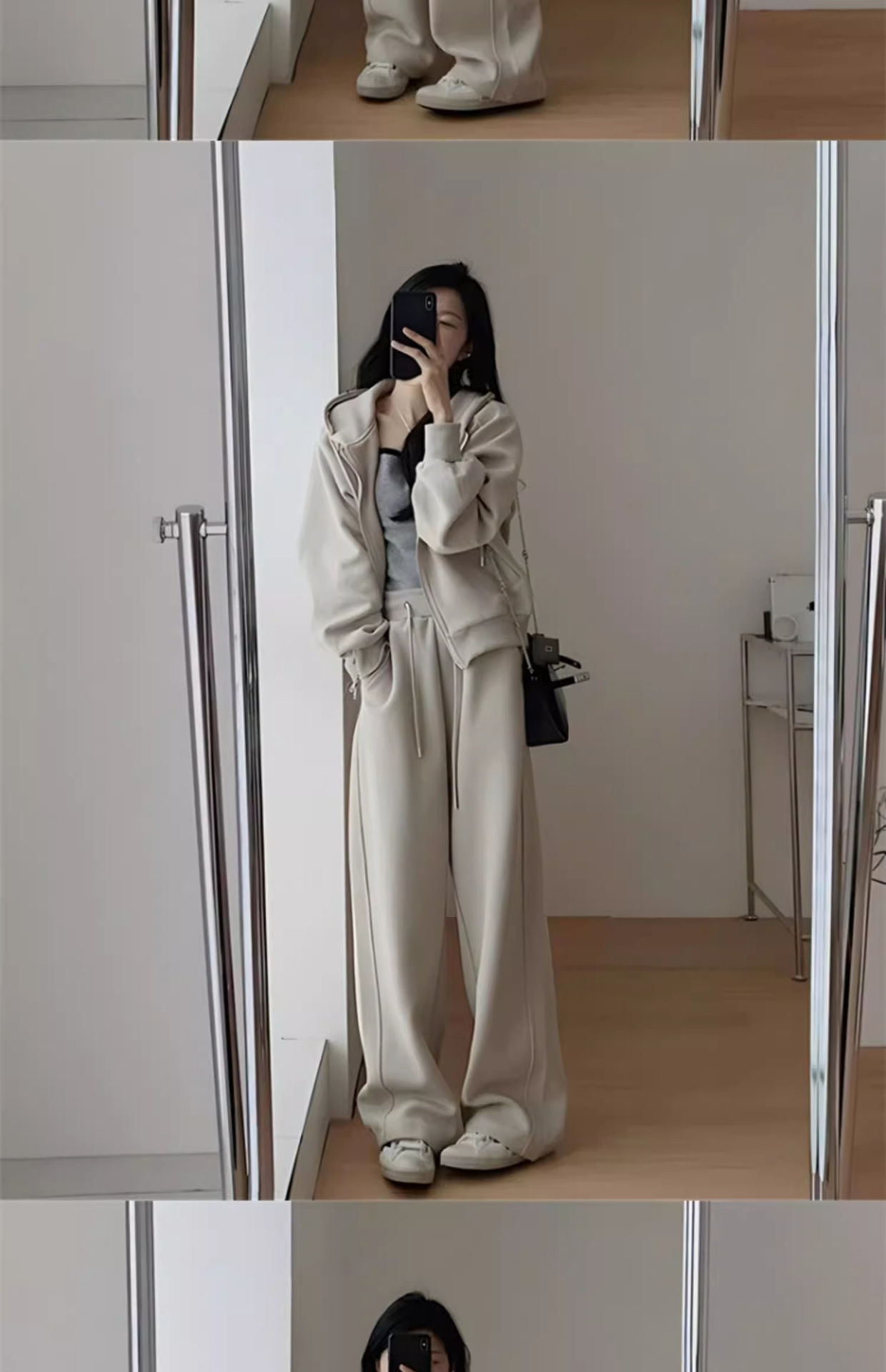 초가을 여성 캐주얼 스웨트셔츠 스포츠 슈트, 패셔너블한 슬림핏과 나이를 줄여주는 와이드 팬츠, 후드 달린 런닝 투피스 세트스토어 가기