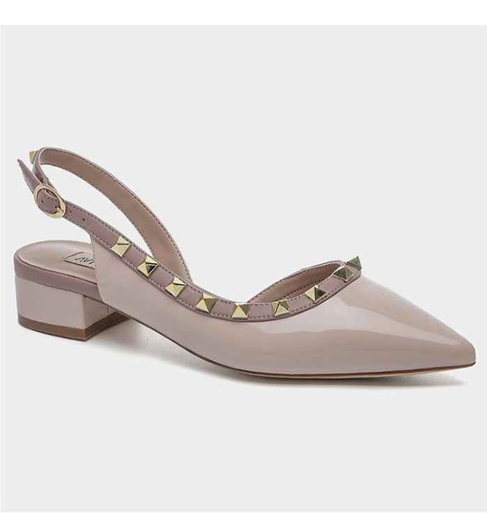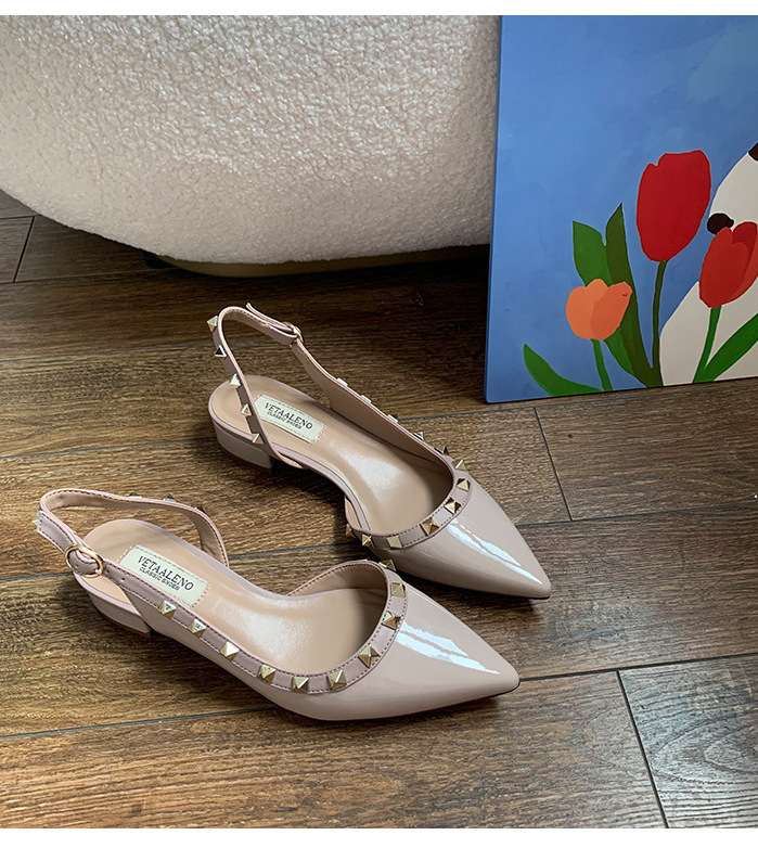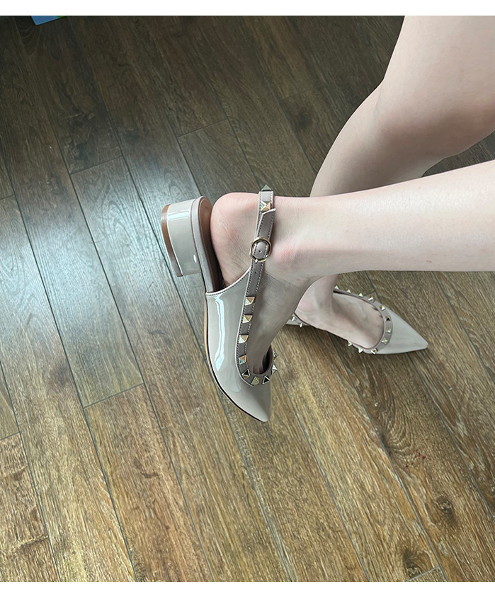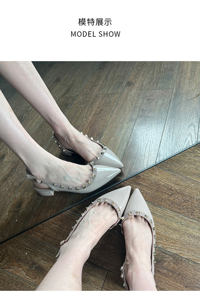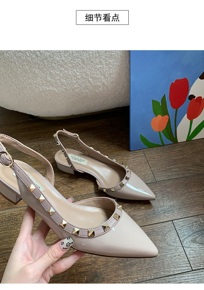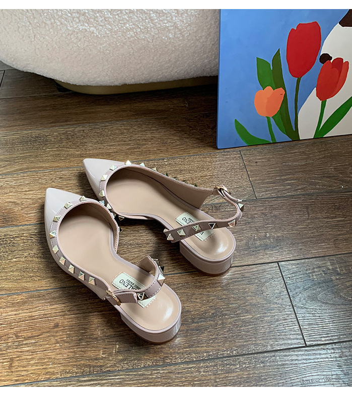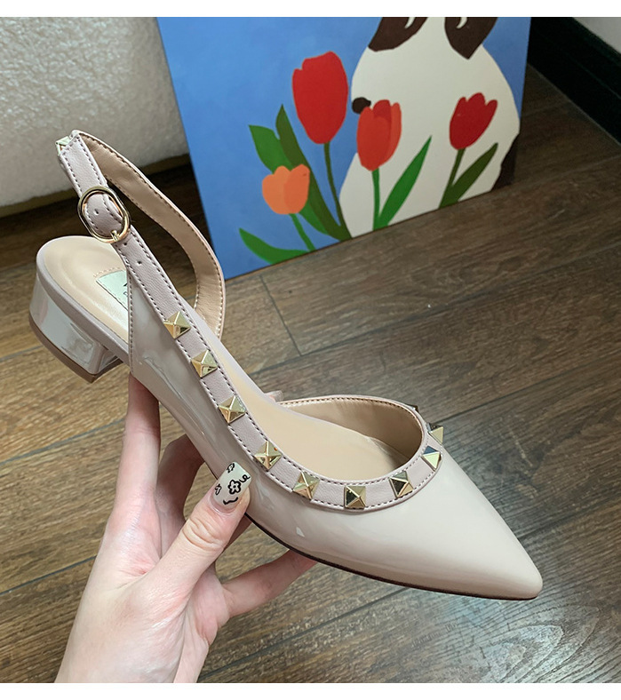 2024 새로운 스타일 리벳 중공 작은 가죽 신발 여름 스커트 착용 하이힐 샌들 여성을위한 프랑스 누드 컬러 작은 향기로운 신발스토어 가기
