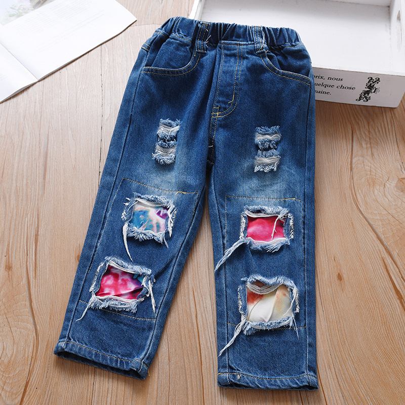 Aini Mengmeng 여자 청바지 봄과 가을 새로운 어린이 바지 서양식 찢어진 바지 아기 캐주얼 스트레이트